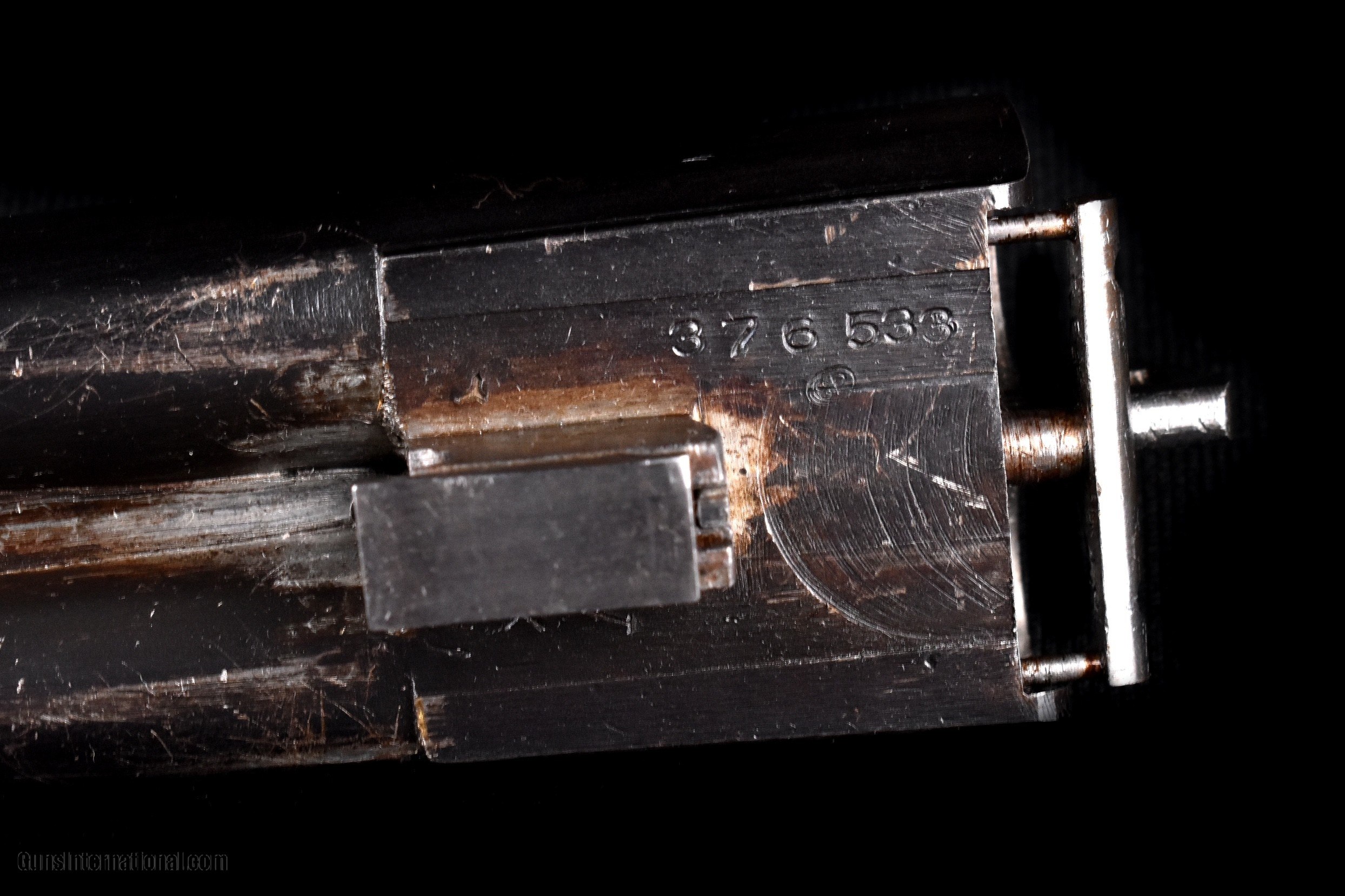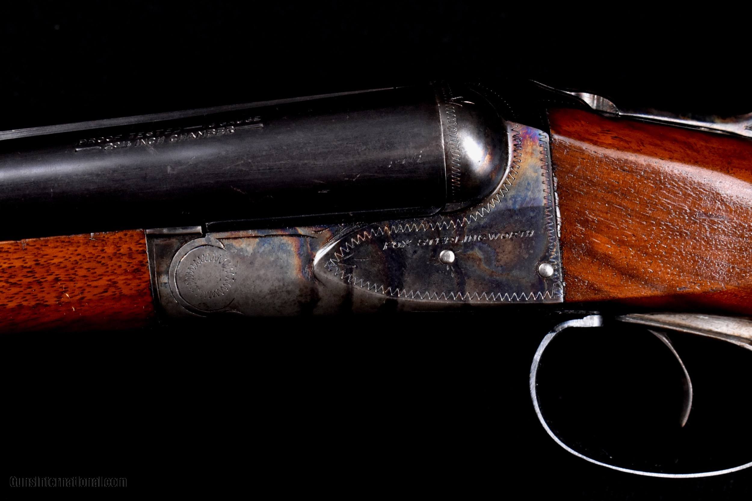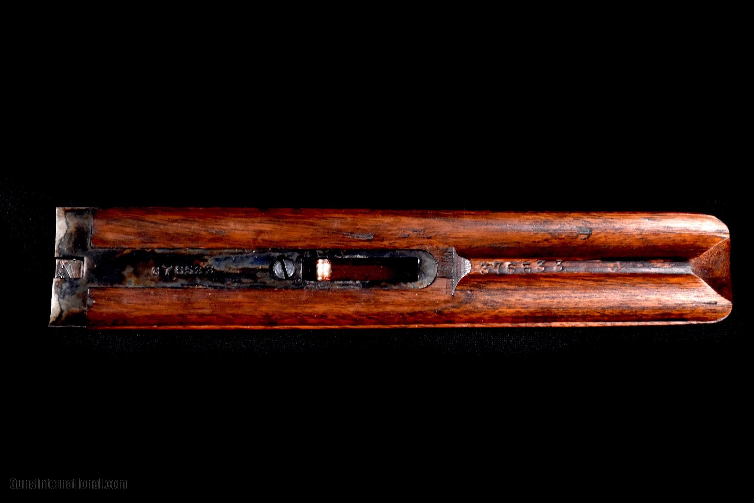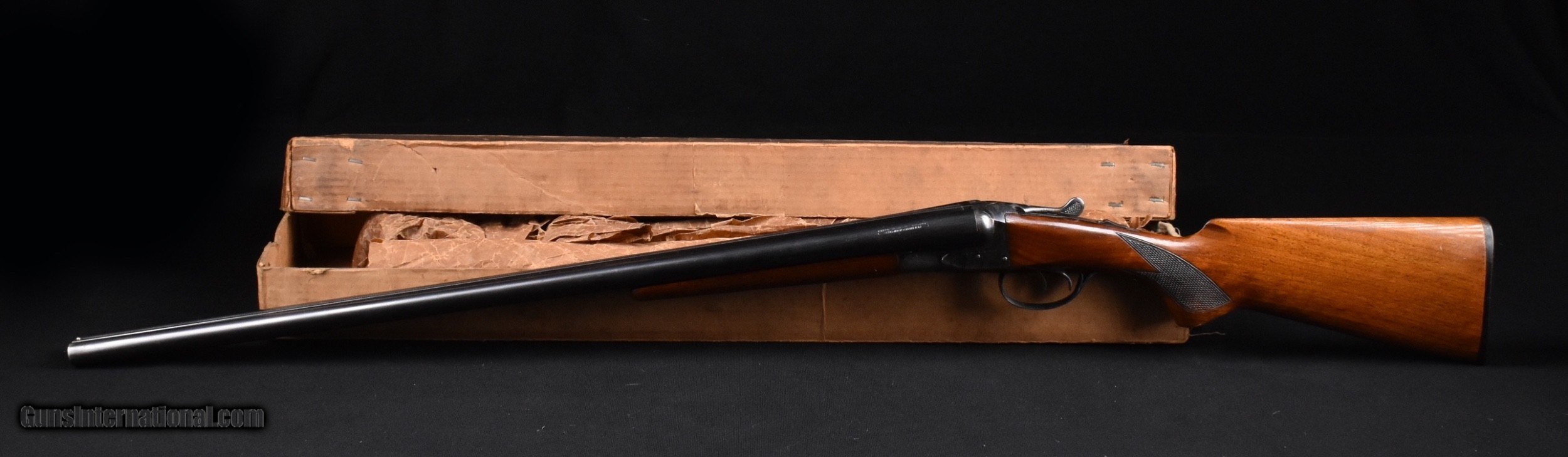 Description: Made in 1937, this little time capsule gun was made with 28" barrels, splinter forend, double triggers, extractors, full pistol grip stock and original lined buttplate. The gun has proper the later style forend and pistol grip stock along with usual Utica barrel markings. Accompanying the gun is the original shipping box with proper matching end label which is extremely rare and hard to find. The gun remains in extremely nice all original condition. Case colors, barrel blue, and stock finish are more than 95% and are totally original in every respect. There are a few minor handling marks, but the gun is absolutely stone cold original and untouched - just the way collectors like to find them! Bores are brilliant and shiny and mechanics are crisp. Gun has been fired a few times but very well taken care of. This gun is priced at $3995 plus shipping to your FFL. Please dont hesitate to contact me at (704) 280-2382 or via PM on this site with any questions or reasonable offers on this exceptional Fox! SOLD Shotgun Gauge: 16 Gauge Manufacturer: A.H. Fox Model: Sterlingworth Serial Number: 376533 Barrel Length: 28 Chambers: 2-3/4 Ejectors: Extractors Condition: Near Mint Metal Condition: Near Mint Wood Condition: Near Mint Bore Condition: Brilliant and shiny Triggers: Double Triggers Stock Comb: 1-5/8 Stock Heel: 2-7/8 Fore End: Splinter Butt Pad: Original Lined BP LOP: 14-1/4 Weight: 6lbs 8oz Manufacture Date: 1937 Choke Left: .657 with .030 choke Choke Right: .657 with .025 |