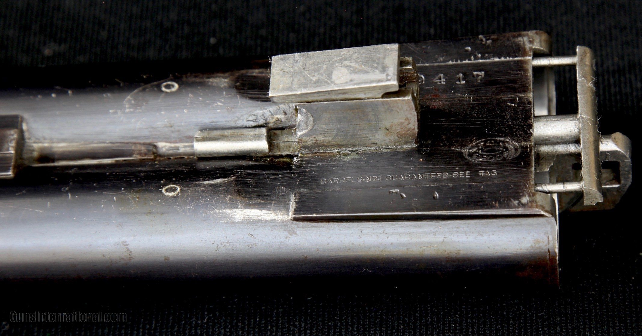 Description: Extremely rare (1 of about 60 made) HE Grade A,H. Fox made with 32" barrels that have splinter forend. The case hardened action is lightly border engraved in typical HE Grade pattern. The straight grip buttstock is nicely figured with fine fiddleback as seen in the photos, has long trigger guard tang, and terminates with a Silver's type pad. The gun remains in superb overall condition with more than 95% original barrel blue. The action retains about 60%++ original case color. Stocks have been expertly restored (not sanded) and retain nearly all of their restored finish with crisp checkering. The mechanics are perfect, gun is tight and sound, and bores are brilliant and shiny. HE Fox guns with straight stocks do not come along very often. This gun is in superb condition and very pleasing to the eye. It handles well and would make an incredible duck partner this coming season and would be well at home in any fine gun room. It is priced at $12,500 shipped and insured to your FFL. Please dont hesitate to call me at (704) 280-2382 with any questions or reasonable offers on this extremely rare Fox. SOLD Curio/Relic: Yes Shotgun Gauge: 12 Gauge Manufacturer: A.H. Fox Model: HE Serial Number: 29417 Barrel Length: 32 Chambers: 2-3/4 Ejectors: Yes Condition: Excellent Metal Condition: Excellent Wood Condition: Excellent Bore Condition: Brilliant and shiny Triggers: Double Triggers Stock Comb: 1-9/16 Stock Heel: 2-7/16 Fore End: Splinter Forend Butt Pad: Modern Silvers type LOP: 14-3/8 Weight: 9lbs 7oz Choke Left: .037 with .742 Bore Choke Right: .037 with .744 bore |