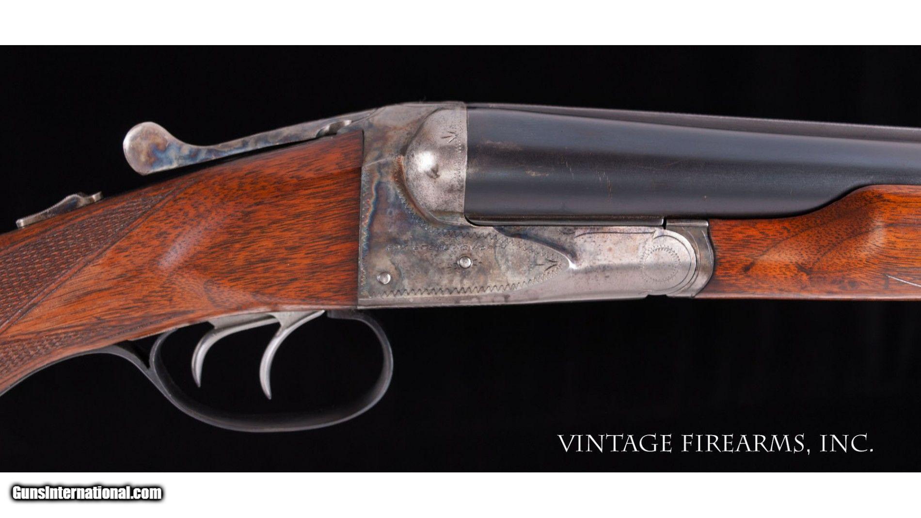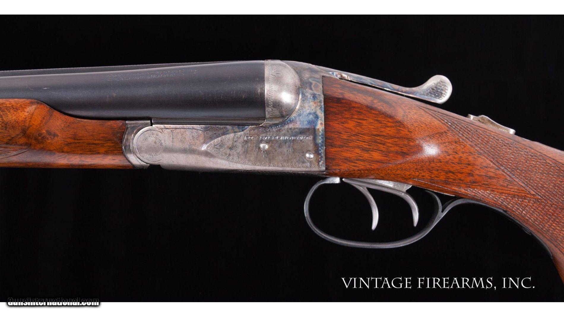 Description: Fox Sterlingworth 12 Gauge Side-by-Side RARE, HIGH FACTORY CONDITION, 1 OF 1 KNOWN, BEAVERTAIL, AFFORDABLE! General Specs: Fox, Year 1938, 12 Gauge, 7lbs 9oz, SxS Serial Number: 133567 O.K. Fox lovers, do I have your attention? “What do we have here?” you likely wonder. Here we have a factory original, unaltered in any way, high condition Fox 12 bore that is 1 of about 200 in its category, 1 of 3 found with ejectors, and the only one known to exist with ejectors, and factory beavertail forend. This gun was part of a feature article in the Double Gun Journal, Winter of 2014, beginning page 129, written by well-known Fox Guru Frank Srebro. The gun is discussed and photographed at length, making the documentation clear as can be. This fine Fox is a Sterlingworth Drawbolt gun, serial number 133567 built in 1938, shipped with ejectors, factory beavertail, and capped pistol grip. Those Fox enthusiasts not versed in the term “Drawbolt” Fox may be let down finding this to be a “lowly Sterlingworth”, but anyone considering themselves a collector and shooter of Fox guns should take note. If you have the Double Gun Journal, read the article, as it is highly informative. If you don’t subscribe to the Double Gun Journal (you should!), I will provide a copy of the Journal to the purchaser of the gun. Drawbolt Fox guns were the first to see an improvement of the Ansley H. Fox design from 1906, and eliminated one of the only weaknesses of the original design, a thin spot on the top left side of the buttstock where it meets the action. Drawbolt guns were prototype in nature, and due to WWII, never saw production or advertisement as a new innovation to the Fox design. As collectible Fox guns go, every collector of A.H. Fox guns should strive to have at least one example of this 1938 innovative Sterlingworth in their collection, and this one has the condition and features that would make it the best-known example of the new Fox drawbolt design. Fox shooter/collectors should want this gun as it has the desirable and near-impossible-to-find features of ejectors, factory beavertail forend, and high condition with good shooting dimensions. THIS IS A “VFI CERTIFIED” GUN WITH A 90 DAY MECHANICAL WARRANTY. VFI CERTIFIED guns have had the forend/ejector mechanism and the action stripped, cleaned, inspected, and lubricated, a $275 service. Mechanically perfect in every way, perfect mirror bores, tight as new on face and hinge pin, and a truly unique Fox 12 bore, it is offered at a price that nearly all can afford and should be a centerpiece for discussion and admiration amongst Fox collectors and shooters alike. This is a true investment quality Fox, one sure to grow in value as you enjoy its use. Thanks for looking. Barrels Barrel Length: 30" Chokes: .023/.033 M/F Bores: perfect mirror Bore Diameter: .730 both Wall Thickness: .033/.028 % Blue: 98% factory Chambers: 2 3/4" factory Ribs: tight Sights: single silver Action Action: tight, right of center Ejectors or Extractors: ejectors, strong, timed Case Color: 85% factory Screws: excellent Engraving: sharp, clear Trigger Type: double Trigger Guard Color: 99% reblued Stock Type: capped pistol grip/beavertail factory; rare LOP: 14" LOP To End Of Wood: 13 13/16" DAH: 2 7/8" DAC: 1 9/16" Cast: 1/4" off Checkering Condition: excellent, Factory Butt Treatment: factory plate There are more photos upon request. We offer a 30 day mechanical warranty on this fine shotgun. Call us for full details. PLEASE SEE MY OTHER FINE VINTAGE FIREARMS. Just open one of my ads and click on the line that says “see all items from this seller” and a very nice list of fine sporting and collectible arms will appear. I have many more fine sxs shotguns not yet listed. Thanks for looking! We employ a full time gunsmith on premises and can perform alterations to suit your needs within a few weeks of purchase. Payment Methods: Money Order, Certified Check, Personal Check, Wire Transfer Inspection Period / Return Policy: Three Days from the date the item was received. Sales Tax: 6% Michigan Only Shipping & Insurance: Ground $45.00 We ship internationally! Item Condition: Used Requires FFL?: Yes If you have any questions about this item or payment, please email or call us directly, at #616-292-6240. Thanks! Vintage Firearms Inc We employ a full time gunsmith on premises and can perform alterations to suit your needs within a few weeks of purchase. Common requests are: -stock bending to suit your particular requirements -addition of any specified butt pad to increase length of pull -alteration of chokes to suit your shooting preferences -lengthening of chambers and forcing cones -darkening stock color with penetrating stains -restoring any part of the gun including rust blue, charcoal blue, bone and charcoal case color, wood restoration and checkering recuts. If you like one our guns but it needs "tweaked", let us know and we can quote you a time and price. Some enthusiasts like the guns "as found" and others want them "just so". We often list guns as found and let the particular buyer choose how they want their gun to fit or look. SOLD Curio/Relic: Yes |