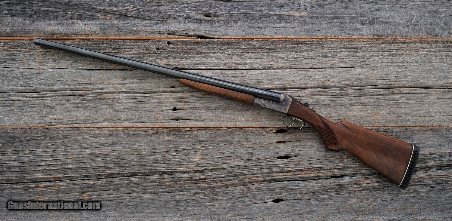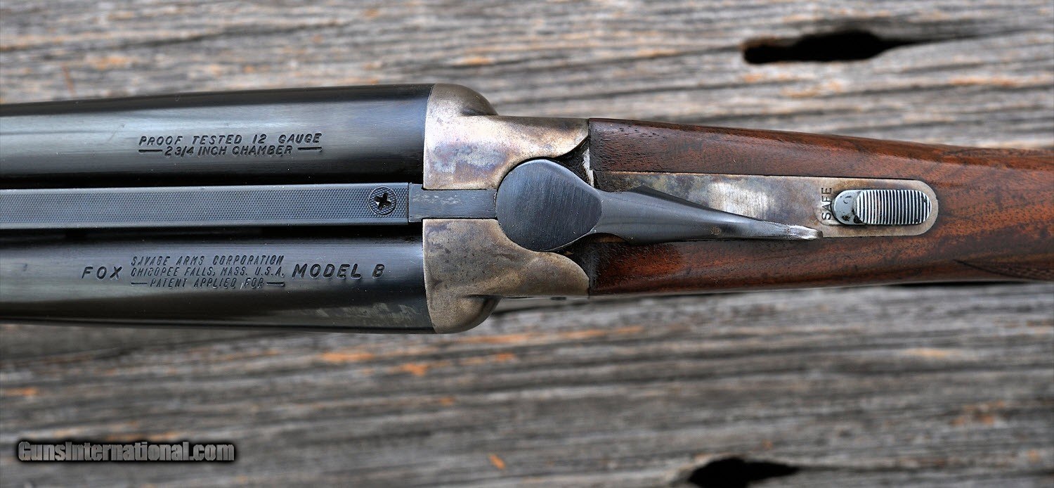 Description: Fox - B - 12 ga - Item Number: FOXNSN20 Shotgun type: SxS Action: Boxlock Ejectors: No Trigger: Double Grip: Pistol Grip Forend: Checkered Lop: 14 1/8 " Pad thickness: 1 " Type of butt: White Line Pad Drop comb: 1 1/2 " Drop heel: 2 1/2 " Cast amount: 0 " Weight: 8 lbs, oz Manufactured in: USA Finish: Case Colored Overall condition: Good Stock condition: Good Metal condition: Good Stock: Original finish Metal: Original finish Type of Case: none Extra barrels: 0 Barrel info: Gauge: 12 ga Chamber: 2 3/4 " Length: 30 " Chokes: IM/XF Rib type: Flat File Cut Comments : Gun is solid with some light handling marks. SG-96 SOLD |