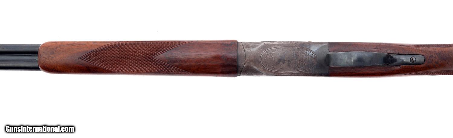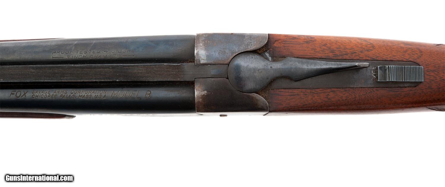 Description: Fox - B - 410 ga - Item Number: FOX249-05-0567 Shotgun type: SxS Action: Boxlock Ejectors: No Trigger: Double Grip: Pistol Grip Forend: Checkered Lop: 14 3/8 " Pad thickness: " Type of butt: Factory Drop comb: 1 1/2 " Drop heel: 2 7/8 " Cast amount: 3/16 " Cast: ON Weight: 6 lbs, 12 oz Manufactured in: USA Manufacture Year: Finish: Blue Overall condition: Fair Stock condition: Fair Metal condition: Fair Stock: Original finish Metal: Original finish Extra barrels: 0 Barrel info: Gauge: 410 BORE Chamber: 3 " Length: 26 " Chokes: F/XF Rib type: File Cut Raised Solid Rib Comments : Solid gun showing some moderate wear. SG-324 SOLD |