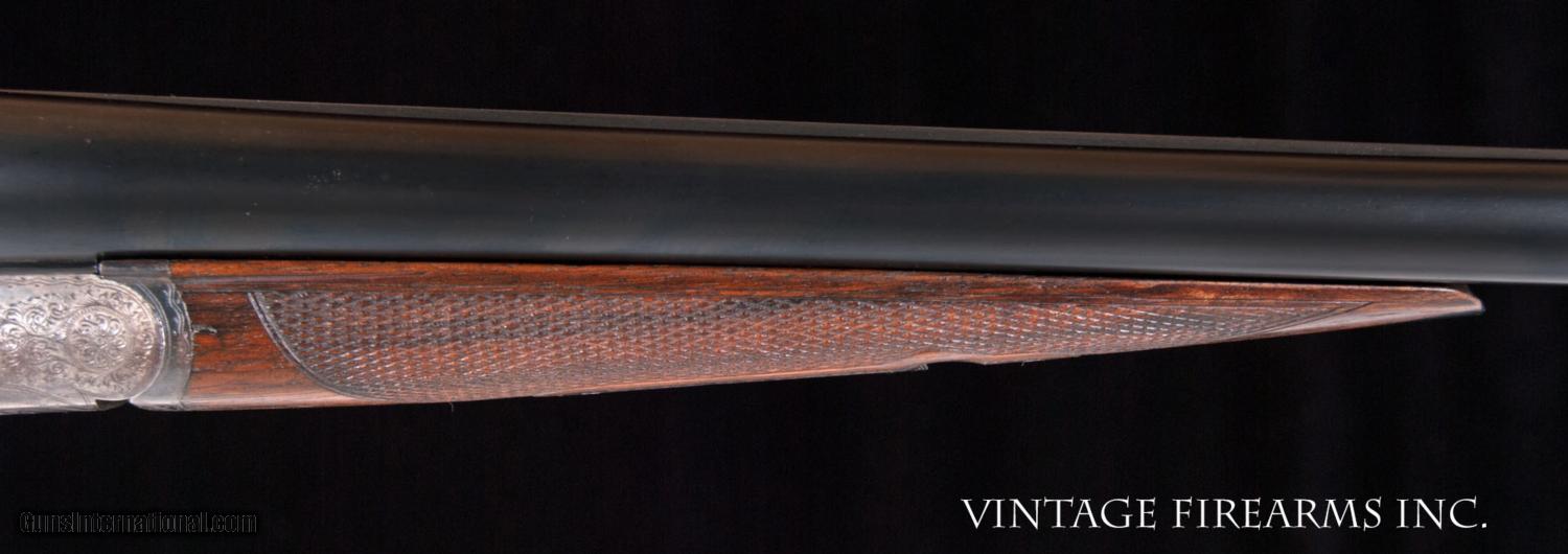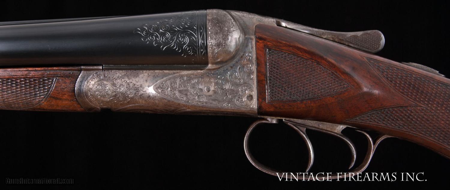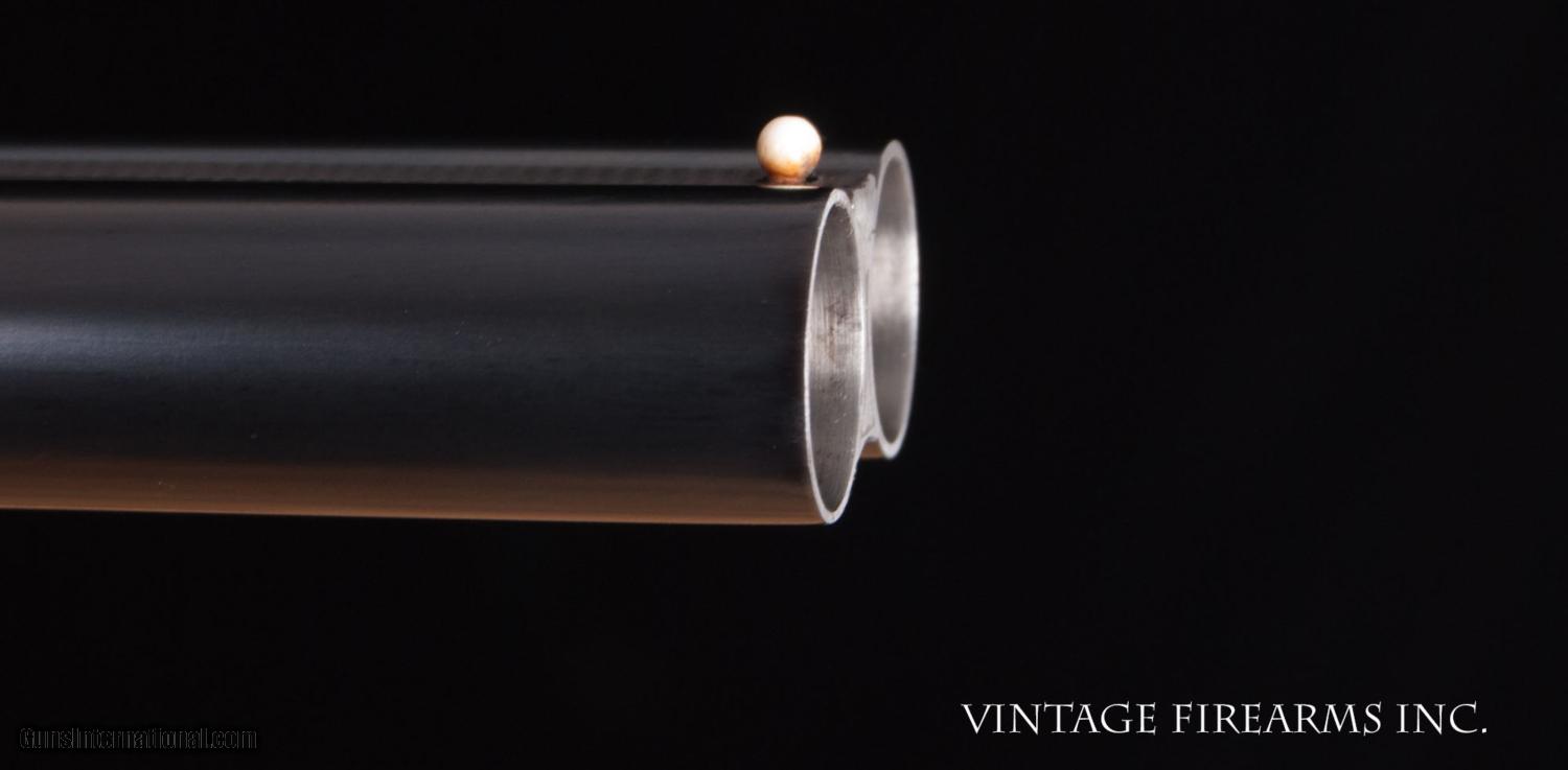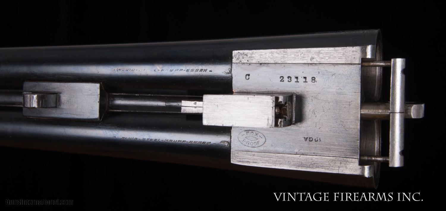 Description: Fox CE 12 Gauge SxS Shotgun LIGHT WEIGHT #4 BARRELS, 28", GREAT DIMENSION General Specs: Fox, Year 1916, 12 Gauge, 6lbs 12oz, Side by Side Serial Number: 23118 The A.H. Fox C Grade is adorned with nicely figured wood, finely checkered including the side panels at the head of the stock, and some of the nicest scroll and game scene engraving observed on any vintage American double. It is a classy and elegant double gun. This gun, sn 23118, is a Philly Fox built in 1916 when really nice guns were being made. Like most all Fox guns, it is a delight in hand, balanced on the hinge pin and weighing in at a svelte 6lbs. 11oz. The recently deceased author and noted double gun expert Michael McIntosh brought the Fox gun to the forefront of the collector/shooter’s world with the book “A.H. Fox, ‘The Finest Gun in the World’”. McIntosh seemed to agree with Ansley H. Fox that the action on the Fox shotgun was likely the best box lock action on the planet in its simplicity, diminutive size, and perfect proportions. Fox shotguns are highly sought after and have appreciated in value significantly in the past several years. Finding any vintage American side by side that weighs under 6 3/4lbs. is a needle in a haystack, especially with 28" barrels. This is a wonderful, honest Fox for your 12ga. hunting and clay target needs and will be a wise investment that will earn you money while you enjoy its use. This gun matches the factory order card precisely (see photo of card) except no mention of pad. Barrels, chokes, weight, LOP, drop at heel all match the way it was shipped. You see a fair number of CE Fox 12ga. guns for sale, but a scant few with this combination of weight, balance, shooting dimensions, and 28" barrels. The engraving is very nice and superior. What a nice gun to carry for pheasants, upland game, or shooting a few clays. RSTshells has spreader loads that work exceptionally well at making this an IC/M gun without altering it. Don't miss this one! Barrels Barrel Length: 28" Krupp #4 weight Chokes: .023/.035 m/f Bores: excellent Bore Diameter: .730/.730 Wall Thickness: .020/.023 % Blue: 100% Chambers: 2 5/8" Ribs: tight Sights: Double Ivory Action Action: tight, way right of center Ejectors or Extractors: ejectors, strong, timed Case Color: 60% factory Screws: perfect Engraving: clear sharp Trigger Type: double, crisp Trigger Guard Color: 20% blue Stock Type: half round pistol grip/ splinter forend LOP: 14 1/8" LOP To End Of Wood: 13 1/8" DAH: 2 5/8" DAC: 1 9/16" Cast: 0 Checkering Condition: excellent Butt Treatment: silver's pad There are more photos upon request. We offer a 30 day mechanical warranty on this fine shotgun. Call us for full details. PLEASE SEE MY OTHER FINE VINTAGE FIREARMS. Just open one of my ads and click on the line that says “see all items from this seller” and a very nice list of fine sporting and collectible arms will appear. I have many more fine sxs shotguns not yet listed. Thanks for looking! We employ a full time gunsmith on premises and can perform alterations to suit your needs within a few weeks of purchase. Payment Methods: Money Order, Certified Check, Personal Check, Wire Transfer Inspection Period / Return Policy: Three Days from the date the item was received. Sales Tax: 6% Michigan Only Shipping & Insurance: Ground $55.00 We ship internationally! Item Condition: Used Requires FFL?: Yes If you have any questions about this item or payment, please email or call us direcctly, at #616-292-6240. Thanks! Jay Shachter, Vintage Firearms, Inc SOLD Curio/Relic: Yes |