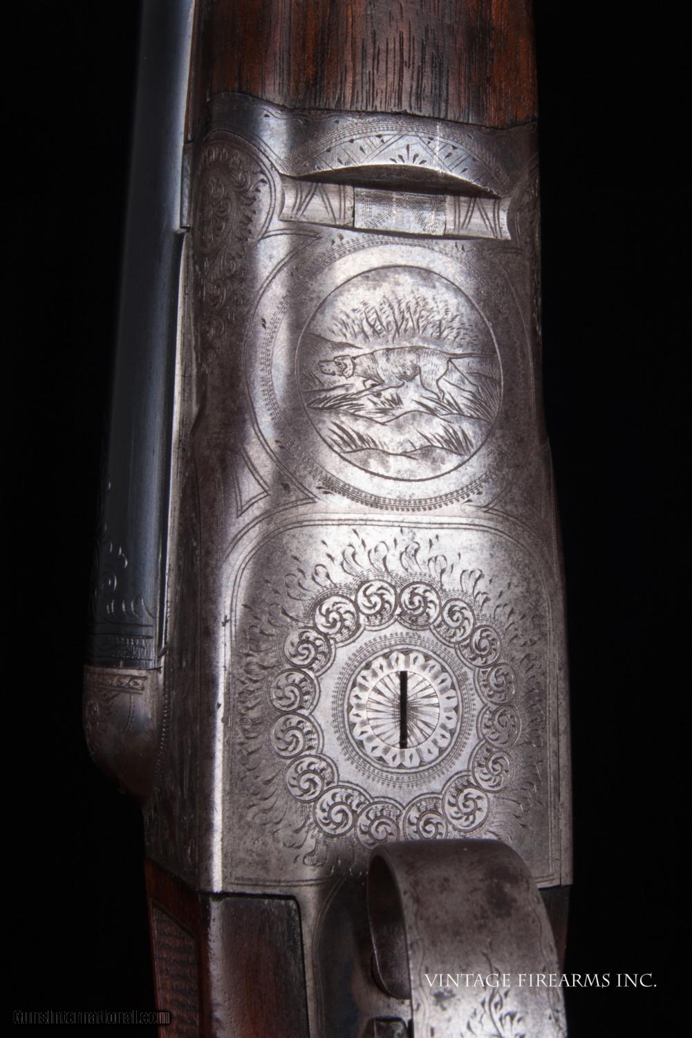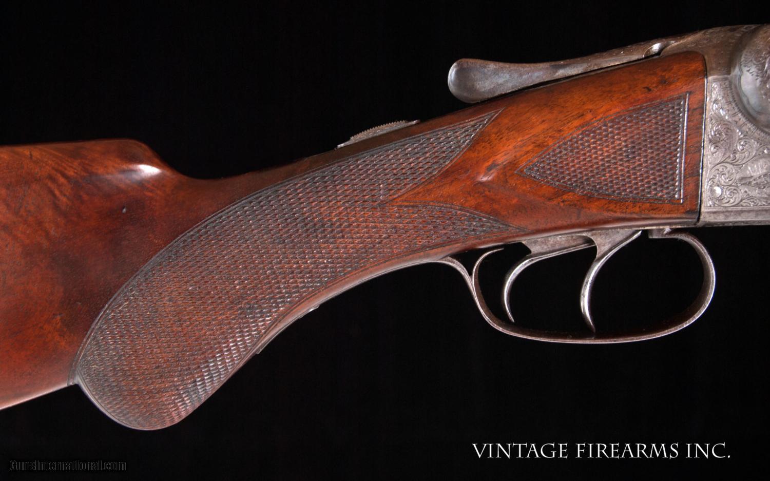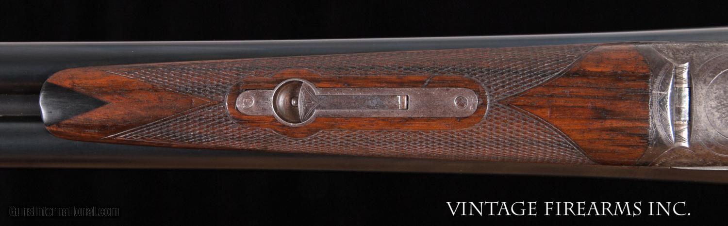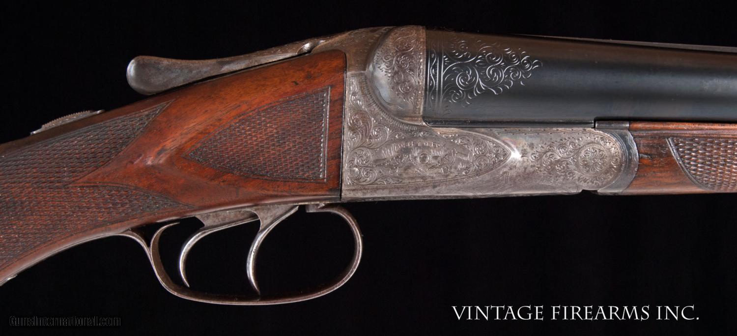 Description: Fox CE 12 Gauge SxS Shotgun LIGHT WEIGHT #4 BARRELS, 28", GREAT DIMENSION General Specs: Fox, Year 1916, 12 Gauge, 6lbs 12oz, Side by Side Serial Number: 23118 The A.H. Fox C Grade is adorned with nicely figured wood, finely checkered including the side panels at the head of the stock, and some of the nicest scroll and game scene engraving observed on any vintage American double. It is a classy and elegant double gun. This gun, sn 23118, is a Philly Fox built in 1916 when really nice guns were being made. Like most all Fox guns, it is a delight in hand, balanced on the hinge pin and weighing in at a svelte 6lbs. 11oz. The recently deceased author and noted double gun expert Michael McIntosh brought the Fox gun to the forefront of the collector/shooter’s world with the book “A.H. Fox, ‘The Finest Gun in the World’”. McIntosh seemed to agree with Ansley H. Fox that the action on the Fox shotgun was likely the best box lock action on the planet in its simplicity, diminutive size, and perfect proportions. Fox shotguns are highly sought after and have appreciated in value significantly in the past several years. Finding any vintage American side by side that weighs under 6 3/4lbs. is a needle in a haystack, especially with 28" barrels. This is a wonderful, honest Fox for your 12ga. hunting and clay target needs and will be a wise investment that will earn you money while you enjoy its use. This gun matches the factory order card precisely (see photo of card) except no mention of pad. Barrels, chokes, weight, LOP, drop at heel all match the way it was shipped. You see a fair number of CE Fox 12ga. guns for sale, but a scant few with this combination of weight, balance, shooting dimensions, and 28" barrels. The engraving is very nice and superior. What a nice gun to carry for pheasants, upland game, or shooting a few clays. RSTshells has spreader loads that work exceptionally well at making this an IC/M gun without altering it. Don't miss this one! Barrels Barrel Length: 28" Krupp #4 weight Chokes: .023/.035 m/f Bores: excellent Bore Diameter: .730/.730 Wall Thickness: .020/.023 % Blue: 100% Chambers: 2 5/8" Ribs: tight Sights: Double Ivory Action Action: tight, way right of center Ejectors or Extractors: ejectors, strong, timed Case Color: 60% factory Screws: perfect Engraving: clear sharp Trigger Type: double, crisp Trigger Guard Color: 20% blue Stock Type: half round pistol grip/ splinter forend LOP: 14 1/8" LOP To End Of Wood: 13 1/8" DAH: 2 5/8" DAC: 1 9/16" Cast: 0 Checkering Condition: excellent Butt Treatment: silver's pad There are more photos upon request. We offer a 30 day mechanical warranty on this fine shotgun. Call us for full details. PLEASE SEE MY OTHER FINE VINTAGE FIREARMS. Just open one of my ads and click on the line that says “see all items from this seller” and a very nice list of fine sporting and collectible arms will appear. I have many more fine sxs shotguns not yet listed. Thanks for looking! We employ a full time gunsmith on premises and can perform alterations to suit your needs within a few weeks of purchase. Payment Methods: Money Order, Certified Check, Personal Check, Wire Transfer Inspection Period / Return Policy: Three Days from the date the item was received. Sales Tax: 6% Michigan Only Shipping & Insurance: Ground $55.00 We ship internationally! Item Condition: Used Requires FFL?: Yes If you have any questions about this item or payment, please email or call us direcctly, at #616-292-6240. Thanks! Jay Shachter, Vintage Firearms, Inc SOLD Curio/Relic: Yes |