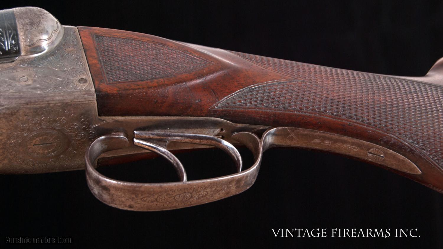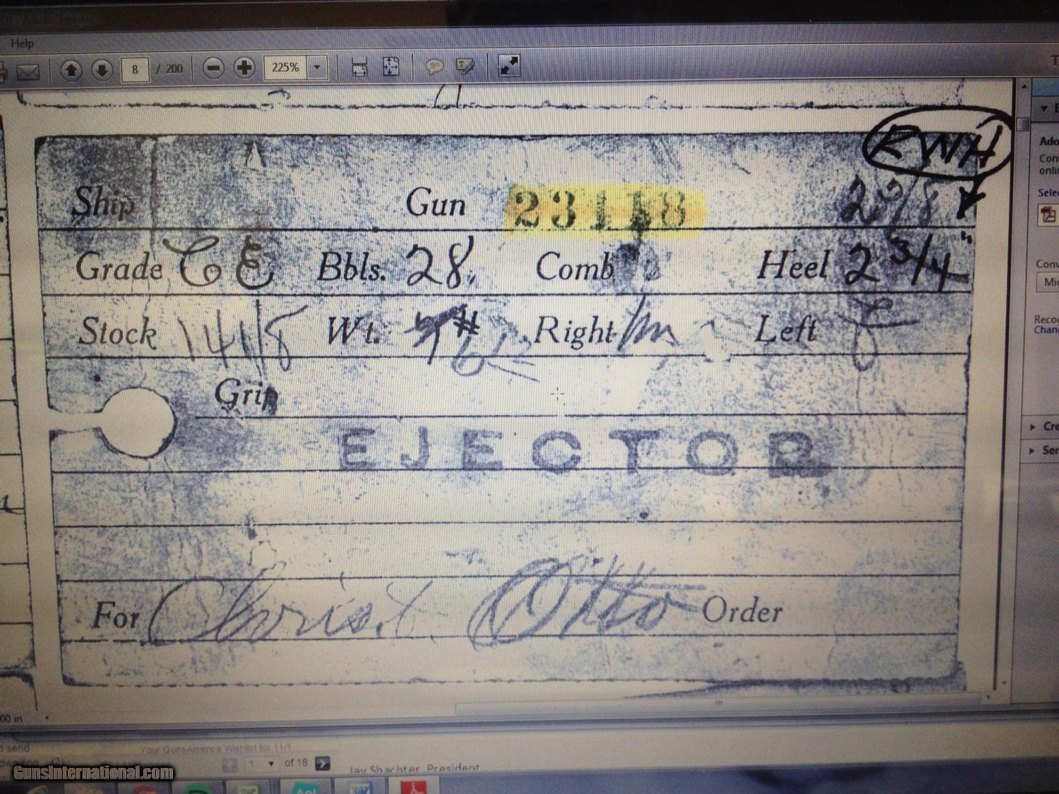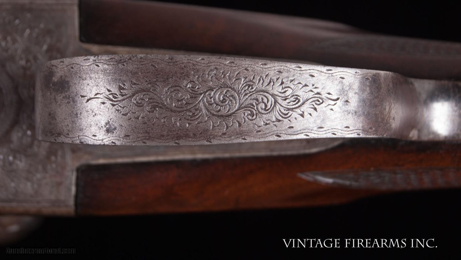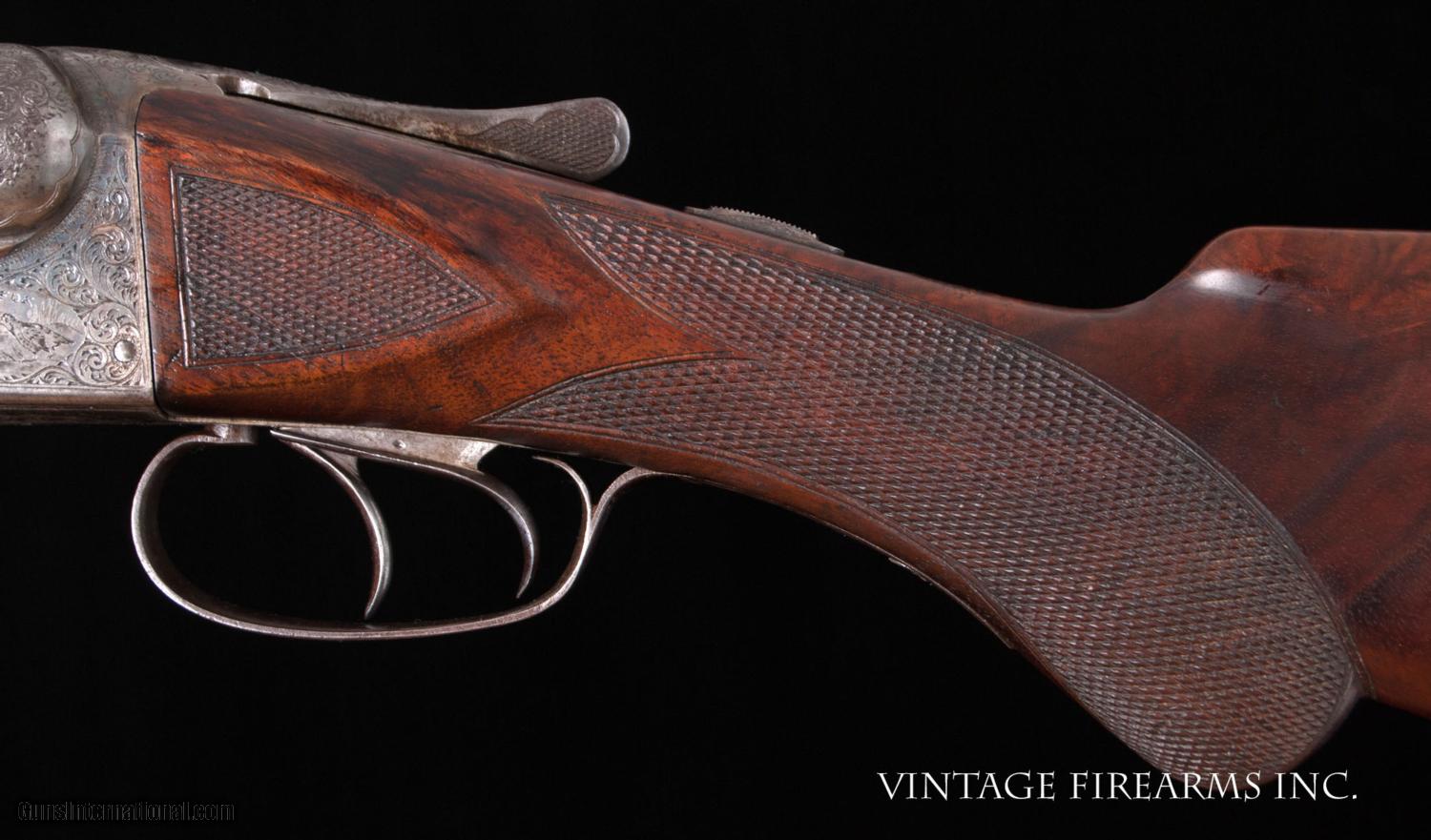 Description: Fox CE 12 Gauge SxS Shotgun LIGHT WEIGHT #4 BARRELS, 28", GREAT DIMENSION General Specs: Fox, Year 1916, 12 Gauge, 6lbs 12oz, Side by Side Serial Number: 23118 The A.H. Fox C Grade is adorned with nicely figured wood, finely checkered including the side panels at the head of the stock, and some of the nicest scroll and game scene engraving observed on any vintage American double. It is a classy and elegant double gun. This gun, sn 23118, is a Philly Fox built in 1916 when really nice guns were being made. Like most all Fox guns, it is a delight in hand, balanced on the hinge pin and weighing in at a svelte 6lbs. 11oz. The recently deceased author and noted double gun expert Michael McIntosh brought the Fox gun to the forefront of the collector/shooter’s world with the book “A.H. Fox, ‘The Finest Gun in the World’”. McIntosh seemed to agree with Ansley H. Fox that the action on the Fox shotgun was likely the best box lock action on the planet in its simplicity, diminutive size, and perfect proportions. Fox shotguns are highly sought after and have appreciated in value significantly in the past several years. Finding any vintage American side by side that weighs under 6 3/4lbs. is a needle in a haystack, especially with 28" barrels. This is a wonderful, honest Fox for your 12ga. hunting and clay target needs and will be a wise investment that will earn you money while you enjoy its use. This gun matches the factory order card precisely (see photo of card) except no mention of pad. Barrels, chokes, weight, LOP, drop at heel all match the way it was shipped. You see a fair number of CE Fox 12ga. guns for sale, but a scant few with this combination of weight, balance, shooting dimensions, and 28" barrels. The engraving is very nice and superior. What a nice gun to carry for pheasants, upland game, or shooting a few clays. RSTshells has spreader loads that work exceptionally well at making this an IC/M gun without altering it. Don't miss this one! Barrels Barrel Length: 28" Krupp #4 weight Chokes: .023/.035 m/f Bores: excellent Bore Diameter: .730/.730 Wall Thickness: .020/.023 % Blue: 100% Chambers: 2 5/8" Ribs: tight Sights: Double Ivory Action Action: tight, way right of center Ejectors or Extractors: ejectors, strong, timed Case Color: 60% factory Screws: perfect Engraving: clear sharp Trigger Type: double, crisp Trigger Guard Color: 20% blue Stock Type: half round pistol grip/ splinter forend LOP: 14 1/8" LOP To End Of Wood: 13 1/8" DAH: 2 5/8" DAC: 1 9/16" Cast: 0 Checkering Condition: excellent Butt Treatment: silver's pad There are more photos upon request. We offer a 30 day mechanical warranty on this fine shotgun. Call us for full details. PLEASE SEE MY OTHER FINE VINTAGE FIREARMS. Just open one of my ads and click on the line that says “see all items from this seller” and a very nice list of fine sporting and collectible arms will appear. I have many more fine sxs shotguns not yet listed. Thanks for looking! We employ a full time gunsmith on premises and can perform alterations to suit your needs within a few weeks of purchase. Payment Methods: Money Order, Certified Check, Personal Check, Wire Transfer Inspection Period / Return Policy: Three Days from the date the item was received. Sales Tax: 6% Michigan Only Shipping & Insurance: Ground $55.00 We ship internationally! Item Condition: Used Requires FFL?: Yes If you have any questions about this item or payment, please email or call us direcctly, at #616-292-6240. Thanks! Jay Shachter, Vintage Firearms, Inc SOLD Curio/Relic: Yes |