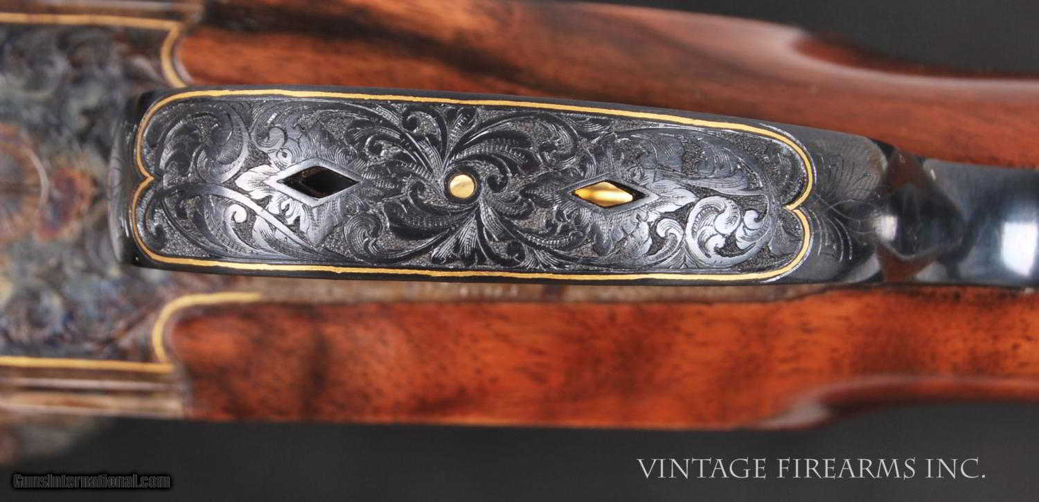 Description: FOX FE EXHIBITION .410 & 28 GAUGE SET AS NEW, FANTASTIC! General Specs: CSMC Fox, Year 2002/2003, .410 & 28 Gauge, .410=6lbs 1oz ; 28=5lbs 8oz, Side by Side Serial Number: F205829 Tony Galazan has produced many masterpieces in his Connecticut Shotgun Manufacturing facility. His faithful reproduction of Ansley H. Fox’s fine shotguns are no exception, and his “EXHIBITION” quality renditions far exceed anything old Ansley H. Fox ever contemplated. With over-the-top engraving and gold inlays, masterful wood carvings and checkering patterns, and state-of-the-art materials, Galazan has brought us TRUE ART IN WORKING PLATFORMS. Shown here is a 2 gauge custom set ordered in 2002 and delivered in 2003. The .410/28ga. set snF205829. The special features list is impressive; actions are engraved in Italy at the Casarini house by W. Patelli, a world renowned master engraver...even the water table and back side of the forend irons are engraved! The frame is finely sculpted with bolsters on the bottom, beaded fences, fancy back scalloped frame, rebated to retain head of stock, gold wire inlays throughout the action, deeply carved and shaded bank note style scroll, very detailed gold inlaid ducks, grouse, and woodcock, pierced top lever and trigger guard, 100% gorgeous case color..simply stunning in every way. Both sets of barrels have detailed birds and game scenes engraved at the breech, with a ring of engraving with scroll at the muzzles, fancy gold wire inlaid to accent it all. Study the photos on our and you will be amazed at the depth and quality of the engraving. The wood carvings follow the theme of the engraving, on beautiful European marbled walnut. These Fox guns are made to shoot, for those so inclined, as the range of chokes and gauges will cover woodcock in the thick, to the gentleman's bobwhite and dove, to the quail and partridge species of the West, any game you should choose to pursue, including some challenging clay targets. The small gauge barrels are all 28" long. The .410 bore gun is the heaviest at 6lbs. 1oz. and the 28ga is 5 1/2lbs. Of course, to order a set similar from CSMC today would cost tens of thousands more than our asking price, and the set is as new in the maker's case. This is an investment quality example of gun maker's art, a true collector's set representing the finest in American gun making. This .410/28ga set is a match to another 20/16 set we have for sale. You can buy them both if you want an amazing 4 gauge set! Thanks for looking. Barrels Barrel Length: 28" both Chokes: 410=.003/.011 SK/M;28=.004/.007 SK/IC Bores: mirror both Bore Diameter: 410=.416/.415;28=.551 both Wall Thickness: 28=.030/.025 % Blue: 100% Chambers: 3", 2 3/4" Ribs: tight both Sights: double, ivory Action Action: new, way right of center Ejectors or Extractors: ejectors, strong, timed Case Color: 100% Screws: perfect Engraving: Italy, W. Patelli; Casarini house; Trigger Type: double, fine, crisp Trigger Guard Color: pierced, gold, 100% Stock Type: English stock/schnable forend; figured; carved LOP: 14 1/2" LOP To End Of Wood: same DAH: 2 1/2" DAC: 1 1/2" Cast: 1/8" off Checkering Condition: carved, flor de lis; Butt Treatment: checkered butt There are more photos upon request. We offer a 30 day mechanical warranty on this fine shotgun. Call us for full details. PLEASE SEE MY OTHER FINE VINTAGE FIREARMS. Just open one of my ads and click on the line that says “see all items from this seller” and a very nice list of fine sporting and collectible arms will appear. I have many more fine sxs shotguns not yet listed. Thanks for looking! We employ a full time gunsmith on premises and can perform alterations to suit your needs within a few weeks of purchase. Payment Methods: Money Order, Certified Check, Personal Check, Wire Transfer Inspection Period / Return Policy: Three Days from the date the item was received. Sales Tax: 6% Michigan Only Shipping & Insurance: Ground $250.00 We ship internationally! Item Condition: Used Requires FFL?: Yes If you have any questions about this item or payment, please email or call us directly, at #616-292-6240. Thanks! Jay Shachter, Vintage Firearms Inc SOLD |