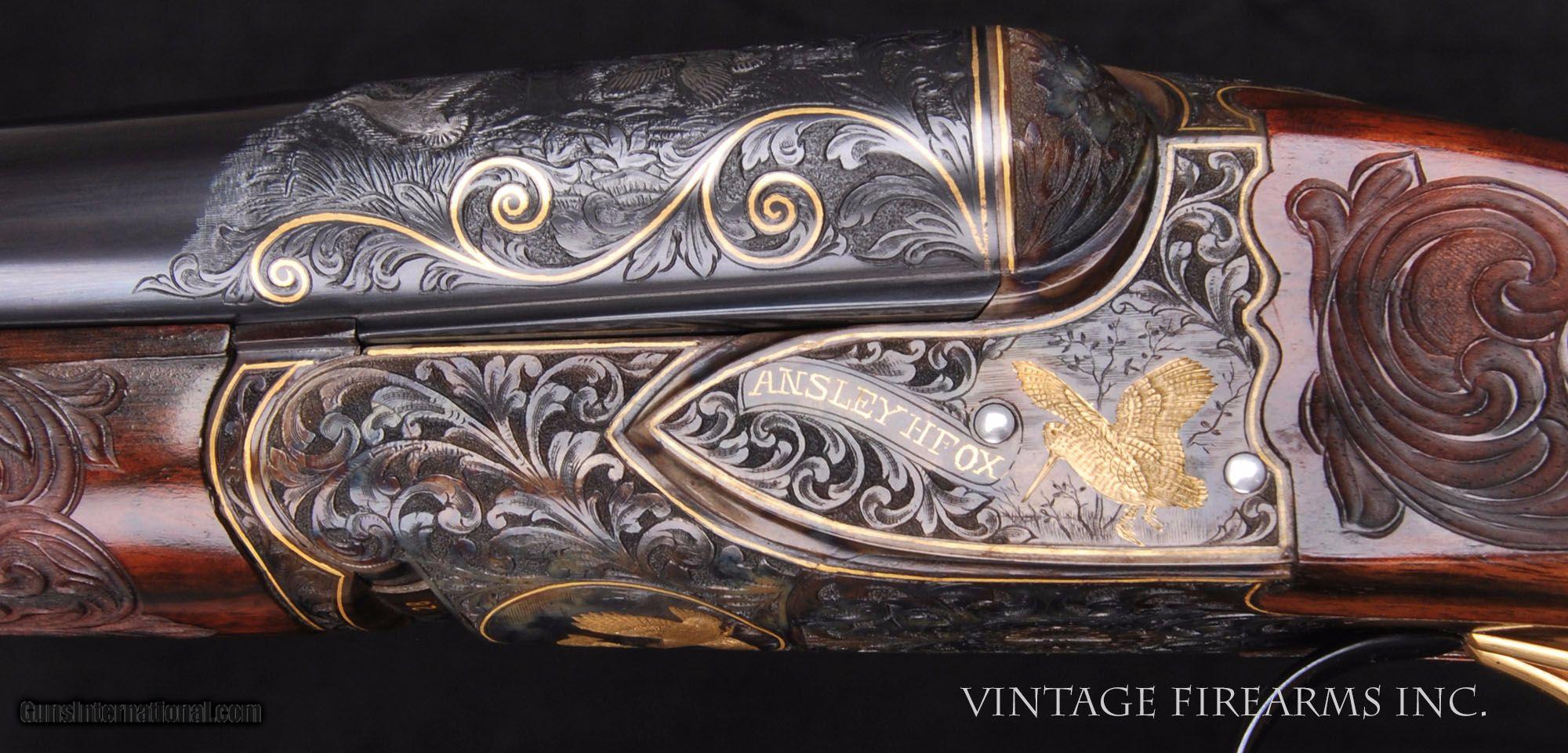 Description: FOX FE EXHIBITION .410 & 28 GAUGE SET **REDUCED PRICE** AS NEW, FANTASTIC! General Specs: CSMC Fox, Year 2002/2003, .410 & 28 Gauge, .410=6lbs 1oz ; 28=5lbs 8oz, Side by Side Serial Number: F205829 Tony Galazan has produced many masterpieces in his Connecticut Shotgun Manufacturing facility. His faithful reproduction of Ansley H. Fox’s fine shotguns are no exception, and his “EXHIBITION” quality renditions far exceed anything old Ansley H. Fox ever contemplated. With over-the-top engraving and gold inlays, masterful wood carvings and checkering patterns, and state-of-the-art materials, Galazan has brought us TRUE ART IN WORKING PLATFORMS. Shown here is a 2 gauge custom set ordered in 2002 and delivered in 2003. The .410/28ga. set snF205829. The special features list is impressive; actions are engraved in Italy at the Casarini house by W. Patelli, a world renowned master engraver...even the water table and back side of the forend irons are engraved! The frame is finely sculpted with bolsters on the bottom, beaded fences, fancy back scalloped frame, rebated to retain head of stock, gold wire inlays throughout the action, deeply carved and shaded bank note style scroll, very detailed gold inlaid ducks, grouse, and woodcock, pierced top lever and trigger guard, 100% gorgeous case color..simply stunning in every way. Both sets of barrels have detailed birds and game scenes engraved at the breech, with a ring of engraving with scroll at the muzzles, fancy gold wire inlaid to accent it all. Study the photos on our and you will be amazed at the depth and quality of the engraving. The wood carvings follow the theme of the engraving, on beautiful European marbled walnut. These Fox guns are made to shoot, for those so inclined, as the range of chokes and gauges will cover woodcock in the thick, to the gentleman's bobwhite and dove, to the quail and partridge species of the West, any game you should choose to pursue, including some challenging clay targets. The small gauge barrels are all 28" long. The .410 bore gun is the heaviest at 6lbs. 1oz. and the 28ga is 5 1/2lbs. Of course, to order a set similar from CSMC today would cost tens of thousands more than our asking price, and the set is as new in the maker's case. This is an investment quality example of gun maker's art, a true collector's set representing the finest in American gun making. This .410/28ga set is a match to another 20/16 set we have for sale. You can buy them both if you want an amazing 4 gauge set! Thanks for looking. Barrels Barrel Length: 28" both Chokes: 410=.003/.011 SK/M;28=.004/.007 SK/IC Bores: mirror both Bore Diameter: 410=.416/.415;28=.551 both Wall Thickness: 28=.030/.025 % Blue: 100% Chambers: 3", 2 3/4" Ribs: tight both Sights: double, ivory Action Action: new, way right of center Ejectors or Extractors: ejectors, strong, timed Case Color: 100% Screws: perfect Engraving: Italy, W. Patelli; Casarini house; Trigger Type: double, fine, crisp Trigger Guard Color: pierced, gold, 100% Stock Type: English stock/schnable forend; figured; carved LOP: 14 1/2" LOP To End Of Wood: same DAH: 2 1/2" DAC: 1 1/2" Cast: 1/8" off Checkering Condition: carved, flor de lis; Butt Treatment: checkered butt There are more photos upon request. We offer a 30 day mechanical warranty on this fine shotgun. Call us for full details. PLEASE SEE MY OTHER FINE VINTAGE FIREARMS. Just open one of my ads and click on the line that says “see all items from this seller” and a very nice list of fine sporting and collectible arms will appear. I have many more fine sxs shotguns not yet listed. Thanks for looking! We employ a full time gunsmith on premises and can perform alterations to suit your needs within a few weeks of purchase. Payment Methods: Credit Card, Money Order, Certified Check, Personal Check, Wire Transfer (Advertised price represents the 3% cash discount price. Actual price if paid by credit card is 3% higher cost.) Inspection Period / Return Policy: Three Days from the date the item was received. Sales Tax: 6% Michigan Only Shipping & Insurance: Ground $250.00 We ship internationally! (**NOTE that most all of this is INSURANCE. If you have your own, we could arrange your insurance covering it.) Item Condition: Used Requires FFL?: Yes SOLD |