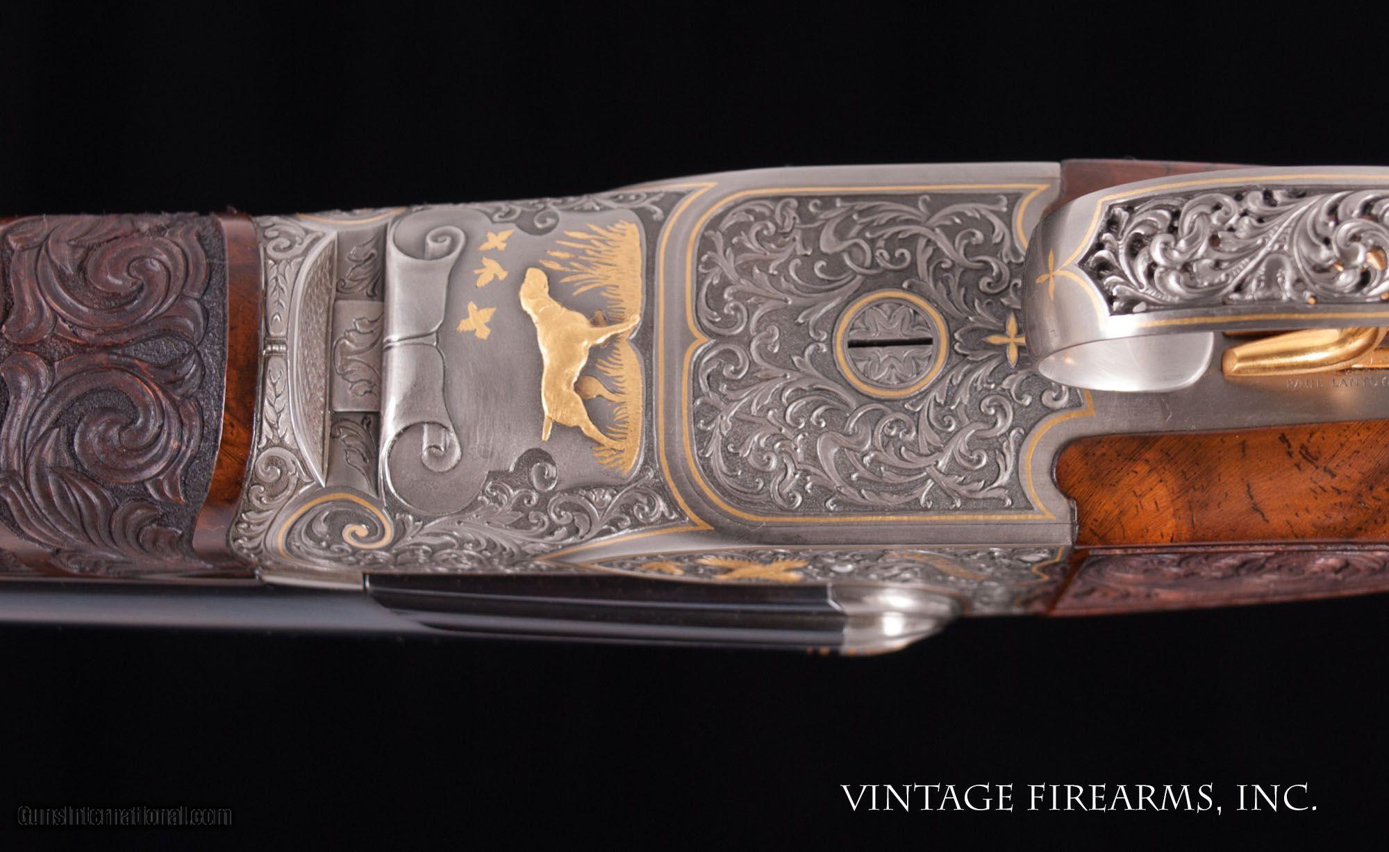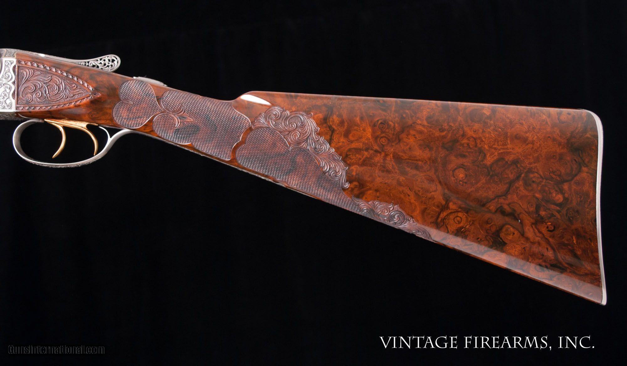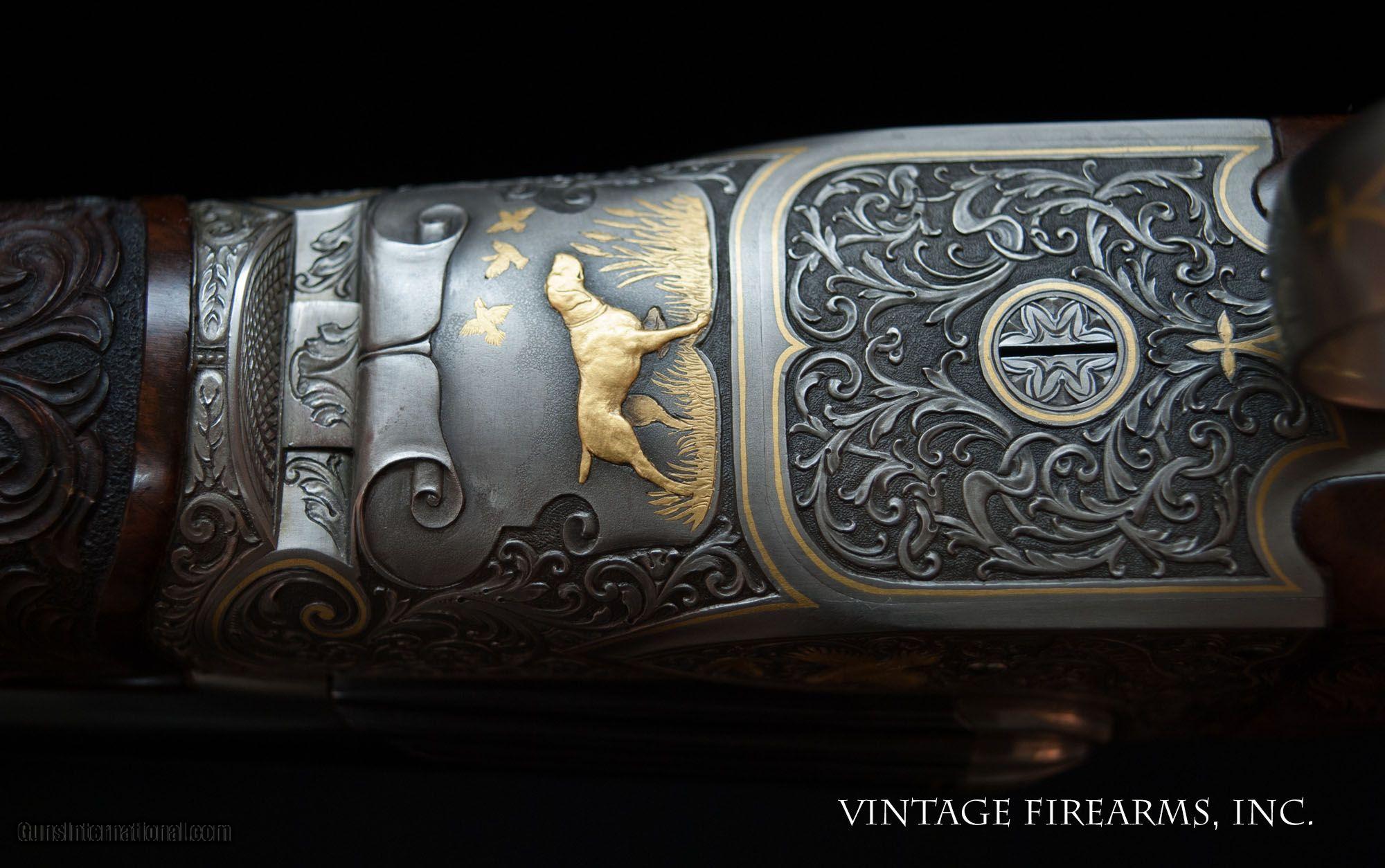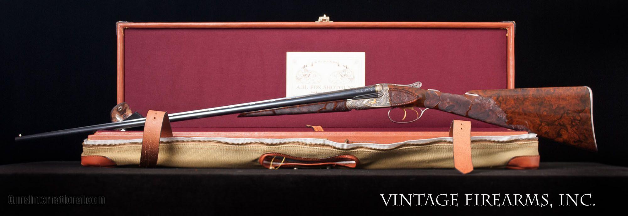 Description: Fox FE Special .410 Side-by-Side **REDUCED PRICE*** CSMC, ONE OF THE FINEST EVER MADE, PAUL LANTUCH ENGRAVED, AMAZING! General Specs: CSMC Fox, Year 2007, .410 Gauge, 5lbs 14oz, SxS Serial Number: F205960 Tony Galazan has produced many masterpieces in his Connecticut Shotgun Manufacturing facility. His faithful reproduction of Ansley H. Fox’s fine shotguns is no exception, and his “EXHIBITION” quality renditions far exceed anything old Ansley H. Fox ever contemplated. With over-the-top engraving and gold inlays, masterful wood carvings and checkering patterns, and state-of-the-art materials, Galazan has brought us TRUE ART IN WORKING PLATFORMS. This fine Fox, snF205960 built in 2007, is one of the very finest I have ever witnessed. The special features list is impressive and are evident in the photos; fancy-back action, pierced top lever and trigger guard, sculpted fences and barrel bolsters, breech balls beautifully inlaid with gold scroll, amazing raised gold inlays of birds and dogs, deep chiseled bank-note style scroll with ful shaded background, gold inlaid lettering and serial numbers; barrel wedge of engraving…just amazing. The butt stock is the finest burl walnut you will ever see, perfectly shaped and fit to the action, and perfectly executed scroll carvings and flor-de-lis checkering terminating in a finely engraved skeleton butt. Visually this gun is stunning! Mechanically perfect with 28” Krupp Steel barrels weighing 5lbs. 14oz. and balanced 1/8” ahead of the hinge pin, the gun is made to shoot as well. Examine the photos, as no words can convey the quality of this fine shotgun. Tony Galazan and his crew of craftsman has created one of the finest firearms both visually and mechanically that one could ever want. PAUL LANTUCH IS A WORLD-RENOWNED ENGRAVER, WORKING ON WESTLEY RICHARD’S FINEST. GOOGLE HIS NAME AND YOU WILL LEARN OF THE LEVEL OF RESPRECT THIS ARTIST HAS GAINED IN HIS LIFETIME OF WORK. You will not find a better piece of firearm art. Thanks for looking and don’t let this one slip away! Barrels Barrel Length: 28" ventilated rib Chokes: .011/.014 M/IM Bores: perfect mirrors Bore Diameter: .414 both % Blue: 100% factory Chambers: 3" Ribs: vent rib, tight Sights: single ivory Action Action: tight, way right of center Ejectors or Extractors: ejectors, strong, timed Case Color: french grey Screws: perfect Engraving: Paul Lantuch; deep cut shaded background Trigger Type: double, crisp Trigger Guard Color: pierced, gold, 100% Stock Type: English stock/splinter forend LOP: 14 1/4" LOP To End Of Wood: 14 1/8" DAH: 2 3/8" DAC: 1 7/16" Cast: 1/8" off Checkering Condition: amazing carvings Butt Treatment: skeleton butt plate There are more photos upon request. We offer a 30 day mechanical warranty on this fine shotgun. Call us for full details. PLEASE SEE MY OTHER FINE VINTAGE FIREARMS. Just open one of my ads and click on the line that says “see all items from this seller” and a very nice list of fine sporting and collectible arms will appear. I have many more fine sxs shotguns not yet listed. Thanks for looking! We employ a full time gunsmith on premises and can perform alterations to suit your needs within a few weeks of purchase. Payment Methods: Money Order, Certified Check, Personal Check, Wire Transfer Inspection Period / Return Policy: Three Days from the date the item was received. Sales Tax: 6% Michigan Only Shipping & Insurance: Ground $280.00 We ship internationally! (**NOTE that most all of this is INSURANCE. If you have your own, we could arrange your insurance covering it.)? Item Condition: Used Requires FFL?: Yes If you have any questions about this item or payment, please email or call us at #616-292-6240. Thanks! Jay Shachter, Vintage Firearms Inc We employ a full time gunsmith on premises and can perform alterations to suit your needs within a few weeks of purchase. Common requests are: -stock bending to suit your particular requirements -addition of any specified butt pad to increase length of pull -alteration of chokes to suit your shooting preferences -lengthening of chambers and forcing cones -darkening stock color with penetrating stains -restoring any part of the gun including rust blue, charcoal blue, bone and charcoal case color, wood restoration and checkering recuts. If you like one our guns but it needs "tweaked", let us know and we can quote you a time and price. Some enthusiasts like the guns "as found" and others want them "just so". We often list guns as found and let the particular buyer choose how they want their gun to fit or look. SOLD |