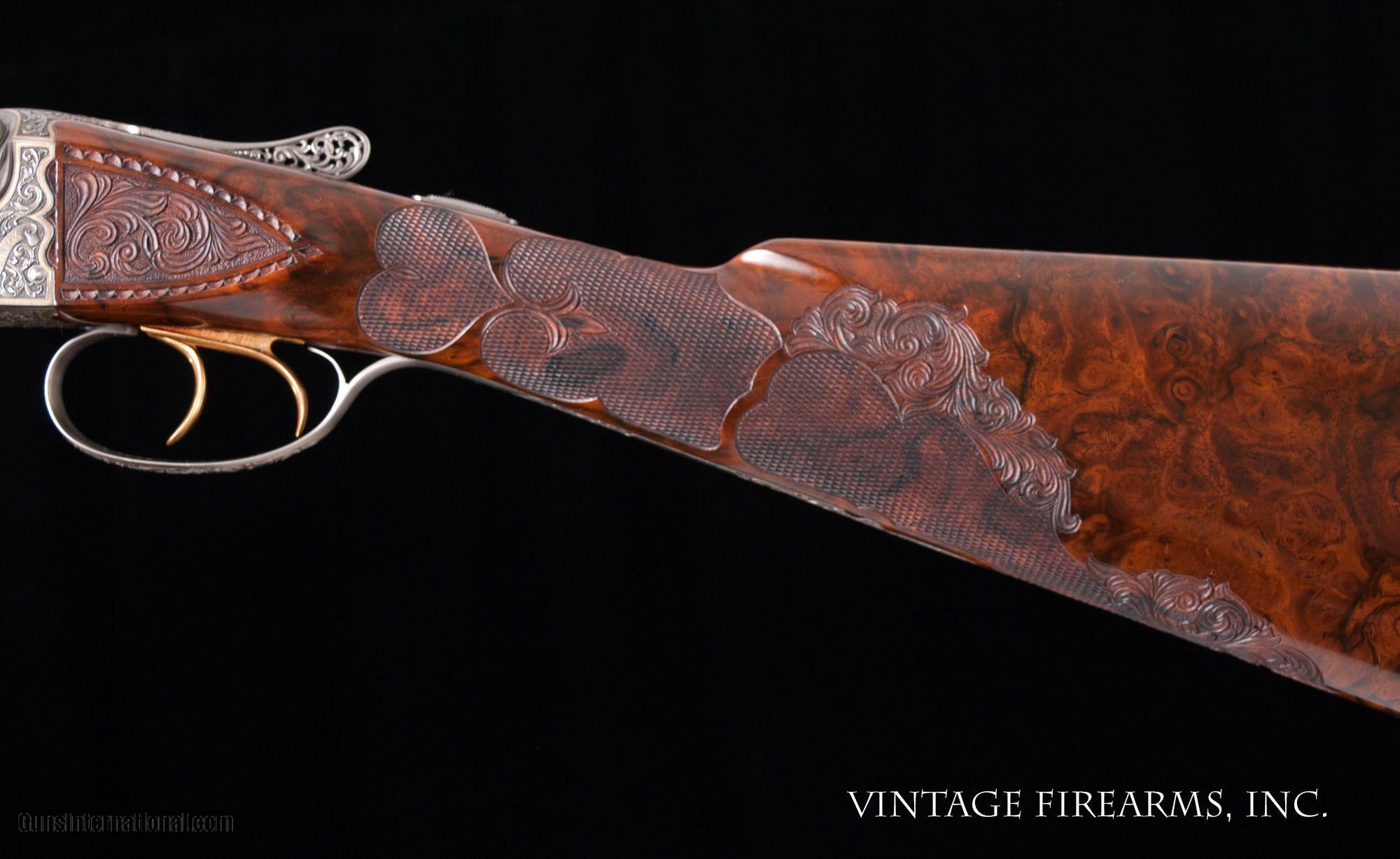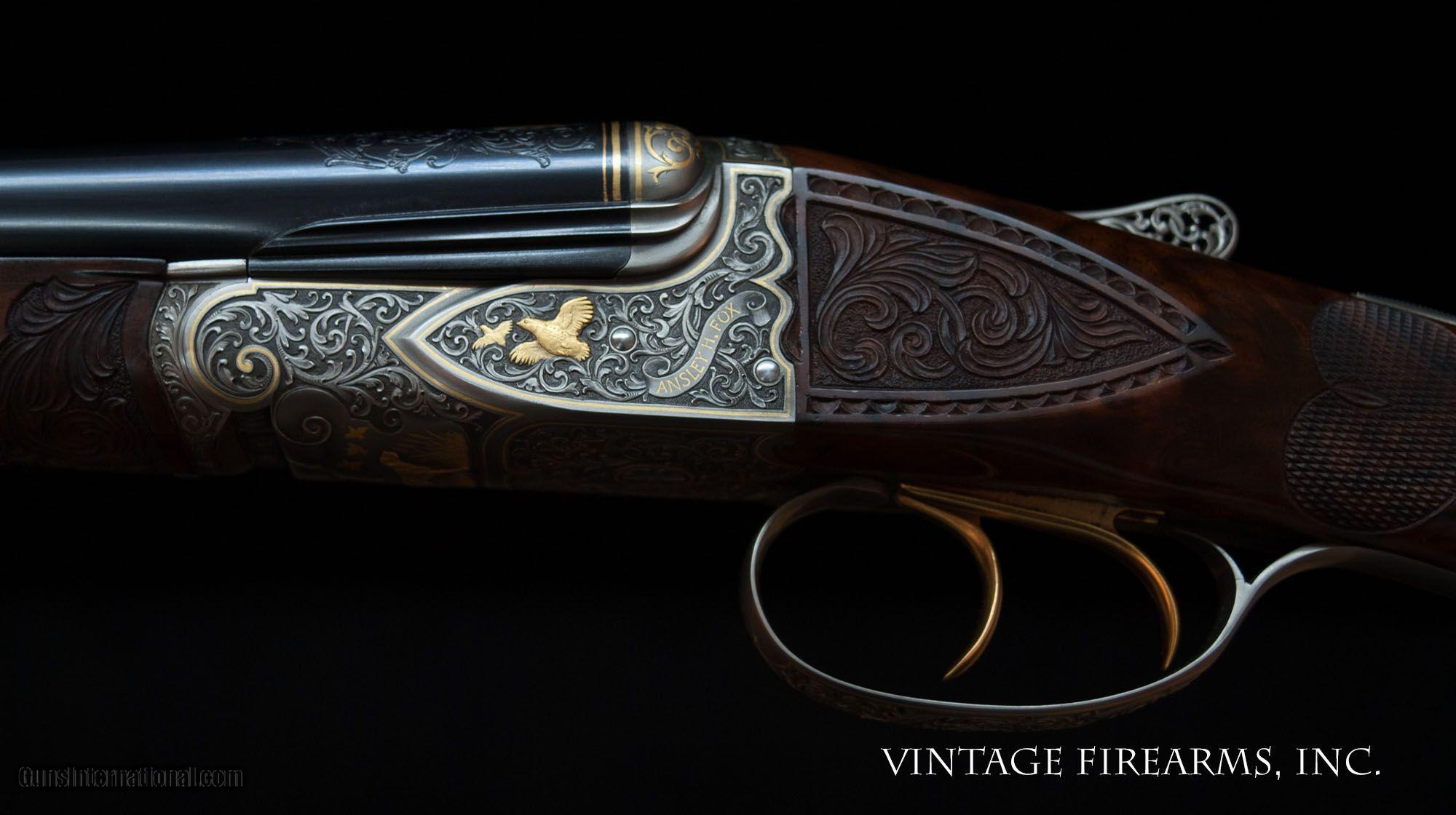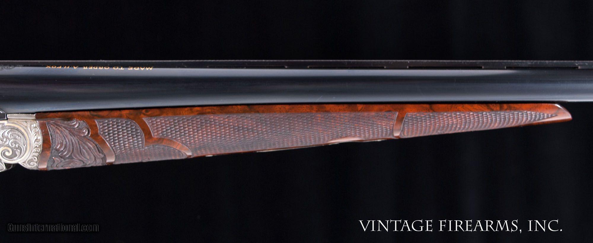 Description: Fox FE Special .410 Side-by-Side **REDUCED PRICE*** CSMC, ONE OF THE FINEST EVER MADE, PAUL LANTUCH ENGRAVED, AMAZING! General Specs: CSMC Fox, Year 2007, .410 Gauge, 5lbs 14oz, SxS Serial Number: F205960 Tony Galazan has produced many masterpieces in his Connecticut Shotgun Manufacturing facility. His faithful reproduction of Ansley H. Fox’s fine shotguns is no exception, and his “EXHIBITION” quality renditions far exceed anything old Ansley H. Fox ever contemplated. With over-the-top engraving and gold inlays, masterful wood carvings and checkering patterns, and state-of-the-art materials, Galazan has brought us TRUE ART IN WORKING PLATFORMS. This fine Fox, snF205960 built in 2007, is one of the very finest I have ever witnessed. The special features list is impressive and are evident in the photos; fancy-back action, pierced top lever and trigger guard, sculpted fences and barrel bolsters, breech balls beautifully inlaid with gold scroll, amazing raised gold inlays of birds and dogs, deep chiseled bank-note style scroll with ful shaded background, gold inlaid lettering and serial numbers; barrel wedge of engraving…just amazing. The butt stock is the finest burl walnut you will ever see, perfectly shaped and fit to the action, and perfectly executed scroll carvings and flor-de-lis checkering terminating in a finely engraved skeleton butt. Visually this gun is stunning! Mechanically perfect with 28” Krupp Steel barrels weighing 5lbs. 14oz. and balanced 1/8” ahead of the hinge pin, the gun is made to shoot as well. Examine the photos, as no words can convey the quality of this fine shotgun. Tony Galazan and his crew of craftsman has created one of the finest firearms both visually and mechanically that one could ever want. PAUL LANTUCH IS A WORLD-RENOWNED ENGRAVER, WORKING ON WESTLEY RICHARD’S FINEST. GOOGLE HIS NAME AND YOU WILL LEARN OF THE LEVEL OF RESPRECT THIS ARTIST HAS GAINED IN HIS LIFETIME OF WORK. You will not find a better piece of firearm art. Thanks for looking and don’t let this one slip away! Barrels Barrel Length: 28" ventilated rib Chokes: .011/.014 M/IM Bores: perfect mirrors Bore Diameter: .414 both % Blue: 100% factory Chambers: 3" Ribs: vent rib, tight Sights: single ivory Action Action: tight, way right of center Ejectors or Extractors: ejectors, strong, timed Case Color: french grey Screws: perfect Engraving: Paul Lantuch; deep cut shaded background Trigger Type: double, crisp Trigger Guard Color: pierced, gold, 100% Stock Type: English stock/splinter forend LOP: 14 1/4" LOP To End Of Wood: 14 1/8" DAH: 2 3/8" DAC: 1 7/16" Cast: 1/8" off Checkering Condition: amazing carvings Butt Treatment: skeleton butt plate There are more photos upon request. We offer a 30 day mechanical warranty on this fine shotgun. Call us for full details. PLEASE SEE MY OTHER FINE VINTAGE FIREARMS. Just open one of my ads and click on the line that says “see all items from this seller” and a very nice list of fine sporting and collectible arms will appear. I have many more fine sxs shotguns not yet listed. Thanks for looking! We employ a full time gunsmith on premises and can perform alterations to suit your needs within a few weeks of purchase. Payment Methods: Money Order, Certified Check, Personal Check, Wire Transfer Inspection Period / Return Policy: Three Days from the date the item was received. Sales Tax: 6% Michigan Only Shipping & Insurance: Ground $280.00 We ship internationally! (**NOTE that most all of this is INSURANCE. If you have your own, we could arrange your insurance covering it.)? Item Condition: Used Requires FFL?: Yes If you have any questions about this item or payment, please email or call us at #616-292-6240. Thanks! Jay Shachter, Vintage Firearms Inc We employ a full time gunsmith on premises and can perform alterations to suit your needs within a few weeks of purchase. Common requests are: -stock bending to suit your particular requirements -addition of any specified butt pad to increase length of pull -alteration of chokes to suit your shooting preferences -lengthening of chambers and forcing cones -darkening stock color with penetrating stains -restoring any part of the gun including rust blue, charcoal blue, bone and charcoal case color, wood restoration and checkering recuts. If you like one our guns but it needs "tweaked", let us know and we can quote you a time and price. Some enthusiasts like the guns "as found" and others want them "just so". We often list guns as found and let the particular buyer choose how they want their gun to fit or look. SOLD |
