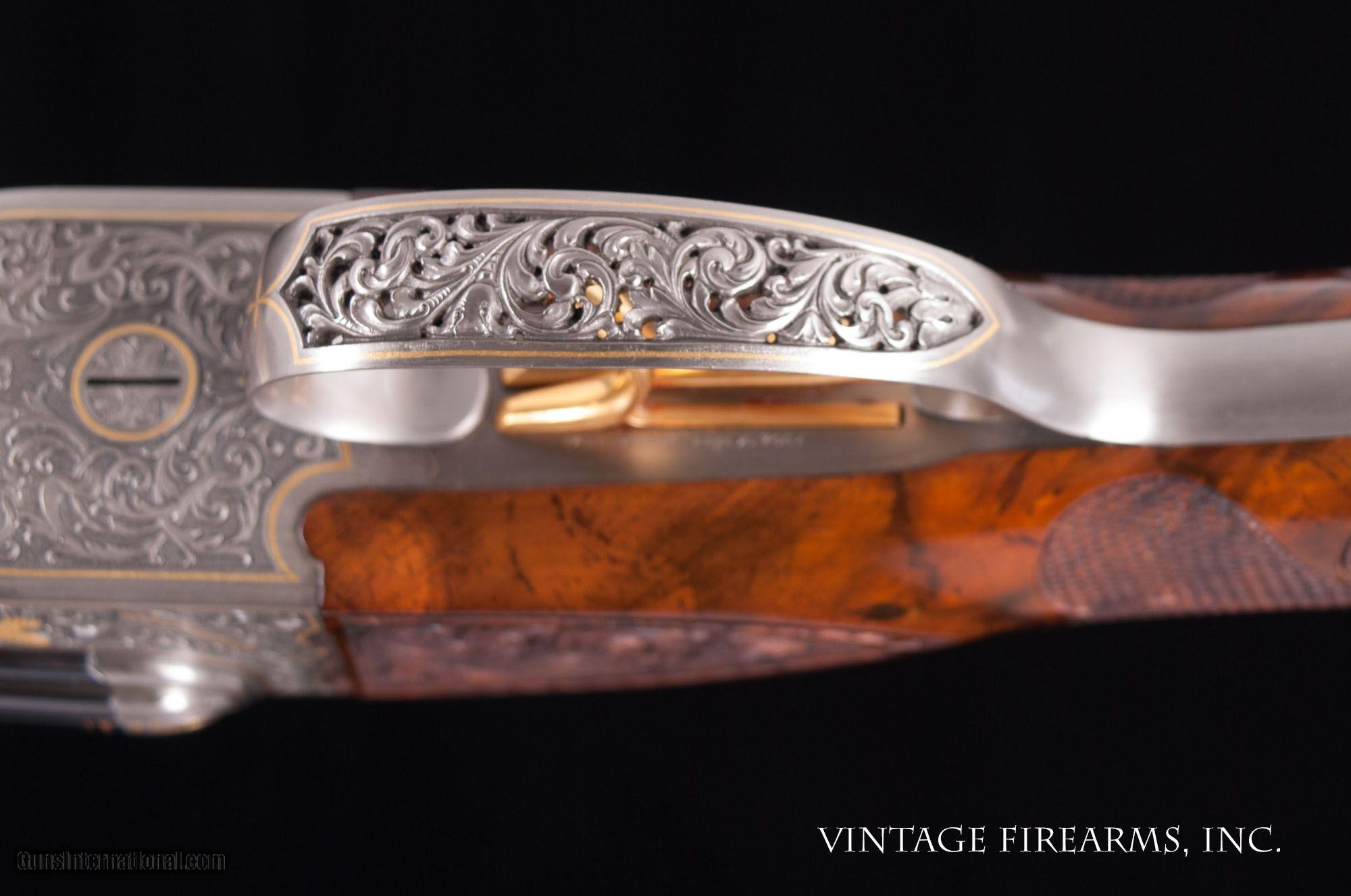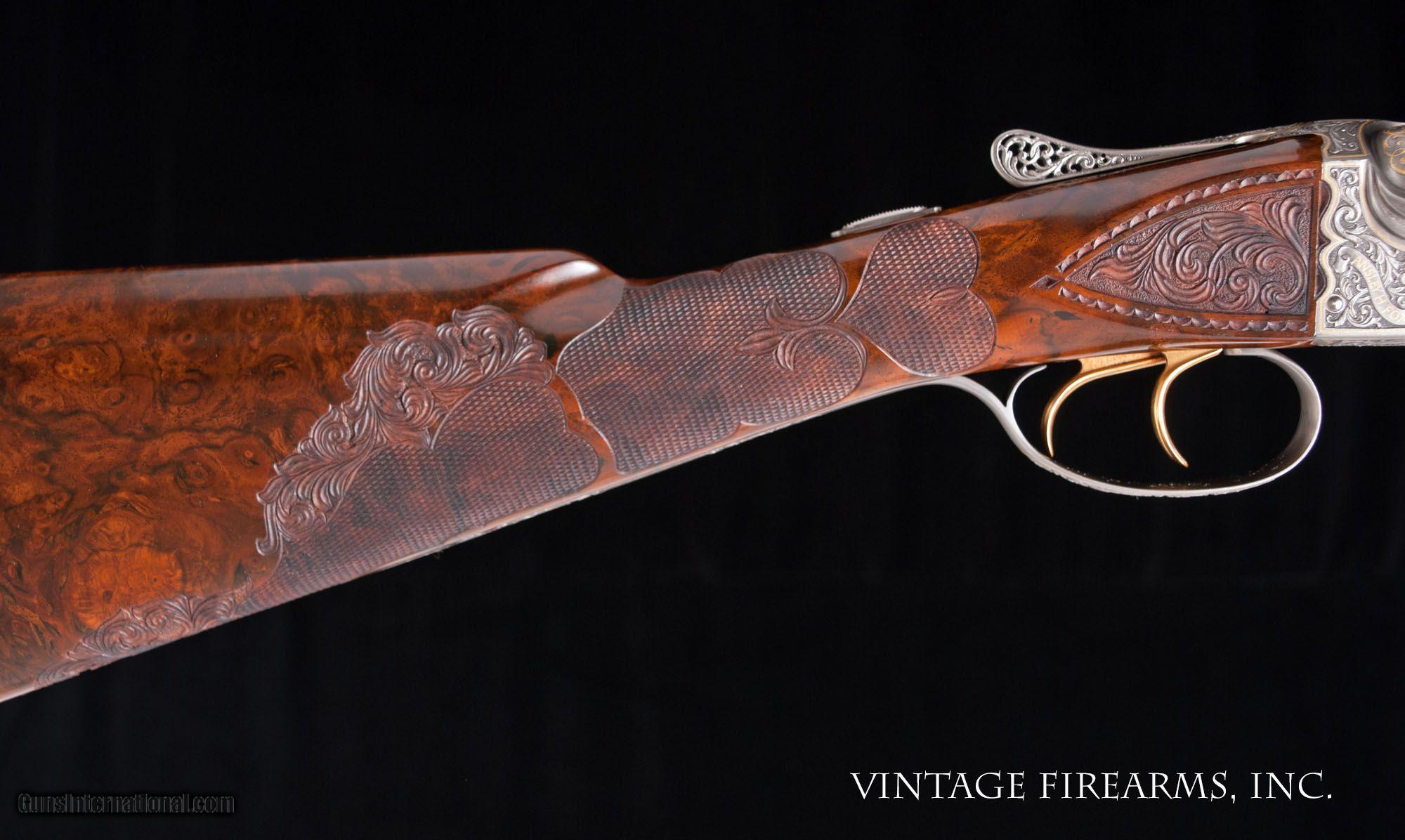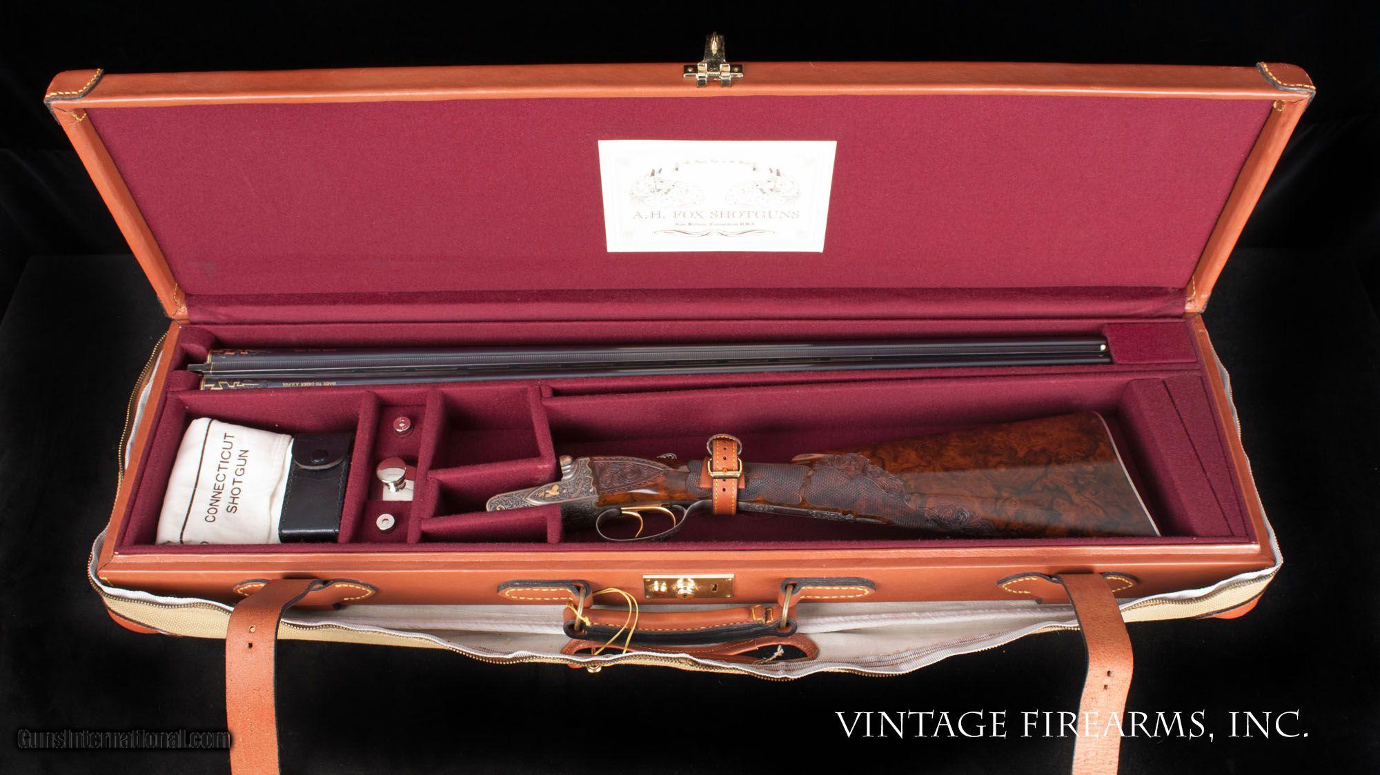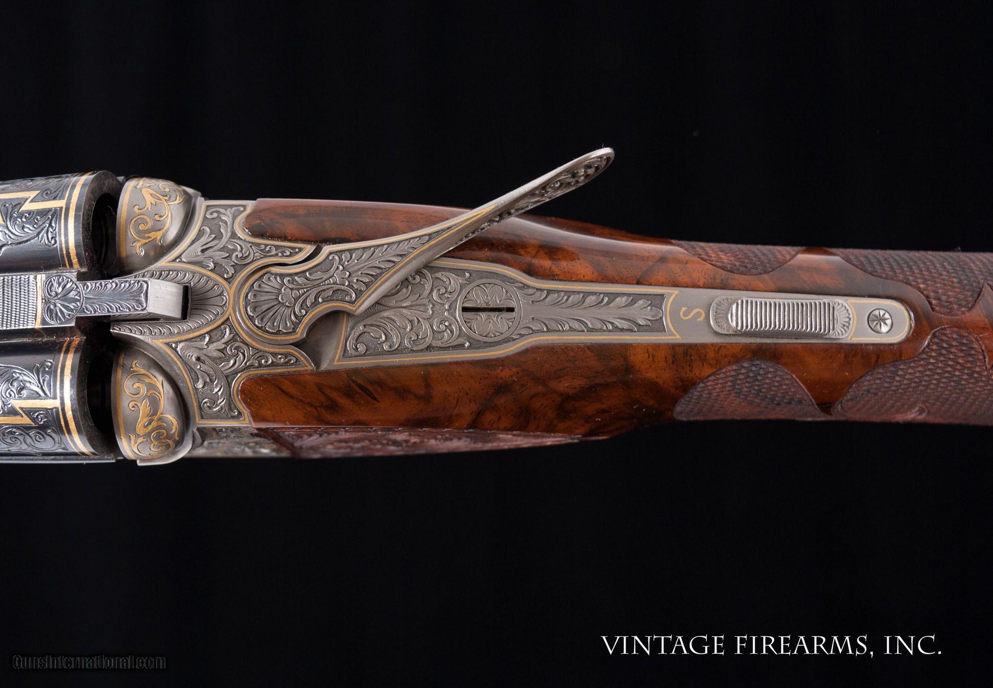 Description: Fox FE Special .410 Side-by-Side **REDUCED PRICE*** CSMC, ONE OF THE FINEST EVER MADE, PAUL LANTUCH ENGRAVED, AMAZING! General Specs: CSMC Fox, Year 2007, .410 Gauge, 5lbs 14oz, SxS Serial Number: F205960 Tony Galazan has produced many masterpieces in his Connecticut Shotgun Manufacturing facility. His faithful reproduction of Ansley H. Fox’s fine shotguns is no exception, and his “EXHIBITION” quality renditions far exceed anything old Ansley H. Fox ever contemplated. With over-the-top engraving and gold inlays, masterful wood carvings and checkering patterns, and state-of-the-art materials, Galazan has brought us TRUE ART IN WORKING PLATFORMS. This fine Fox, snF205960 built in 2007, is one of the very finest I have ever witnessed. The special features list is impressive and are evident in the photos; fancy-back action, pierced top lever and trigger guard, sculpted fences and barrel bolsters, breech balls beautifully inlaid with gold scroll, amazing raised gold inlays of birds and dogs, deep chiseled bank-note style scroll with ful shaded background, gold inlaid lettering and serial numbers; barrel wedge of engraving…just amazing. The butt stock is the finest burl walnut you will ever see, perfectly shaped and fit to the action, and perfectly executed scroll carvings and flor-de-lis checkering terminating in a finely engraved skeleton butt. Visually this gun is stunning! Mechanically perfect with 28” Krupp Steel barrels weighing 5lbs. 14oz. and balanced 1/8” ahead of the hinge pin, the gun is made to shoot as well. Examine the photos, as no words can convey the quality of this fine shotgun. Tony Galazan and his crew of craftsman has created one of the finest firearms both visually and mechanically that one could ever want. PAUL LANTUCH IS A WORLD-RENOWNED ENGRAVER, WORKING ON WESTLEY RICHARD’S FINEST. GOOGLE HIS NAME AND YOU WILL LEARN OF THE LEVEL OF RESPRECT THIS ARTIST HAS GAINED IN HIS LIFETIME OF WORK. You will not find a better piece of firearm art. Thanks for looking and don’t let this one slip away! Barrels Barrel Length: 28" ventilated rib Chokes: .011/.014 M/IM Bores: perfect mirrors Bore Diameter: .414 both % Blue: 100% factory Chambers: 3" Ribs: vent rib, tight Sights: single ivory Action Action: tight, way right of center Ejectors or Extractors: ejectors, strong, timed Case Color: french grey Screws: perfect Engraving: Paul Lantuch; deep cut shaded background Trigger Type: double, crisp Trigger Guard Color: pierced, gold, 100% Stock Type: English stock/splinter forend LOP: 14 1/4" LOP To End Of Wood: 14 1/8" DAH: 2 3/8" DAC: 1 7/16" Cast: 1/8" off Checkering Condition: amazing carvings Butt Treatment: skeleton butt plate There are more photos upon request. We offer a 30 day mechanical warranty on this fine shotgun. Call us for full details. PLEASE SEE MY OTHER FINE VINTAGE FIREARMS. Just open one of my ads and click on the line that says “see all items from this seller” and a very nice list of fine sporting and collectible arms will appear. I have many more fine sxs shotguns not yet listed. Thanks for looking! We employ a full time gunsmith on premises and can perform alterations to suit your needs within a few weeks of purchase. Payment Methods: Money Order, Certified Check, Personal Check, Wire Transfer Inspection Period / Return Policy: Three Days from the date the item was received. Sales Tax: 6% Michigan Only Shipping & Insurance: Ground $280.00 We ship internationally! (**NOTE that most all of this is INSURANCE. If you have your own, we could arrange your insurance covering it.)? Item Condition: Used Requires FFL?: Yes If you have any questions about this item or payment, please email or call us at #616-292-6240. Thanks! Jay Shachter, Vintage Firearms Inc We employ a full time gunsmith on premises and can perform alterations to suit your needs within a few weeks of purchase. Common requests are: -stock bending to suit your particular requirements -addition of any specified butt pad to increase length of pull -alteration of chokes to suit your shooting preferences -lengthening of chambers and forcing cones -darkening stock color with penetrating stains -restoring any part of the gun including rust blue, charcoal blue, bone and charcoal case color, wood restoration and checkering recuts. If you like one our guns but it needs "tweaked", let us know and we can quote you a time and price. Some enthusiasts like the guns "as found" and others want them "just so". We often list guns as found and let the particular buyer choose how they want their gun to fit or look. SOLD |