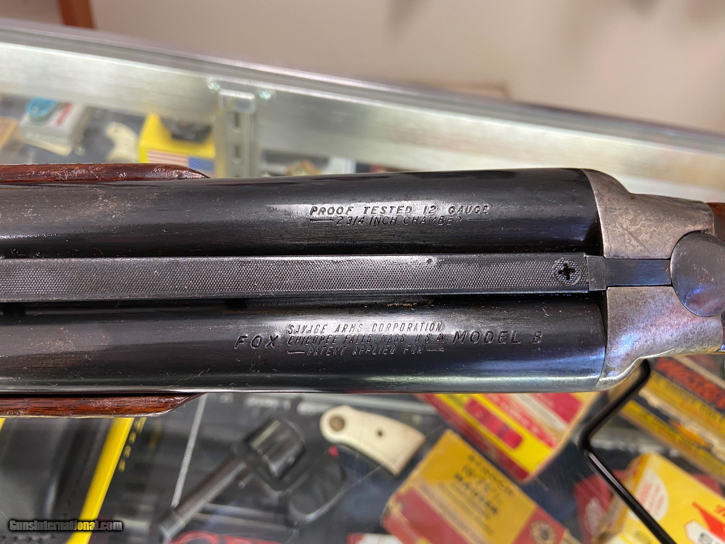 Description: Fox Model B Very early Fox Model B, probably late '40s early '50s Simialr to Ansley H. Fox or Fox Sterlingworth Beavertail Forearm Single Trigger Barrel 30" Full + Modified, 2 3/4" 12ga. Tight action, very nice condition Trace amounts of case coloring, approximantely 20%. Three quail birds in flight are displayed on the bottom of the receiver, very nice. History The Fox Model B was introduced at a MSRP of $25.75. It was to be a long lived model, remaining in the Savage line until rising manufacturing costs and the sale and reorganization of Savage Industries, Inc. (which became today's Savage Arms Company) caused it to be discontinued in 1988. By that time the MSRP for the Fox Model B-SE had risen to $525. The Model B was introduced in 12, 16, 20, and .410 bores. At some point in the early 1970's the 16 gauge was dropped, but the other three bores were available until the end. The usual barrel lengths were 30, 28, and 26 inches in 12 gauge and 28 and 26 inches in 16 and 20 gauge, although some guns with 24 inch barrels were sold. All Fox Model B shotguns are side-by-side box locks of a simplified Anson & Deely type with a single underbolt and a Scott spindle top lever to open the action. Coil springs are used throughout and power the hammers and sears. The result is a somewhat bulky but very durable action that seldom needs repair. The sides and bottom of the frame are decorated by a simple etched "engraving" pattern. Billing & Shipping Payment On firearms, we only accept credit/debit cards or money orders/cashier's checks.