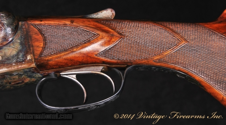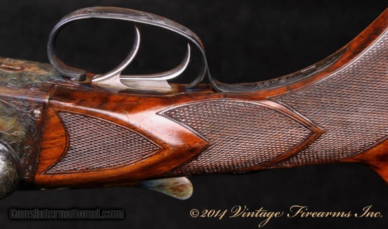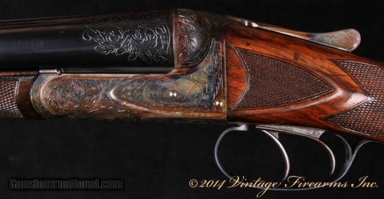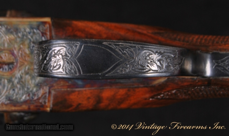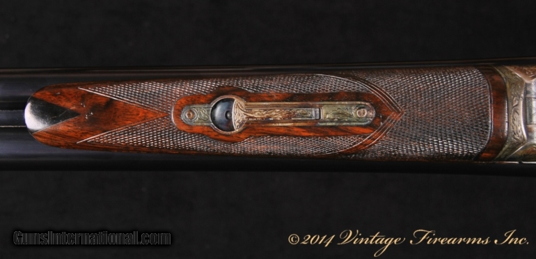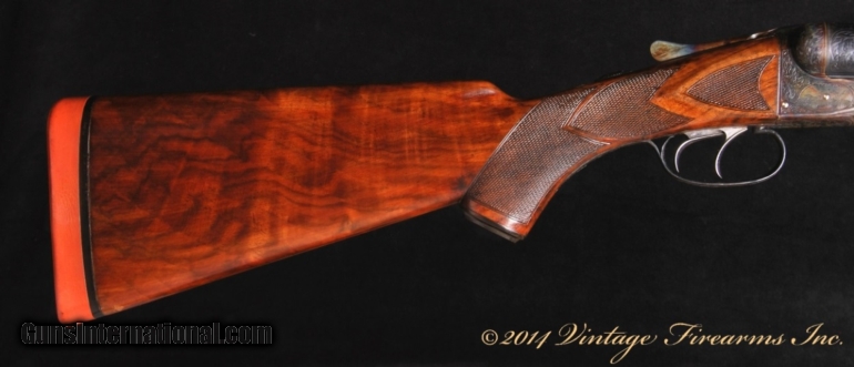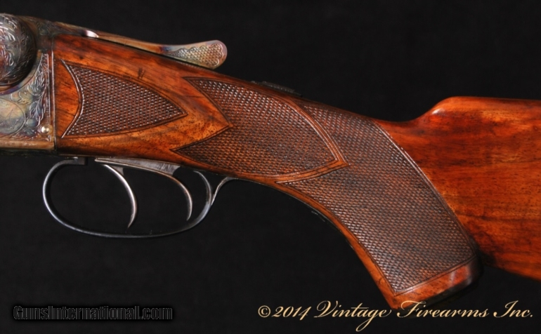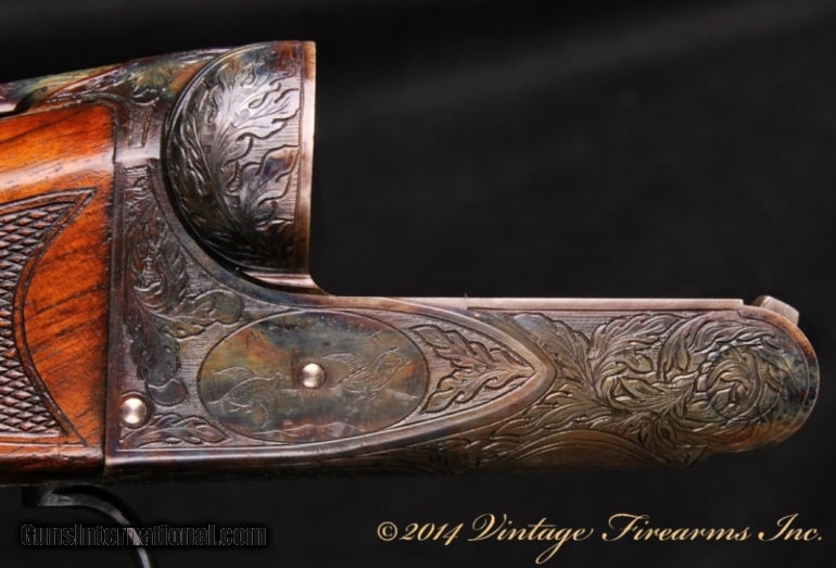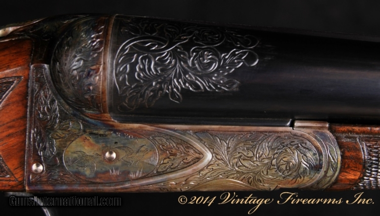 Description: Fox XE 12 Gauge SxS Shotgun 32" KRUPP BARRELS, BEST ENGRAVING, 99% General Specs: AH Fox, Year 1915, 12 Gauge, 7lbs 8oz, Side by Side Serial Number: 22327 What a beautiful Fox we have here. Restored to historically proper finishes in the finest manner, still configured just as it was shipped, documented on the factory work card with all factory original parts, this XE, sn22327 built in 1915, was engraved during the time of the finest XE style engraving. Delicately carved with clean, crisp cuts, the deep relief oak leaf and game scene engraving outshines most XE guns I have seen. Even the background shading is superbly done. The XE was one of the most visibly elegant of the Fox grades. This one came from the factory with delightful checkering on figured Circassian walnut stocks, standard with ejectors, double ivory beads, and a Silvers pad, and special attention was paid to the chambers, bores, and chokes to create a highly refined shooting machine. Special ordered with a 15" LOP (solid rubber Silvers pad can be shaped down by up to 1/2" to reduce length of pull to as little as 14 3/8"), 32" #2 weight barrels choked F/F, and nice shooting dimensions, this gun is the heavy 12 gauge we all need on occasion for pheasants, waterfowl, turkey, pigeons, etc., not to mention trap and other clay games. Its 7 1/2lb. weight and fine balance aids in a smooth swing and reduces felt recoil. There are very few Fox XE guns available for sale, especially with these desirable features and 100% as new condition. There will always be a strong demand for these guns, and as such they are great investments. Barrels Barrel Length: 32" #2wt Krupp Steel Chokes: .034/.037 F/F Bores: excellent Bore Diameter: .724/.727 Wall Thickness: .032/.031 % Blue: 99% Chambers: 3" Ribs: tight Sights: double, ivory factory Action Action: tight, way right of center Ejectors or Extractors: ejectors, strong, timed Case Color: 100% Screws: perfect Engraving: best, delicate Trigger Type: double, crisp Trigger Guard Color: 99% Stock Type: figured capped pistol grip/splinter forend LOP: 14 7/8" LOP To End Of Wood: 13 7/8" DAH: 2 3/8" DAC: 1 1/2" Cast: 1/8" on Checkering Condition: perfect Butt Treatment: silvers pad factory There are more photos upon request. We offer a 30 day mechanical warranty on this fine shotgun. PLEASE SEE MY OTHER FINE VINTAGE FIREARMS. Just open one of my ads and click on the line that says “see all items from this seller” and a very nice list of fine sporting and collectible arms will appear. I have many more fine sxs shotguns not yet listed. Thanks for looking! JOIN US WANENMACHER'S TULSA ARMS SHOW on November 8 and 9, 2014! It will be held at the EXPO SQUARE (TULSA FAIRGROUNDS) in Tulsa, OK with more than 4,200 tables! We employ a full time gunsmith on premises and can perform alterations to suit your needs within a few weeks of purchase. Payment Methods: Money Order, Certified Check, Personal Check, Wire Transfer Inspection Period / Return Policy: Three Days from the date the item was received. Sales Tax: 6% Michigan Only Shipping & Insurance: Ground $95.00 We ship internationally! Item Condition: Used Requires FFL?: Yes If you have any questions about this item or payment, please email or call us directly, at #616-292-6240. Thanks! Vintage Firearms, Inc SOLD Curio/Relic: Yes |