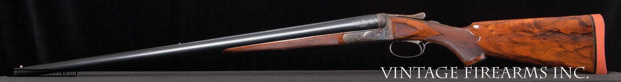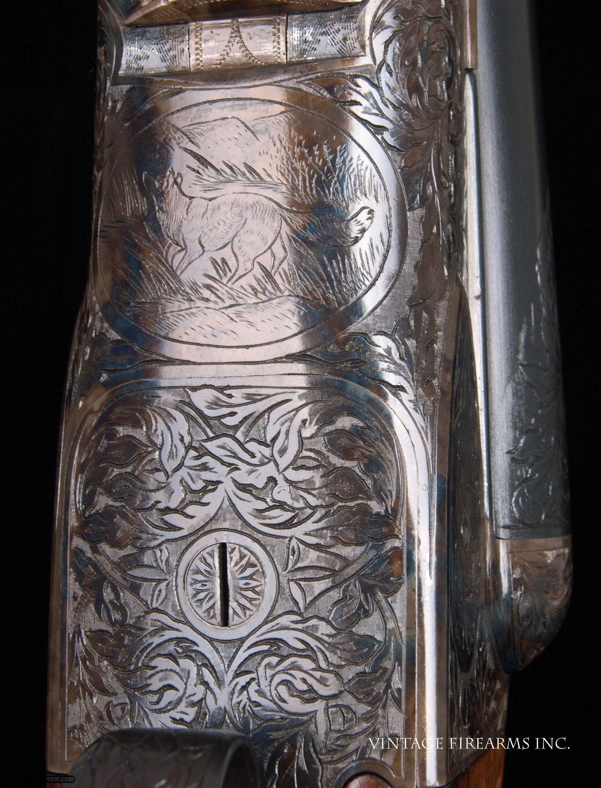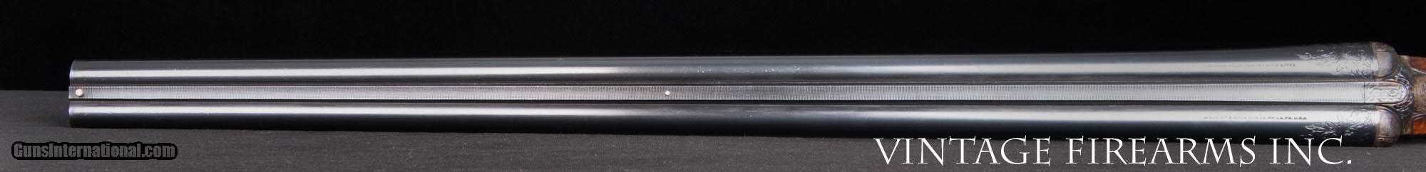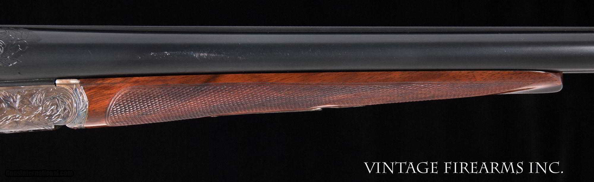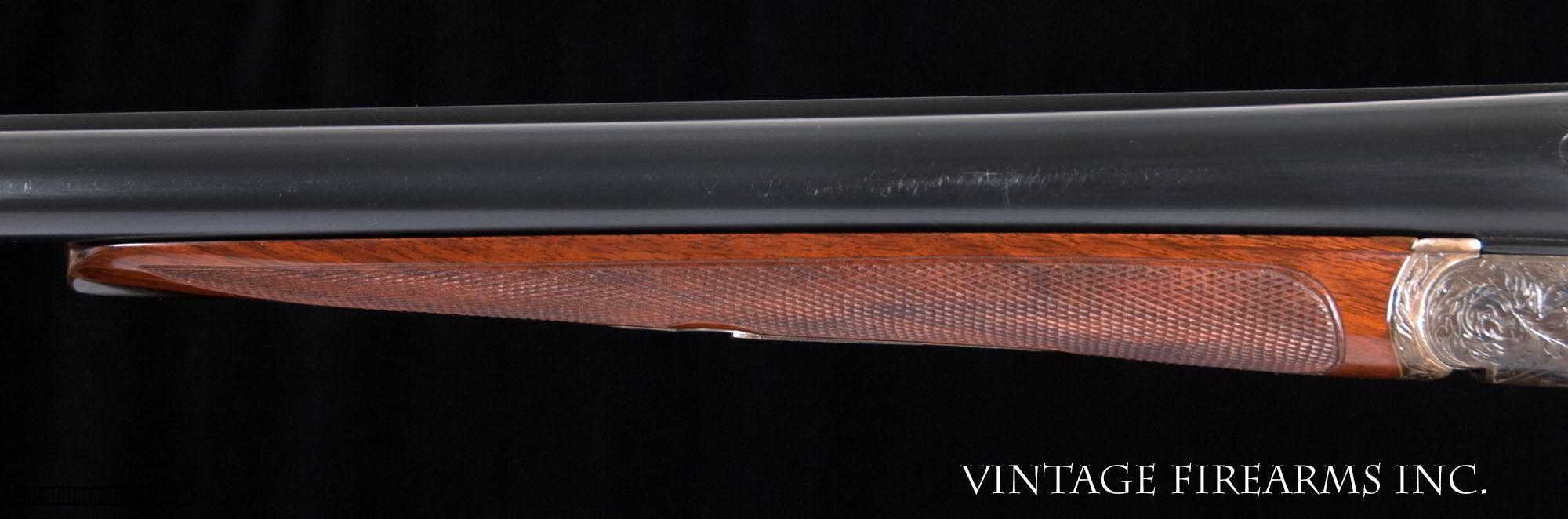 Description: Fox XE 12 Gauge Side-by-Side 6lbs 10oz, KAUTZKY SINGLE TRIGGER, 28" General Specs: Fox, Year 1924, 12 Gauge, 6lbs 10oz, Side by Side Serial Number: 29317 The A.H. Fox XE Grade is truly one of the most handsome American doubles ever produced, with its deeply carved oak leaf engraving on the receiver and barrel wedges, long elegant forends with the buffalo horn inlay cut to a slight schnabel, rebated frames to keep the head of the stock from spreading, frame filed to the shape of the barrels all the way to the top rib, locking screws on the top action screw, delightful checkering on Circassian walnut stocks, all coming together to make a stunning double shotgun. The XE Grade Fox came standard with ejectors and a Silvers pad, and special attention was paid to the chambers, bores, and chokes to create a highly refined shooting machine. This 1924 gun, sn29317 is no exception. Nicely restored with 100% bone and charcoal case color, 99% rust blue, perfect TruOil finish, perfect checkering, 28" #4 weight Chromox barrels, Fox/Kautzky single selective trigger, tight on face and hinge pin, all ready for your upcoming hunting season. It is very rare to find an American double gun in 12ga. that weighs under 7lbs. let alone 6lbs. 10oz.! And with the single selective trigger, this is a very rare combination and a perfect upland gun for grouse and pheasants over dogs. Fox guns have been steadily going up in value and an XE is highly prized. Thanks for looking. Barrels Barrel Length: 28" #4wt chromox Chokes: .003/.007 SK1/SK2 Bores: excellent Bore Diameter: .735/.737 Wall Thickness: .024/.020 % Blue: 99% Chambers: 2 5/8" Ribs: tight Sights: double ivory Action Action: tight, right of center Ejectors or Extractors: ejectors Case Color: 100% Screws: excellent Engraving: clear sharp Trigger Type: factory sst fox/kautzky Trigger Guard Color: 100% blue Stock Type: capped pistol grip/splinter forend/ nice french LOP: 13 5/8" LOP To End Of Wood: 12 7/8" DAH: 2 1/2" DAC: 1 11/16" Cast: 0 Checkering Condition: excellent Butt Treatment: London gun There are more photos upon request. There is a 30 day mechanical warranty on this gun. Call us for full details. Please see all of our fine Vintage Firearms on this . We have many more sxs shotguns for sale and soon to be listed, check back or email us for a preview. Thanks for looking! We employ a full time gunsmith on premises and can perform alterations to suit your needs within a few weeks of purchase. Payment Methods: Money Order, Certified Check, Personal Check, Wire Transfer Inspection Period / Return Policy: Three Days from the date the item was received. Sales Tax: 6% Michigan Only Shipping & Insurance: Ground $140.00 We ship internationally! Item Condition: Used Requires FFL?: Yes If you have any questions about this item or payment, please email or call us directly, at #616-292-6240. Thanks! Jay Shachter, Vintage Firearms, Inc SOLD Curio/Relic: Yes |