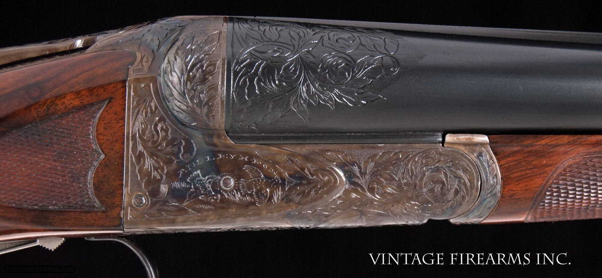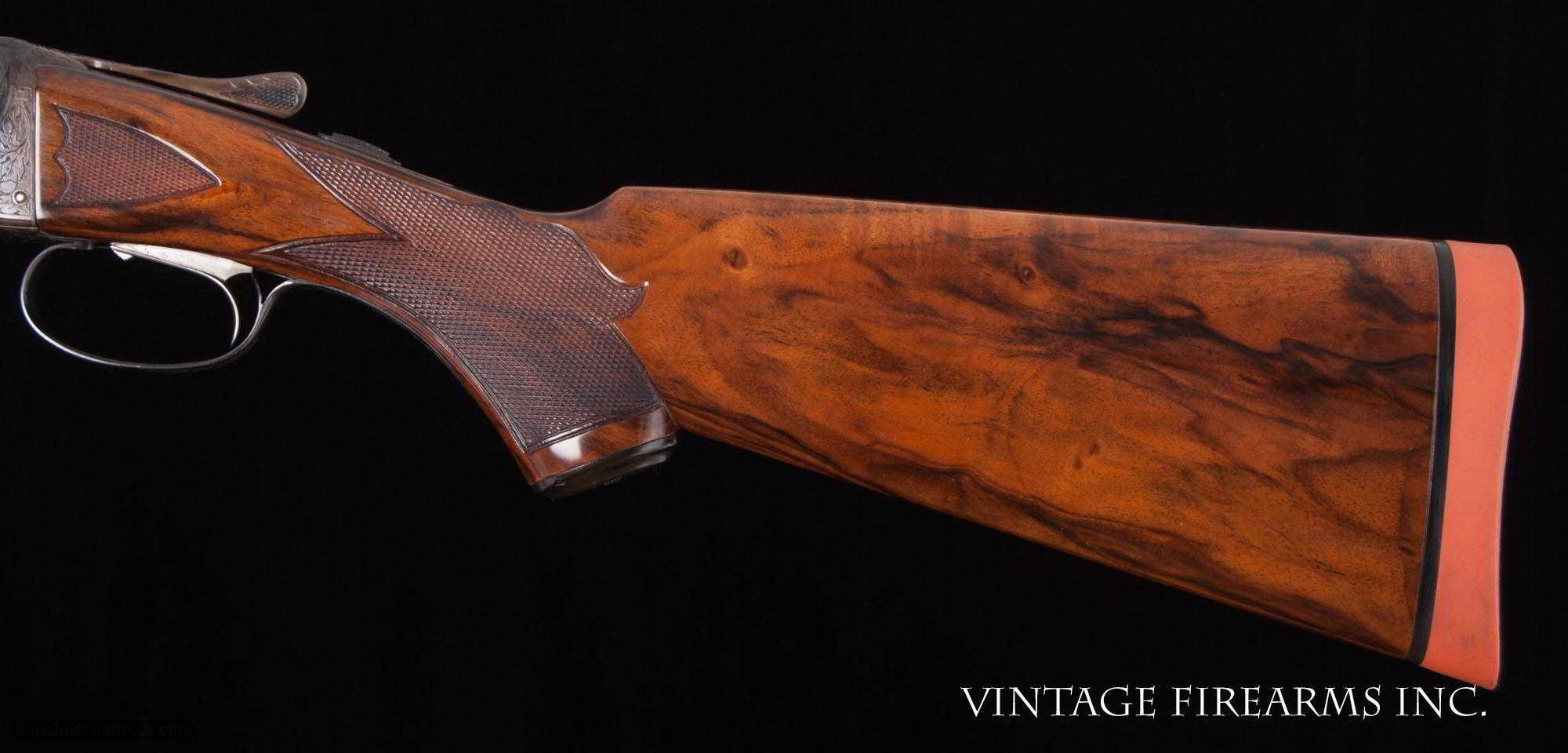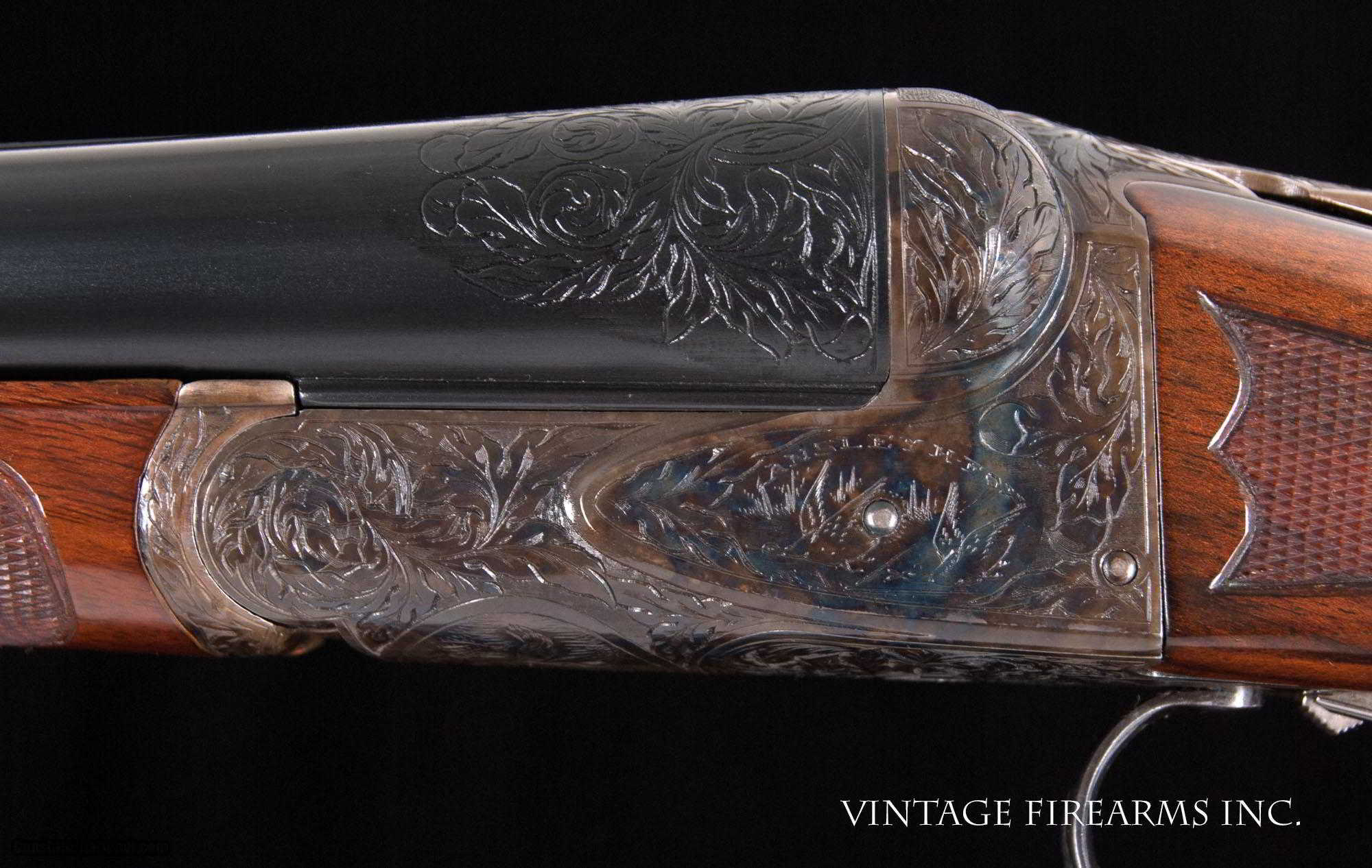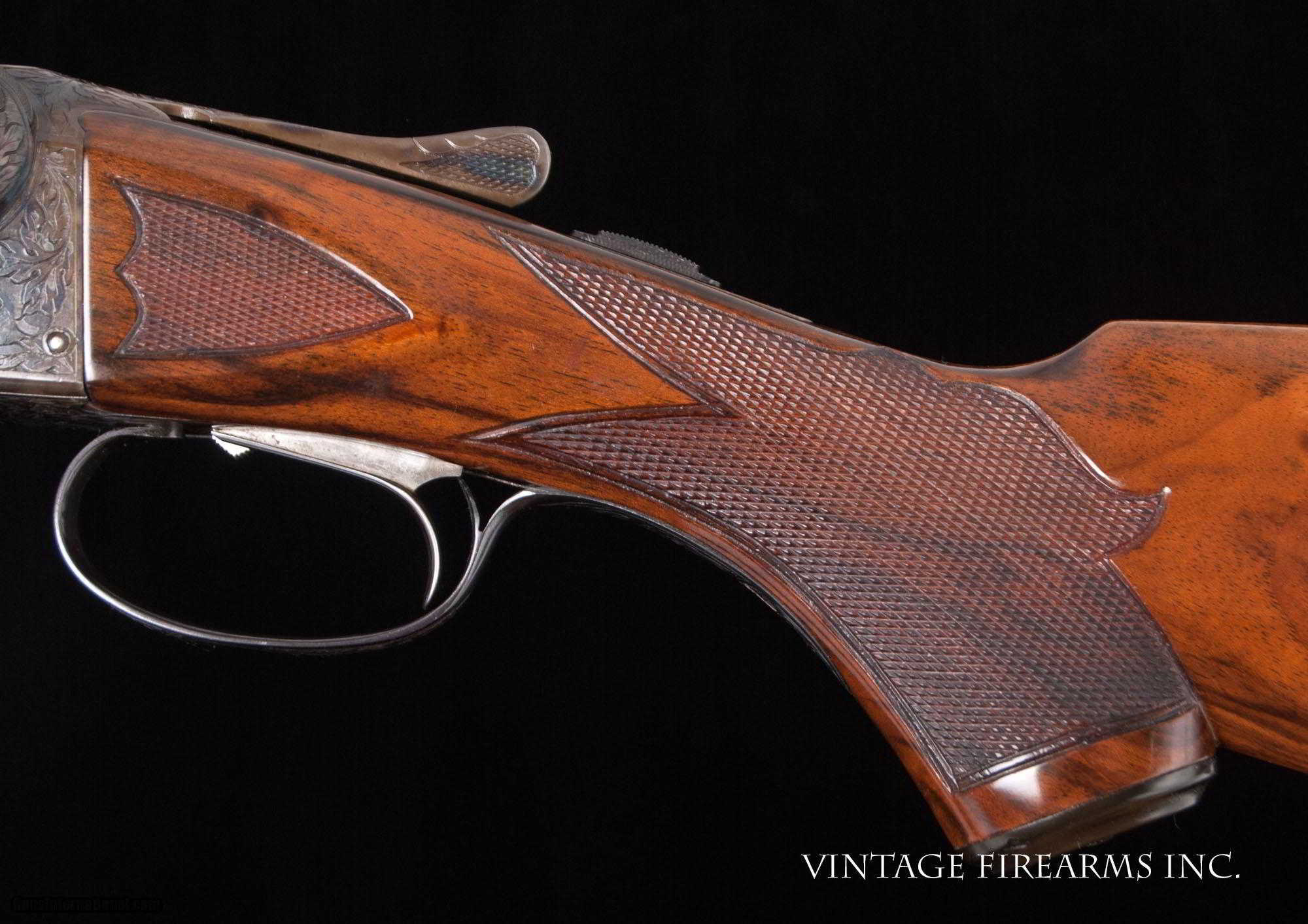 Description: Fox XE 12 Gauge Side-by-Side 6lbs 10oz, KAUTZKY SINGLE TRIGGER, 28" General Specs: Fox, Year 1924, 12 Gauge, 6lbs 10oz, Side by Side Serial Number: 29317 The A.H. Fox XE Grade is truly one of the most handsome American doubles ever produced, with its deeply carved oak leaf engraving on the receiver and barrel wedges, long elegant forends with the buffalo horn inlay cut to a slight schnabel, rebated frames to keep the head of the stock from spreading, frame filed to the shape of the barrels all the way to the top rib, locking screws on the top action screw, delightful checkering on Circassian walnut stocks, all coming together to make a stunning double shotgun. The XE Grade Fox came standard with ejectors and a Silvers pad, and special attention was paid to the chambers, bores, and chokes to create a highly refined shooting machine. This 1924 gun, sn29317 is no exception. Nicely restored with 100% bone and charcoal case color, 99% rust blue, perfect TruOil finish, perfect checkering, 28" #4 weight Chromox barrels, Fox/Kautzky single selective trigger, tight on face and hinge pin, all ready for your upcoming hunting season. It is very rare to find an American double gun in 12ga. that weighs under 7lbs. let alone 6lbs. 10oz.! And with the single selective trigger, this is a very rare combination and a perfect upland gun for grouse and pheasants over dogs. Fox guns have been steadily going up in value and an XE is highly prized. Thanks for looking. Barrels Barrel Length: 28" #4wt chromox Chokes: .003/.007 SK1/SK2 Bores: excellent Bore Diameter: .735/.737 Wall Thickness: .024/.020 % Blue: 99% Chambers: 2 5/8" Ribs: tight Sights: double ivory Action Action: tight, right of center Ejectors or Extractors: ejectors Case Color: 100% Screws: excellent Engraving: clear sharp Trigger Type: factory sst fox/kautzky Trigger Guard Color: 100% blue Stock Type: capped pistol grip/splinter forend/ nice french LOP: 13 5/8" LOP To End Of Wood: 12 7/8" DAH: 2 1/2" DAC: 1 11/16" Cast: 0 Checkering Condition: excellent Butt Treatment: London gun There are more photos upon request. There is a 30 day mechanical warranty on this gun. Call us for full details. Please see all of our fine Vintage Firearms on this . We have many more sxs shotguns for sale and soon to be listed, check back or email us for a preview. Thanks for looking! We employ a full time gunsmith on premises and can perform alterations to suit your needs within a few weeks of purchase. Payment Methods: Money Order, Certified Check, Personal Check, Wire Transfer Inspection Period / Return Policy: Three Days from the date the item was received. Sales Tax: 6% Michigan Only Shipping & Insurance: Ground $140.00 We ship internationally! Item Condition: Used Requires FFL?: Yes If you have any questions about this item or payment, please email or call us directly, at #616-292-6240. Thanks! Jay Shachter, Vintage Firearms, Inc SOLD Curio/Relic: Yes |