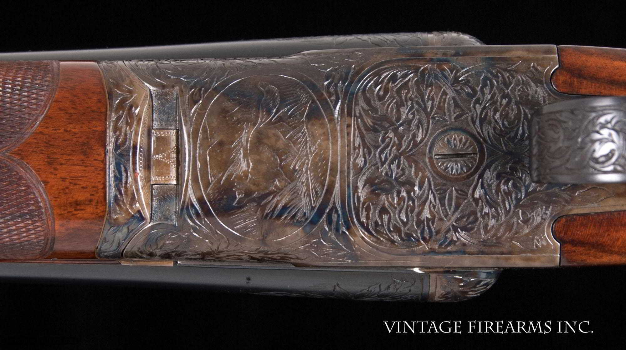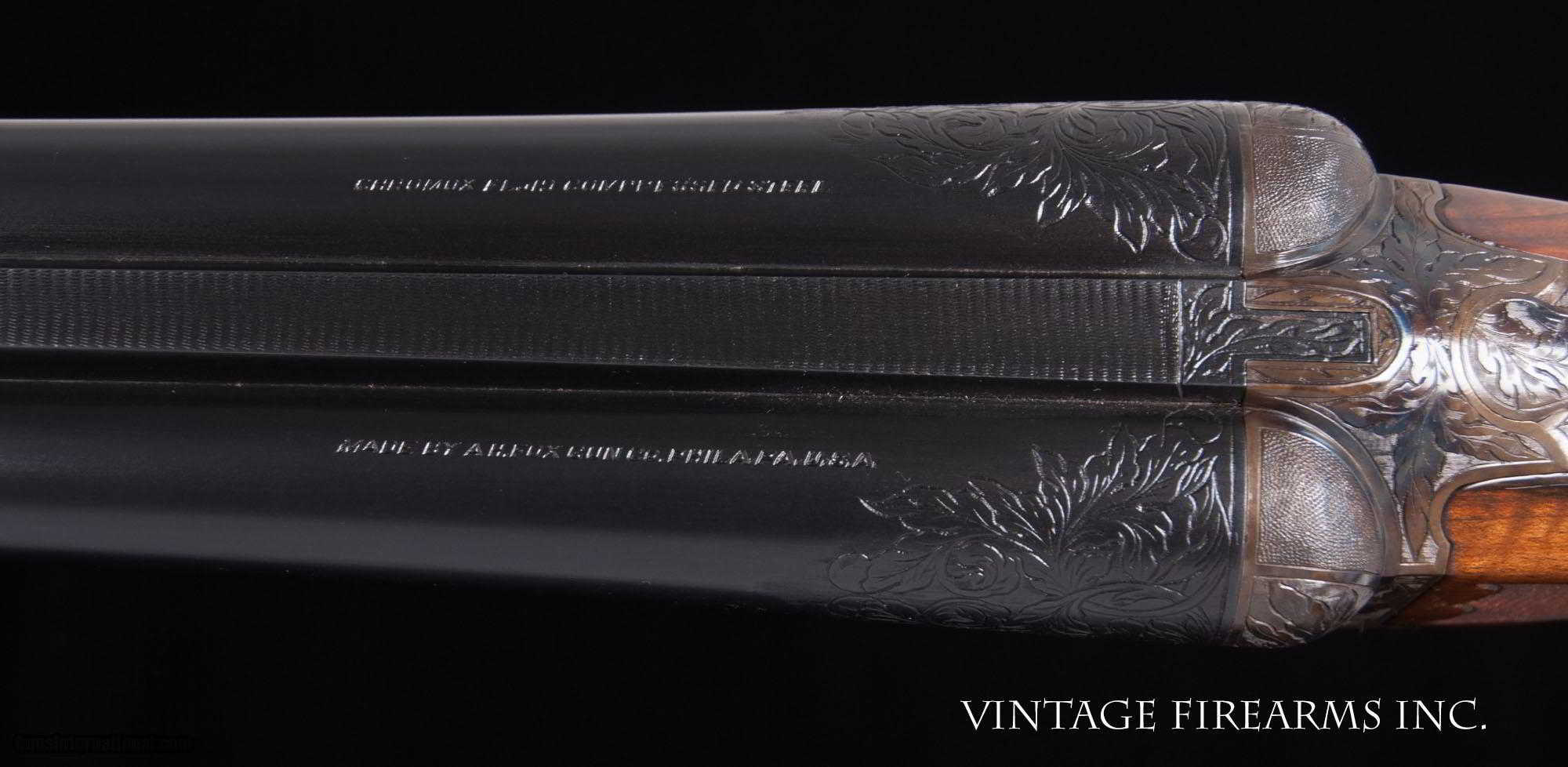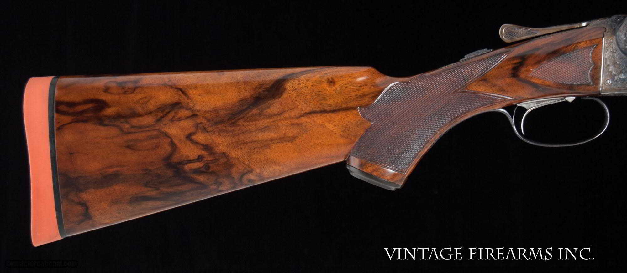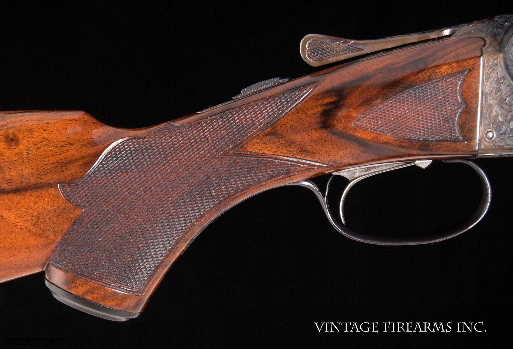 Description: Fox XE 12 Gauge Side-by-Side 6lbs 10oz, KAUTZKY SINGLE TRIGGER, 28" General Specs: Fox, Year 1924, 12 Gauge, 6lbs 10oz, Side by Side Serial Number: 29317 The A.H. Fox XE Grade is truly one of the most handsome American doubles ever produced, with its deeply carved oak leaf engraving on the receiver and barrel wedges, long elegant forends with the buffalo horn inlay cut to a slight schnabel, rebated frames to keep the head of the stock from spreading, frame filed to the shape of the barrels all the way to the top rib, locking screws on the top action screw, delightful checkering on Circassian walnut stocks, all coming together to make a stunning double shotgun. The XE Grade Fox came standard with ejectors and a Silvers pad, and special attention was paid to the chambers, bores, and chokes to create a highly refined shooting machine. This 1924 gun, sn29317 is no exception. Nicely restored with 100% bone and charcoal case color, 99% rust blue, perfect TruOil finish, perfect checkering, 28" #4 weight Chromox barrels, Fox/Kautzky single selective trigger, tight on face and hinge pin, all ready for your upcoming hunting season. It is very rare to find an American double gun in 12ga. that weighs under 7lbs. let alone 6lbs. 10oz.! And with the single selective trigger, this is a very rare combination and a perfect upland gun for grouse and pheasants over dogs. Fox guns have been steadily going up in value and an XE is highly prized. Thanks for looking. Barrels Barrel Length: 28" #4wt chromox Chokes: .003/.007 SK1/SK2 Bores: excellent Bore Diameter: .735/.737 Wall Thickness: .024/.020 % Blue: 99% Chambers: 2 5/8" Ribs: tight Sights: double ivory Action Action: tight, right of center Ejectors or Extractors: ejectors Case Color: 100% Screws: excellent Engraving: clear sharp Trigger Type: factory sst fox/kautzky Trigger Guard Color: 100% blue Stock Type: capped pistol grip/splinter forend/ nice french LOP: 13 5/8" LOP To End Of Wood: 12 7/8" DAH: 2 1/2" DAC: 1 11/16" Cast: 0 Checkering Condition: excellent Butt Treatment: London gun There are more photos upon request. There is a 30 day mechanical warranty on this gun. Call us for full details. Please see all of our fine Vintage Firearms on this . We have many more sxs shotguns for sale and soon to be listed, check back or email us for a preview. Thanks for looking! We employ a full time gunsmith on premises and can perform alterations to suit your needs within a few weeks of purchase. Payment Methods: Money Order, Certified Check, Personal Check, Wire Transfer Inspection Period / Return Policy: Three Days from the date the item was received. Sales Tax: 6% Michigan Only Shipping & Insurance: Ground $140.00 We ship internationally! Item Condition: Used Requires FFL?: Yes If you have any questions about this item or payment, please email or call us directly, at #616-292-6240. Thanks! Jay Shachter, Vintage Firearms, Inc SOLD Curio/Relic: Yes |