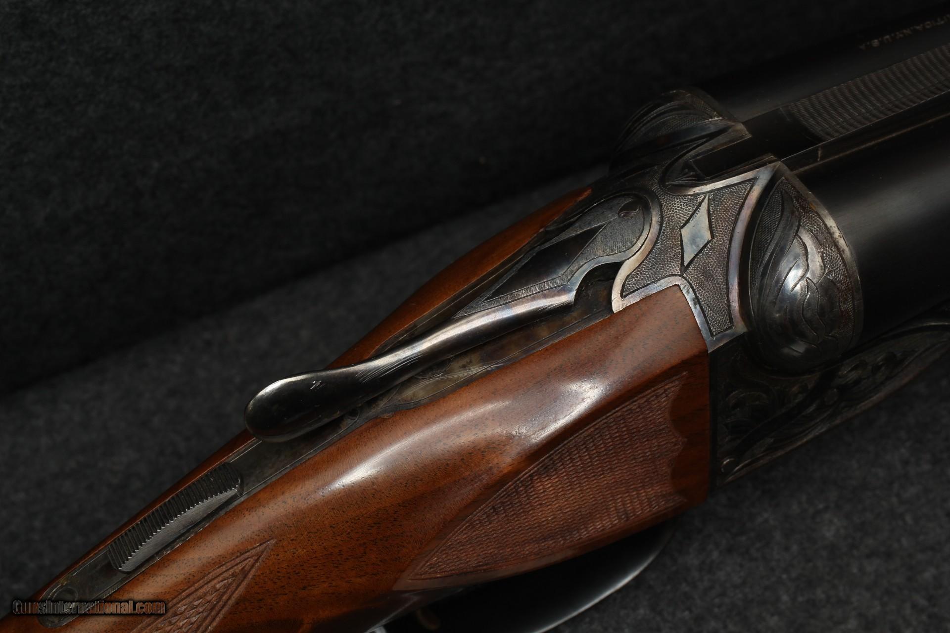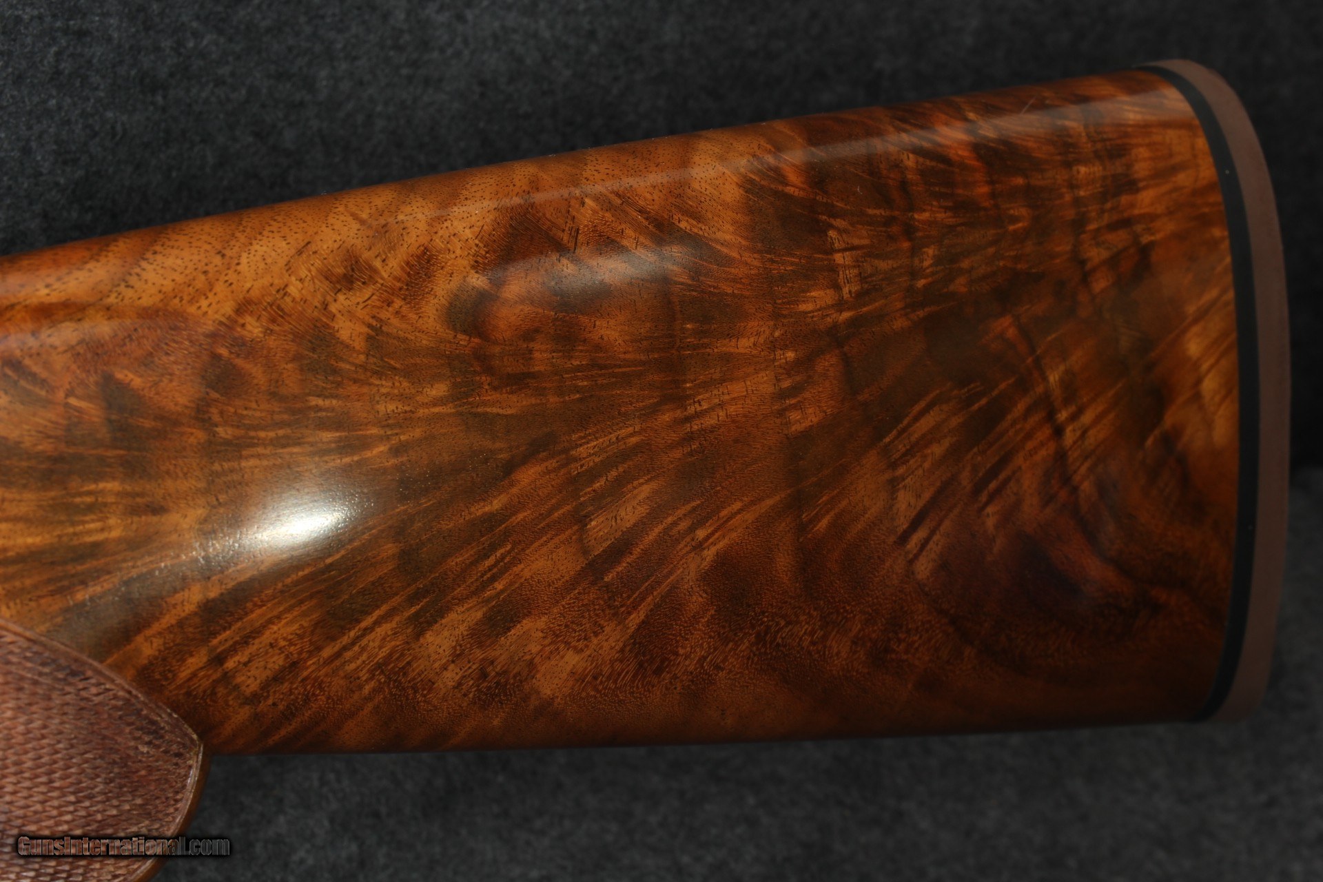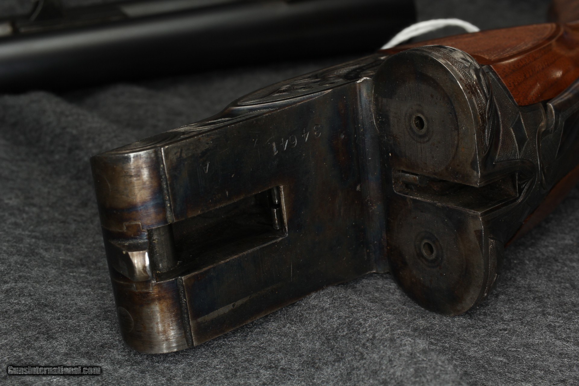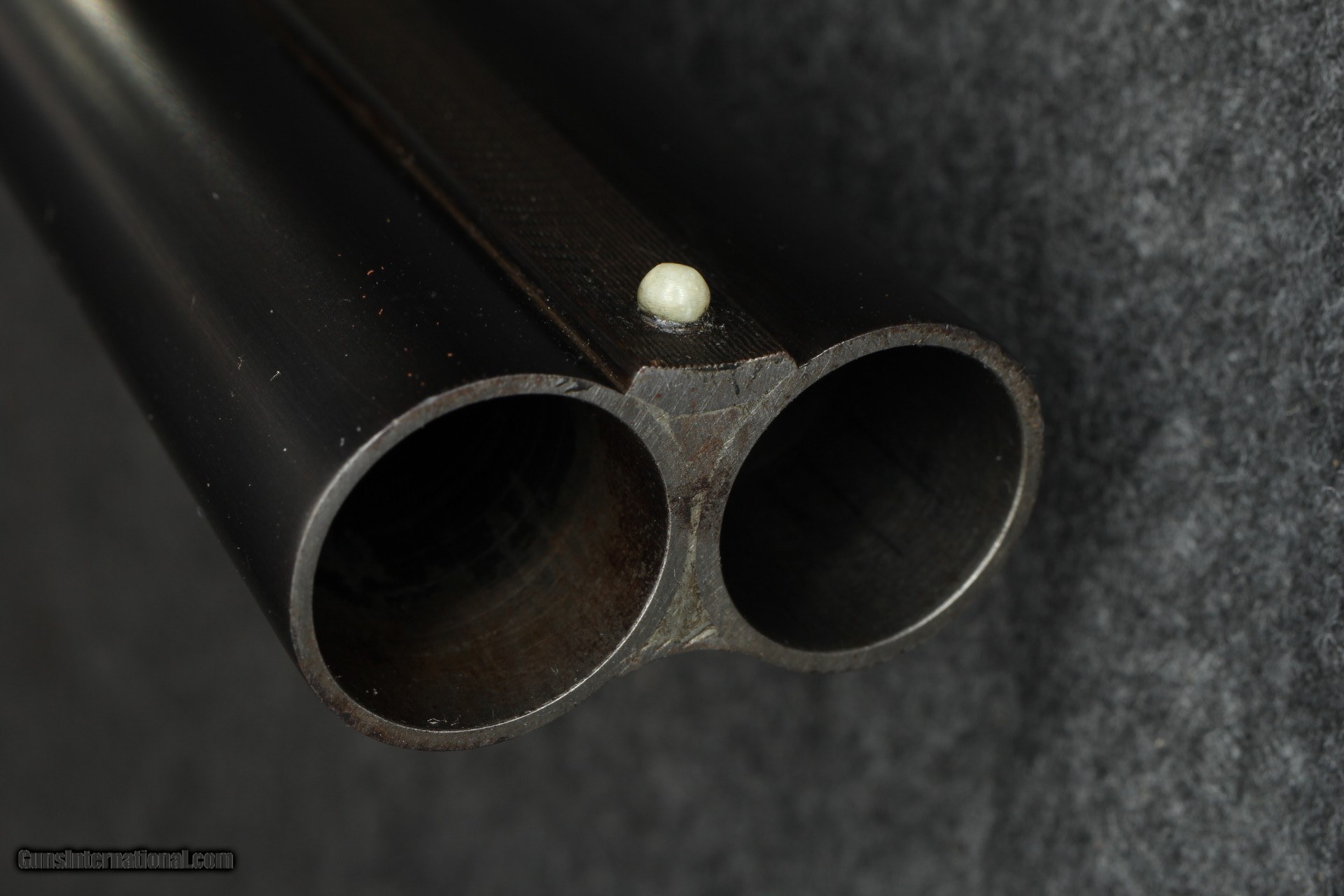 Description: 12ga, serial number 345XX. 30" barrels, 2 3/4" chambers, extractor, barrel selector, ex full and light full. Lee Kunz custom stock with rare single trigger. Barrels retain all original blue. Receiver shows factory engraving pattern with dulling case color. Bores excellent. Well figured beavertail forend, multi-point checkering pattern. Checkering remains crisp. Deely & Edge catch, shows minor engraving. Buttstock has exceptional feather crotch walnut by master stock maker Lee Kunz. Multi-point checkering to Prince of Wales grip. Church steeple pattern on flats behind action. Trigger guard bow retains high percentage original blue with simple engraving. LOP to wood 13", LOP to pad 13 3/4". DAC 1 3/8", DAH 2 3/8". Please call for shipping and insurance amount. More photos available on request. SOLD Curio/Relic: Yes Shotgun Gauge: 12 Gauge |