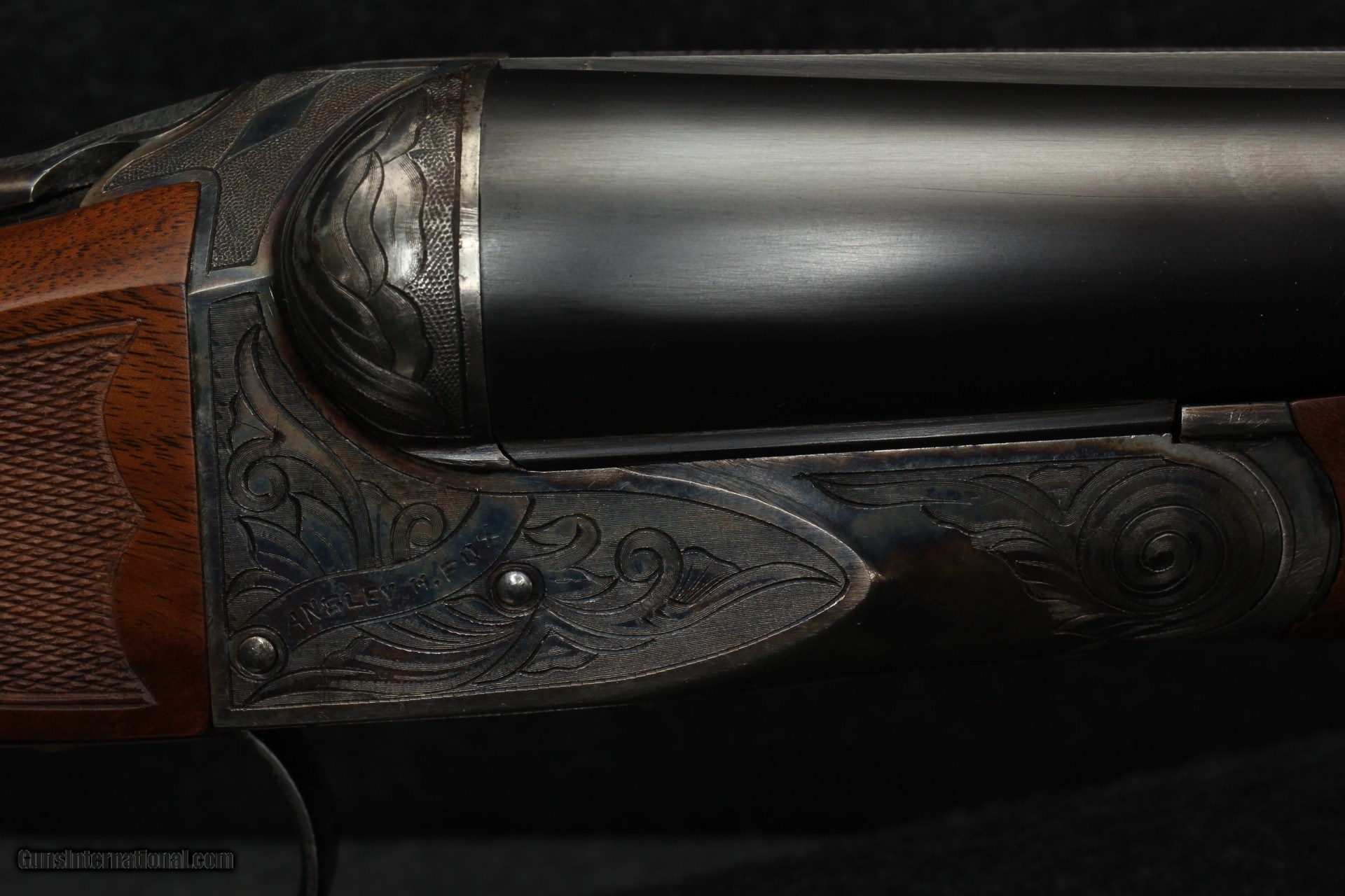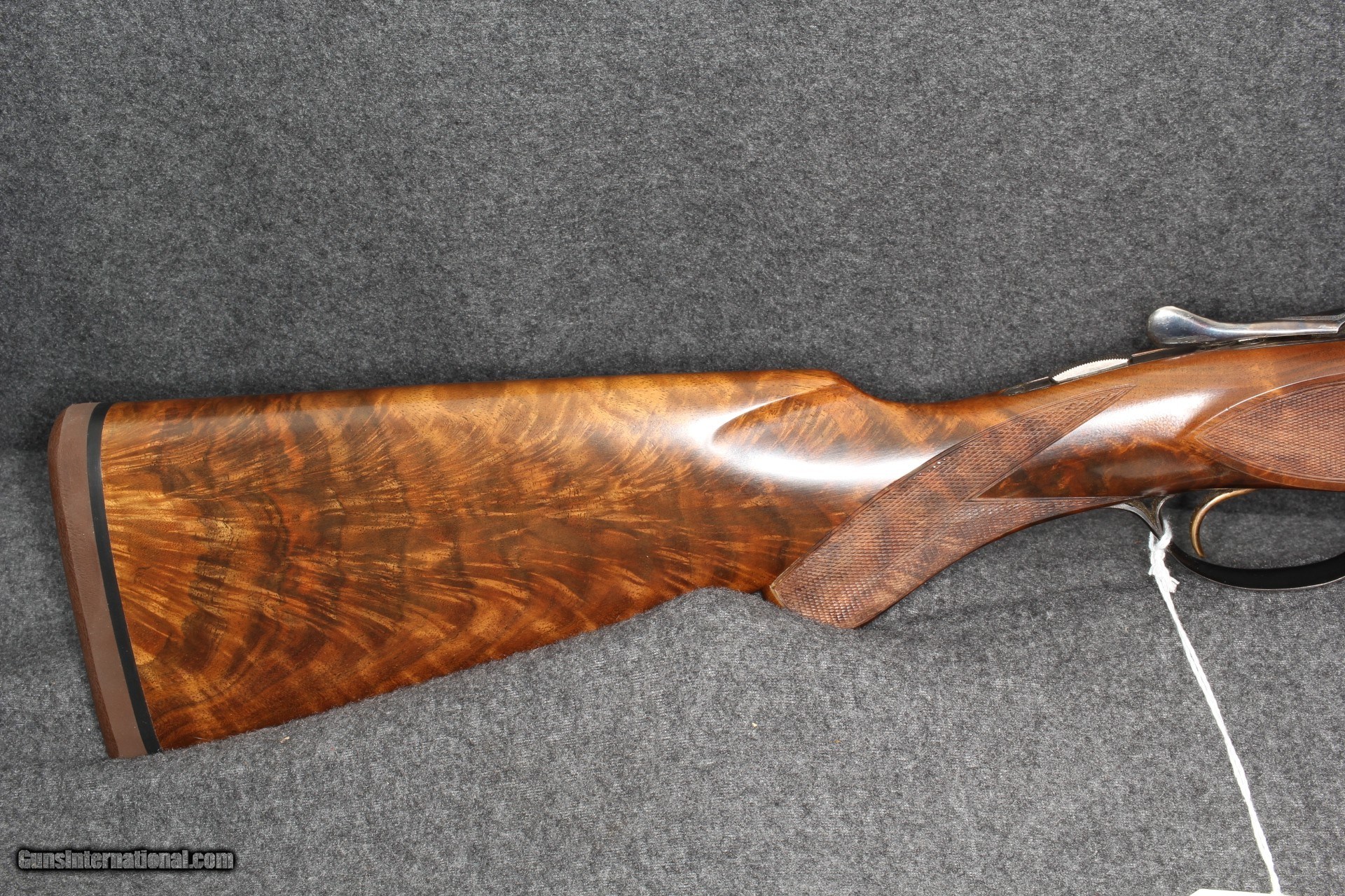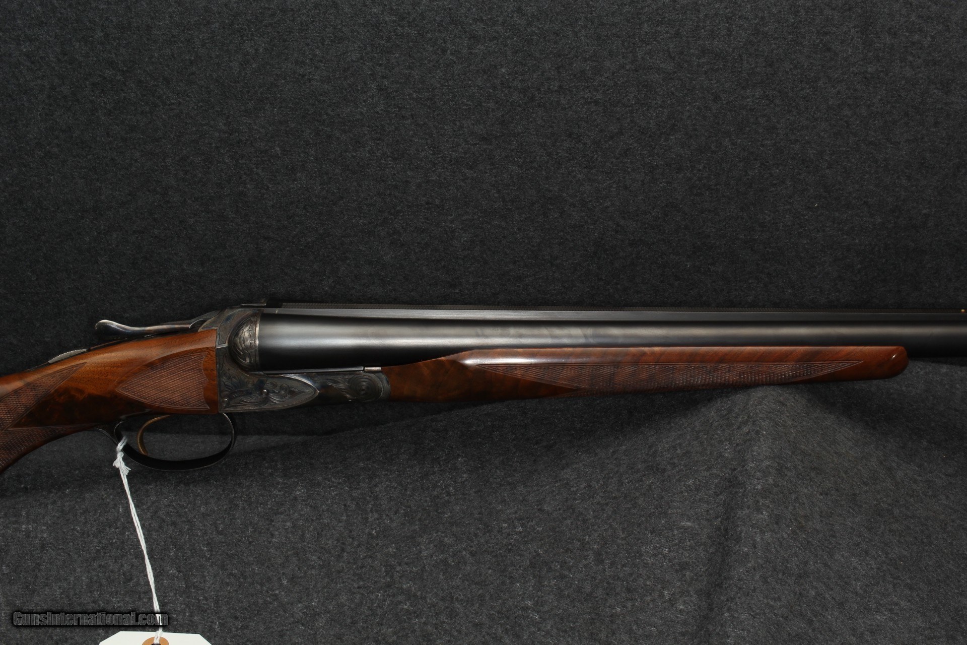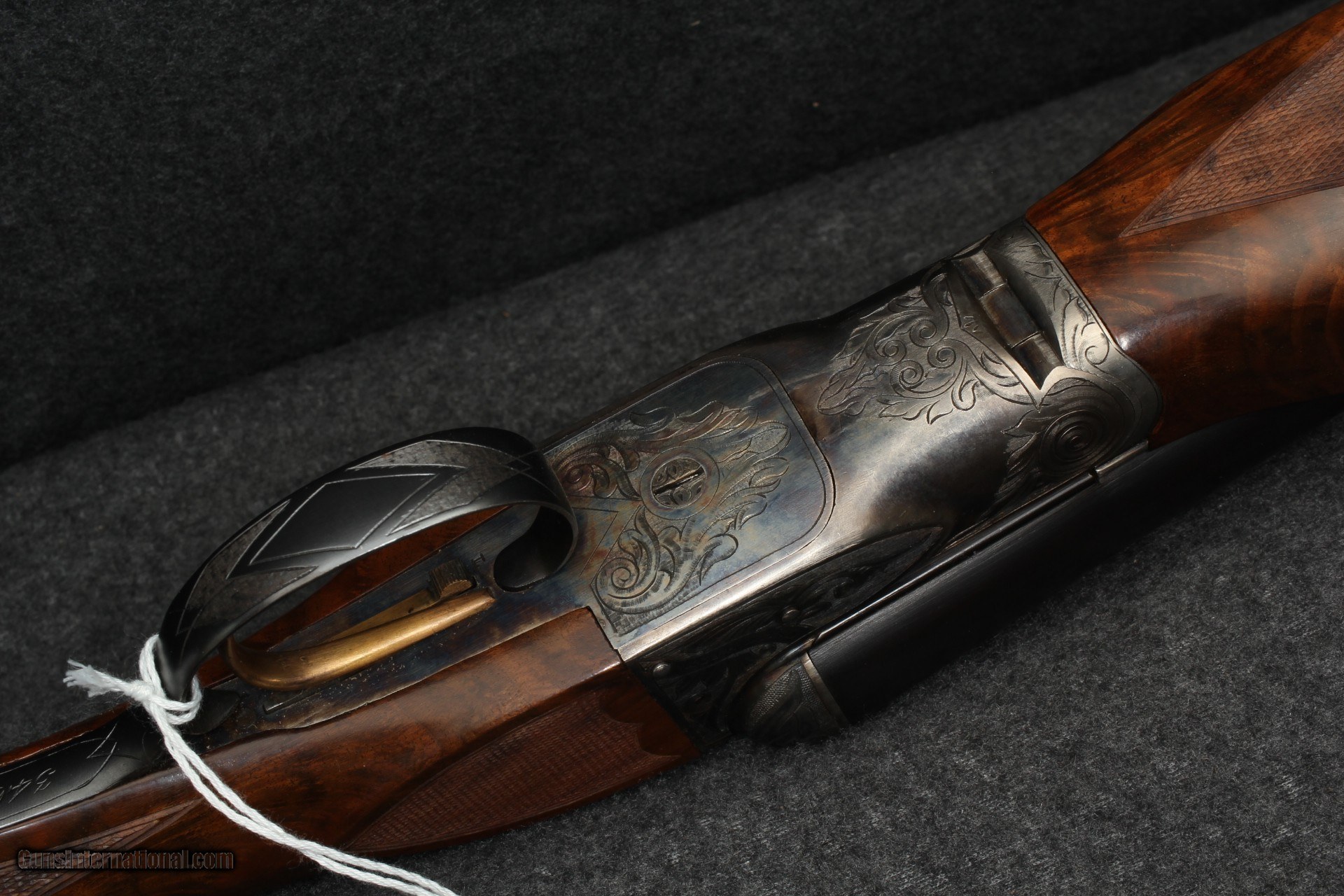 Description: 12ga, serial number 345XX. 30" barrels, 2 3/4" chambers, extractor, barrel selector, ex full and light full. Lee Kunz custom stock with rare single trigger. Barrels retain all original blue. Receiver shows factory engraving pattern with dulling case color. Bores excellent. Well figured beavertail forend, multi-point checkering pattern. Checkering remains crisp. Deely & Edge catch, shows minor engraving. Buttstock has exceptional feather crotch walnut by master stock maker Lee Kunz. Multi-point checkering to Prince of Wales grip. Church steeple pattern on flats behind action. Trigger guard bow retains high percentage original blue with simple engraving. LOP to wood 13", LOP to pad 13 3/4". DAC 1 3/8", DAH 2 3/8". Please call for shipping and insurance amount. More photos available on request. SOLD Curio/Relic: Yes Shotgun Gauge: 12 Gauge |