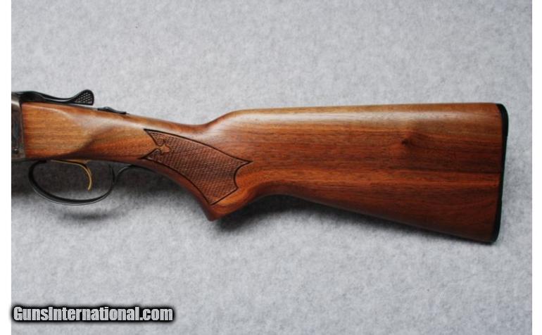 Description: SOLD Manufacturer: 1966 (est.) Caliber Info: 20 Gauge Chambers: 3" - Ejectors Metal Condition: Case-coloered receiver and blued barrels show only the slightest of handling marks. Wood Condition: Stock and forend each display minor handling/use marks. Also, forend checkering is not applied evenly with the lightest impressions appearing on the left side. Forend is also noticeably lighter in color on the left side. Bore Condition: Bright bores Barrels: 26" Ventilated rib Triggers: Single selective trigger Stock: Press checkered, pistol grip hardwood Stock Dimensions: LOP: 13-5/8", DAC: 1-3/4", DAH: 2-1/2 Fore End: Press checkered, beavertail hardwood Butt Pad: Serrated, black plastic buttplate Weight: 7-1/4 lbs. Sights: Metal front and mid-beads Chokes: Fixed Chokes: Improved Cylinder & Modified Extras: None. Item Location: East Hartford, CT |