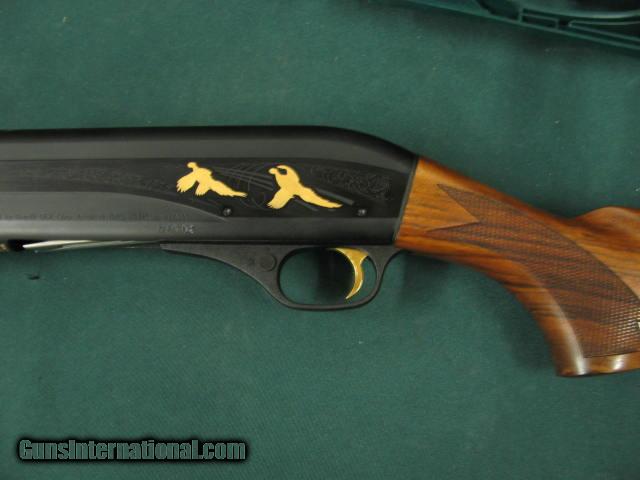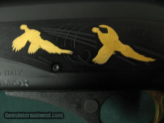 Description: 6185 Franchi Grifone 20 gauge 24 inch barrels, ic mod full chokes wrench, oiler, cased papers, 99% condition, 4 gold birds, oil finish. as new with papers and correct case. SOLD |