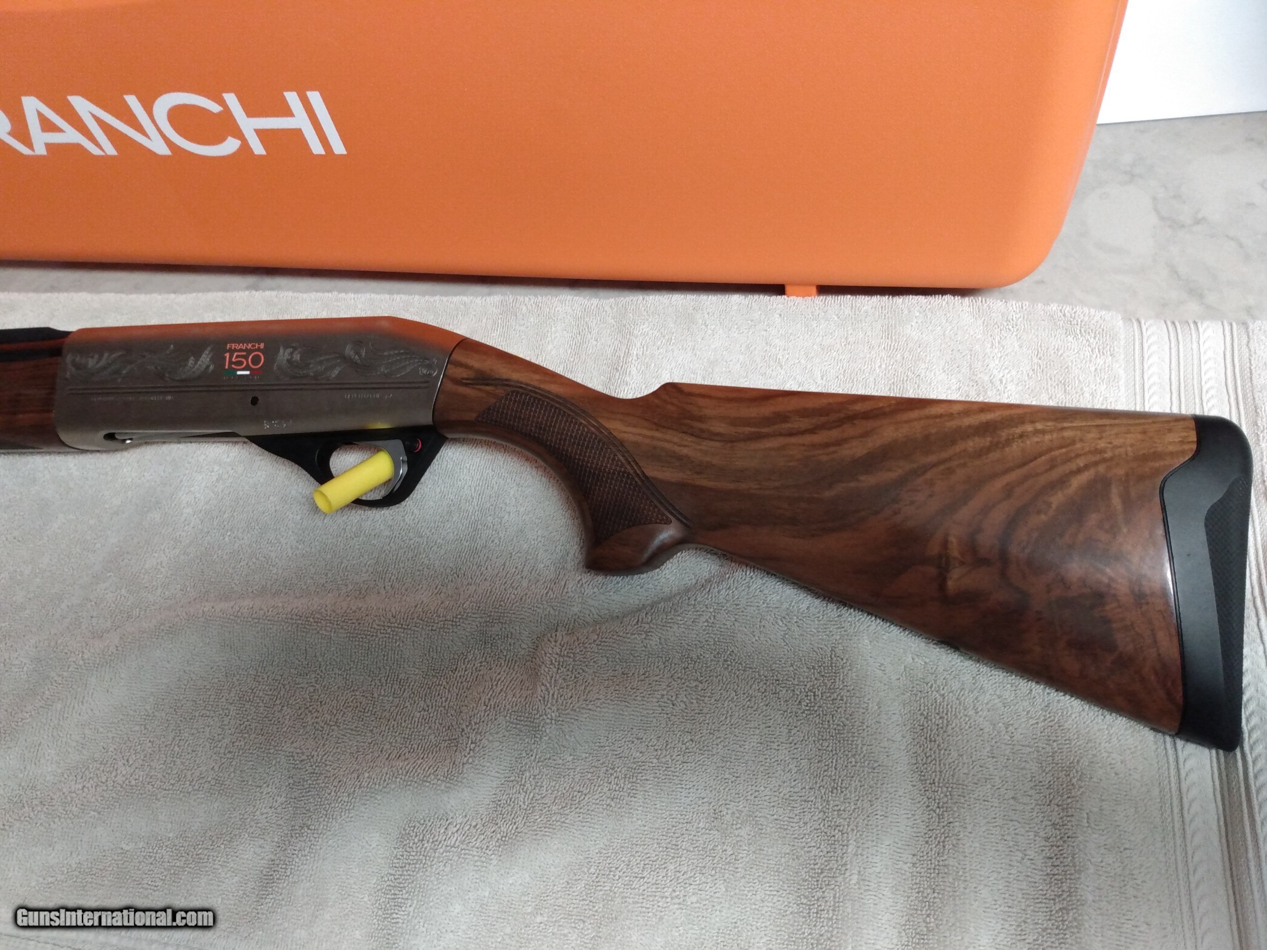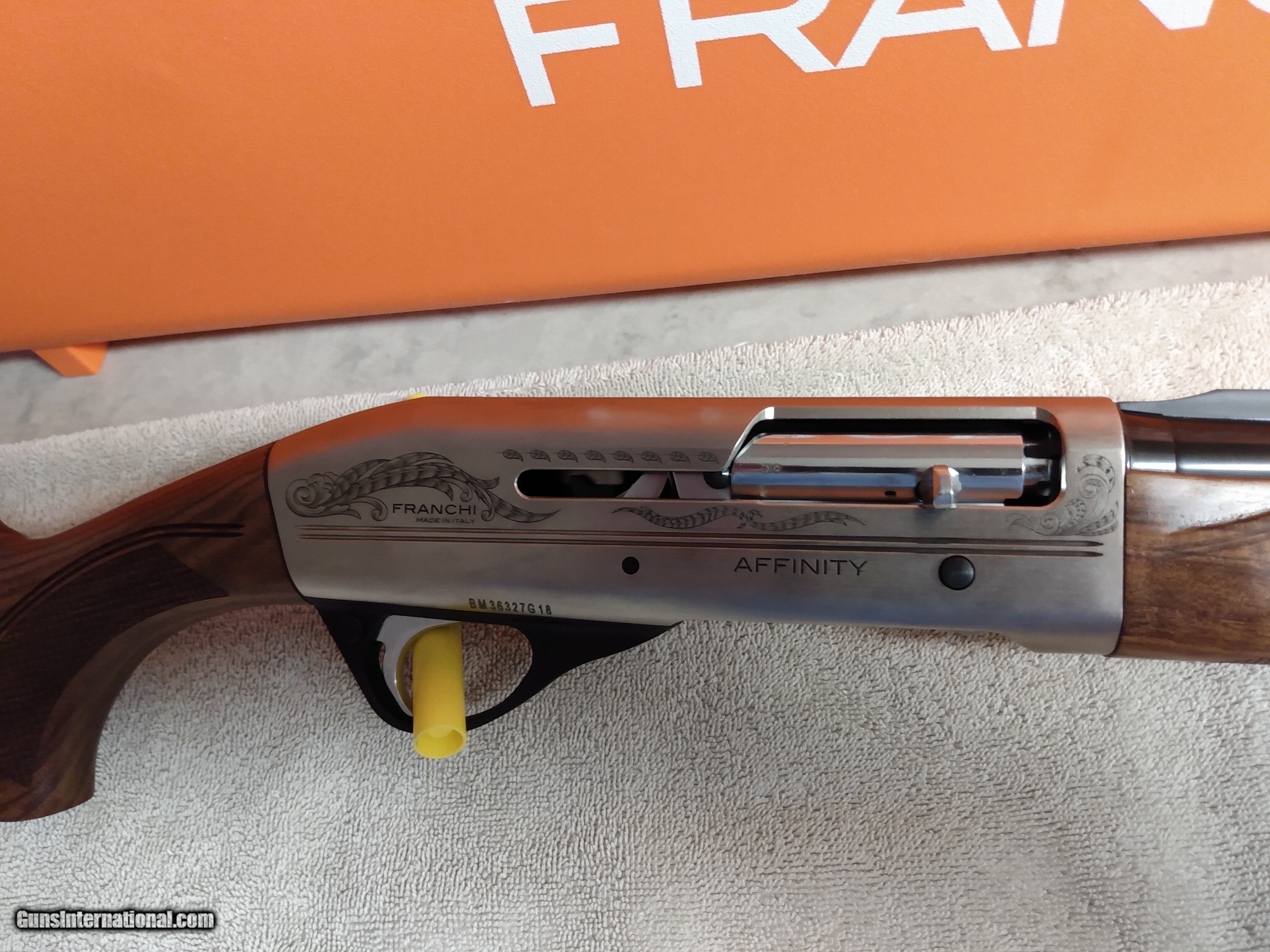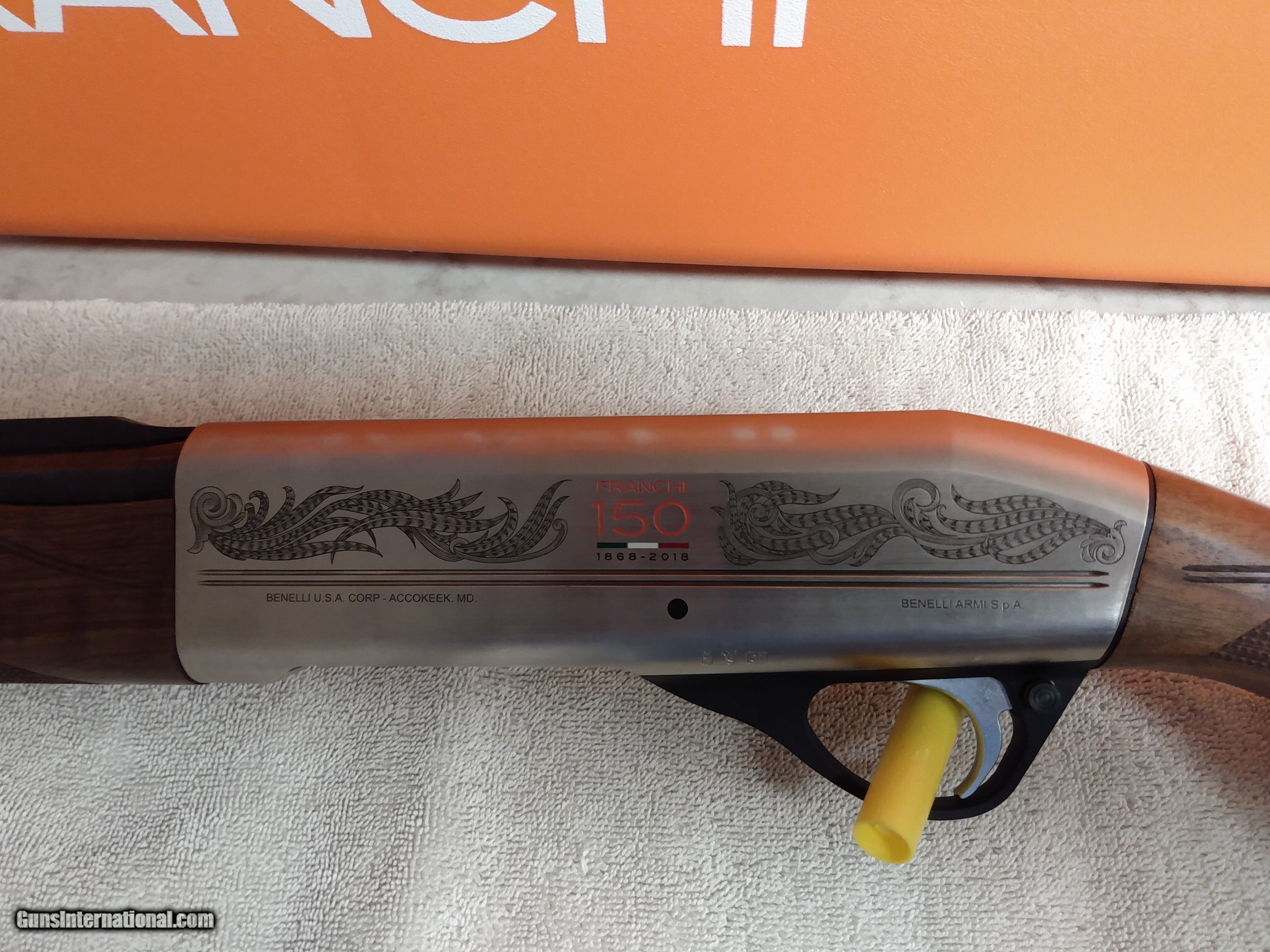 Description: Franchi 150th Anniversary Affinity 3 semi-automatic shotgun. This 20 gauge shotgun from Franchi, a company with a proud legacy of designing and manufacturing some of the finest Italian shotguns on the market, features a slim receiver with fine feather themed engravings on both sides as well as the Franchi 150th Anniversary Logo on the left-hand side. Product Features