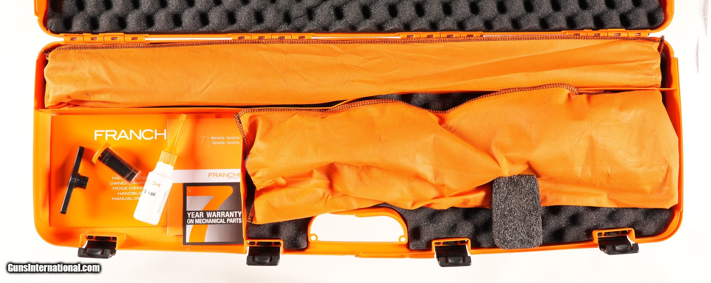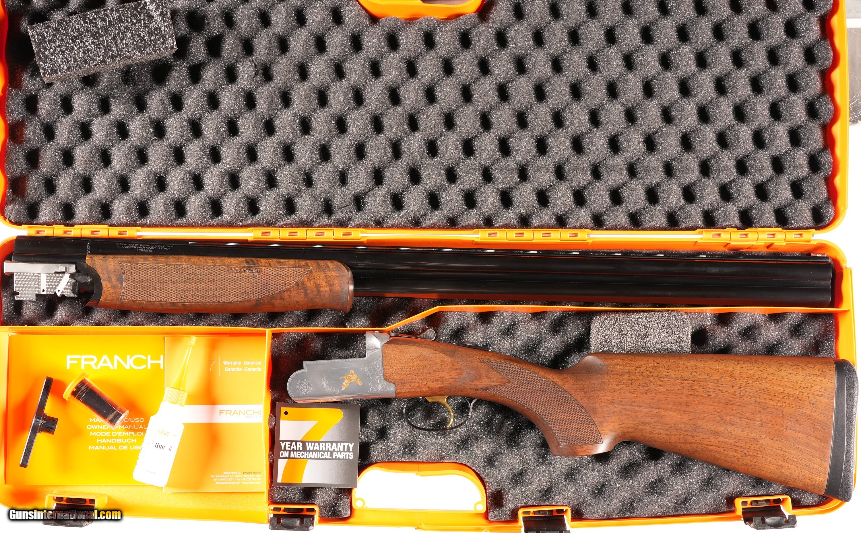Description: Franchi Elegante Over/Under Shotgun – 12 Gauge – 30" Barrels, Coin-Finished Receiver Serial #FF041853 | 3" Chambers | Interchangeable Chokes | Factory Case Included Elegant and versatile Franchi Elegante Over/Under 12 Gauge, featuring 30" vent rib barrels, 3" chambers, and a single selective trigger with automatic ejectors. Fitted with interchangeable choke system (3 tubes + wrench included) and a gold-accented, coin-finished receiver with tasteful engraving. Stocked in oil-finished checkered walnut with a factory recoil pad, offering a comfortable 14 ½" length of pull. Comes in original factory luggage case.
