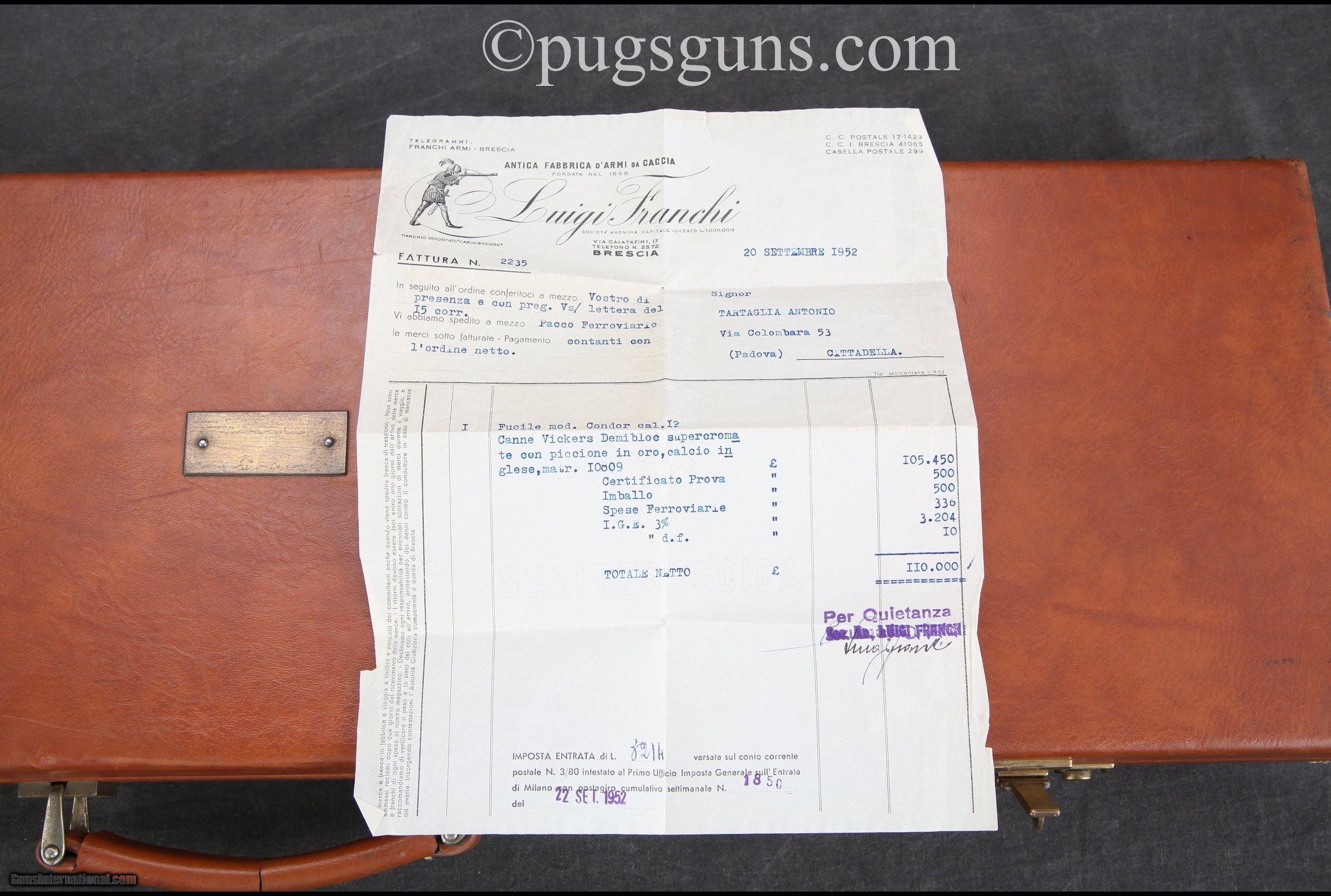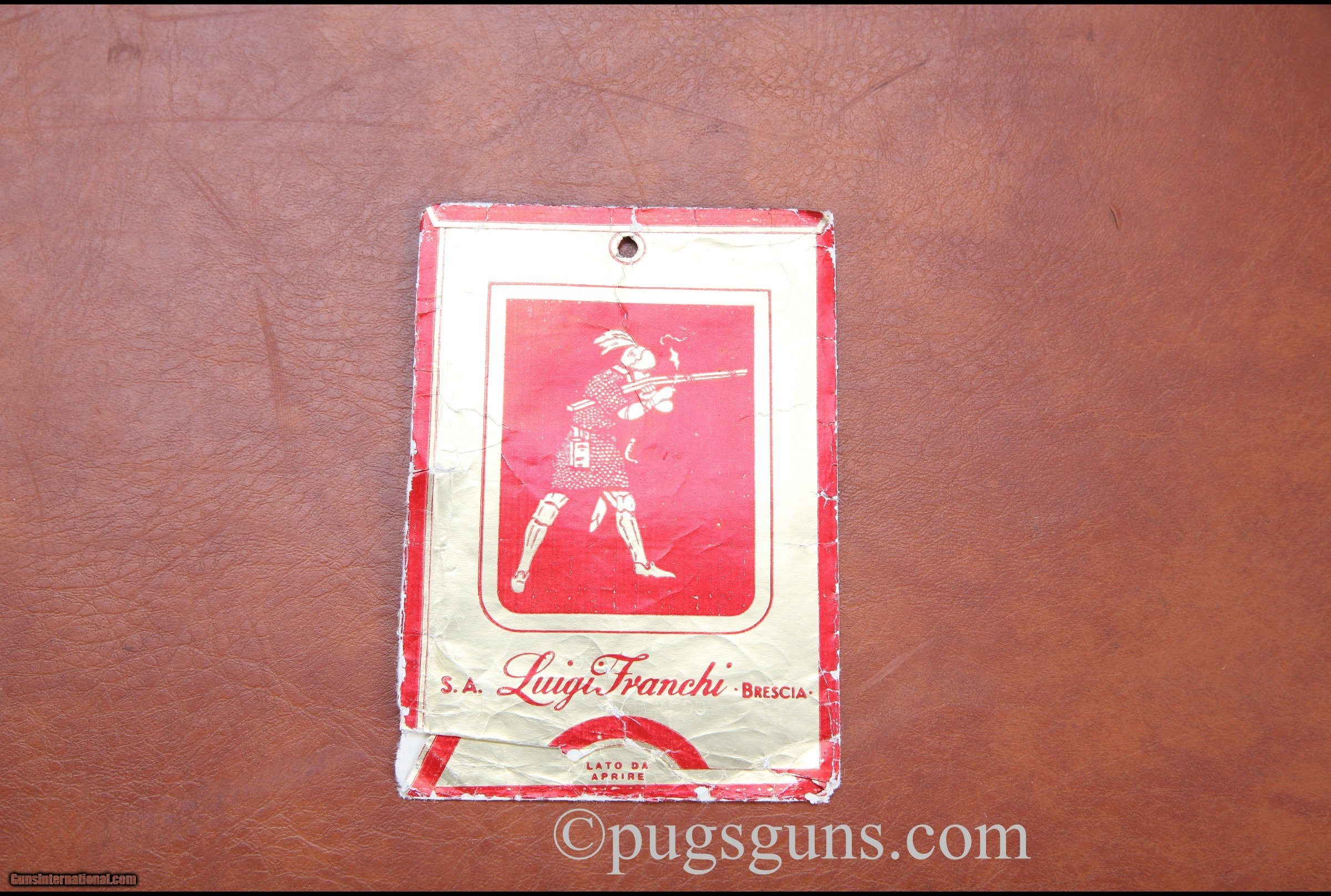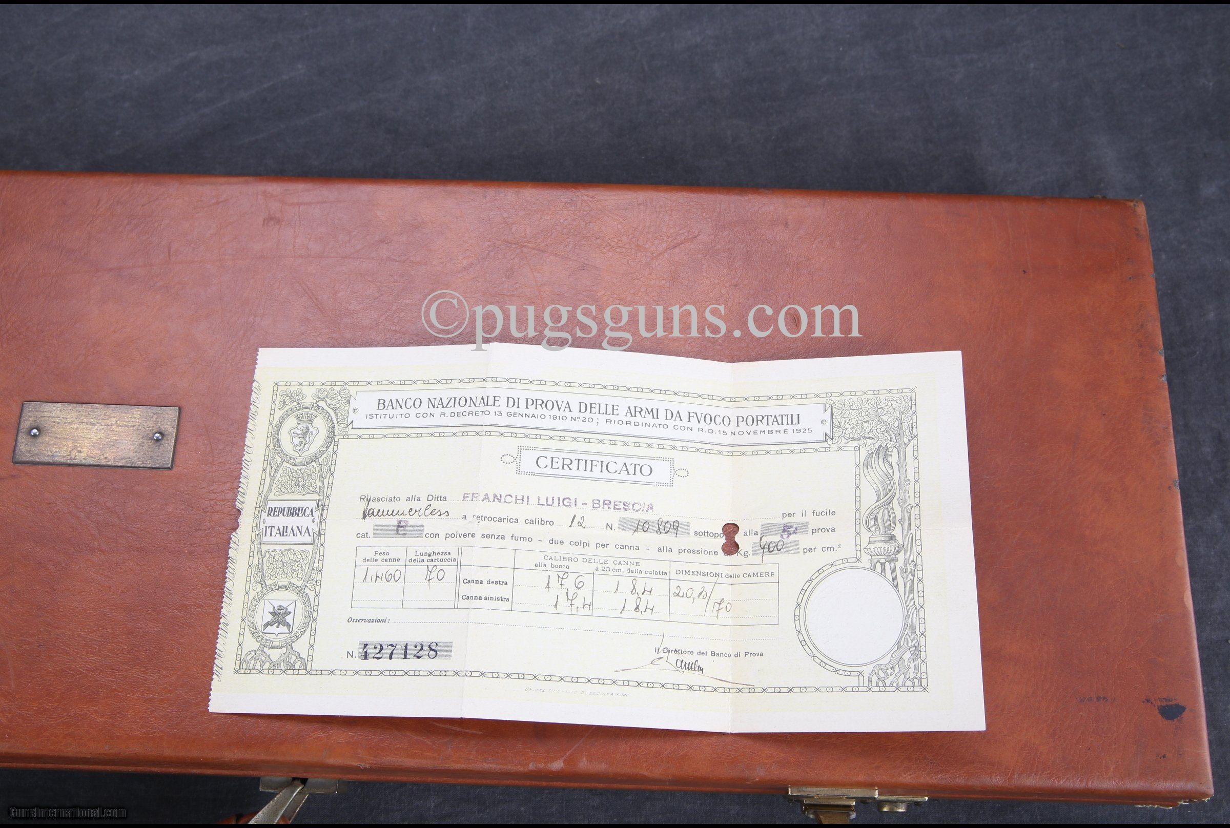 Description: Cased with original paperwork SOLD Manufacturer: Luigi Franchi Model: Pigeon Grade Serial Number: 10809 Ejectors: Yes Barrels: 28 3/8 inches Action: SE Triggers: Double Triggers Gauge Info: 12 Gauge Stock Comb: 1 1/4 inches Stock Heel: 2 inches Fore End: Splinter Butt Pad: 1 inch LOP: 14 7/8 inches Weight: 7 lbs. 4 oz. |