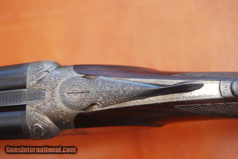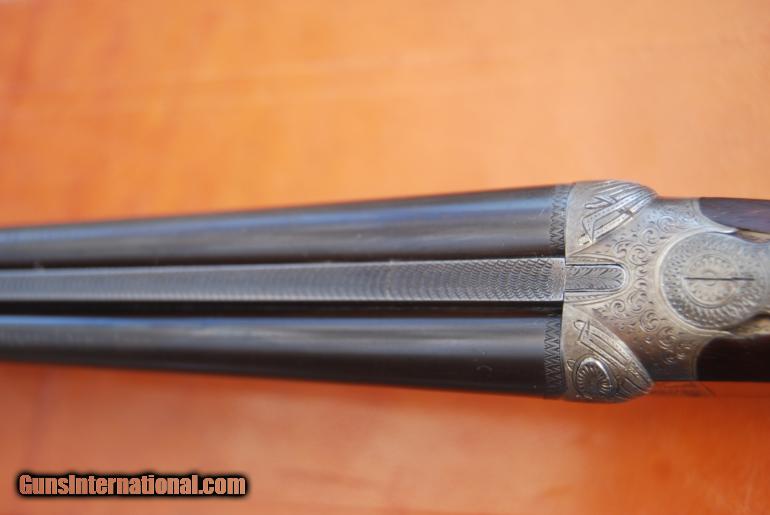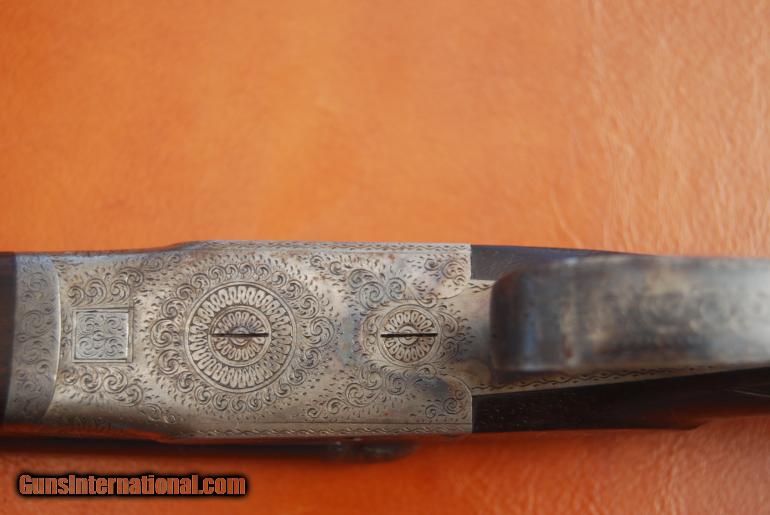 Description: August Francotte 14 .410, 26" bbl, 2 1/2" chambers, m/f, 14 1/8" LOP, 2 5/8" DH, 1 3/8" DC, 4lb. 2oz., hand rubbed oil finish. All original, untouched, unmolested gun. Manufactured in 1925, with letters and other documentation from Griffin & Howe, the authority on Francottes. Stamped Francotte Choke Bore. Gun is in about 90% condition, no cracks, dents, gouges or deep scratches in wood. BBl retain most of their original color. Metal is in excellent condition with about 85% blue remaining. Engraving is also excellent. Trades considered. Lower price. SOLD |