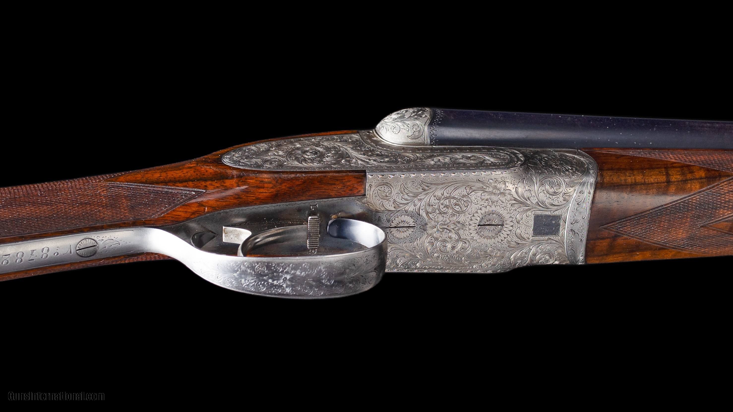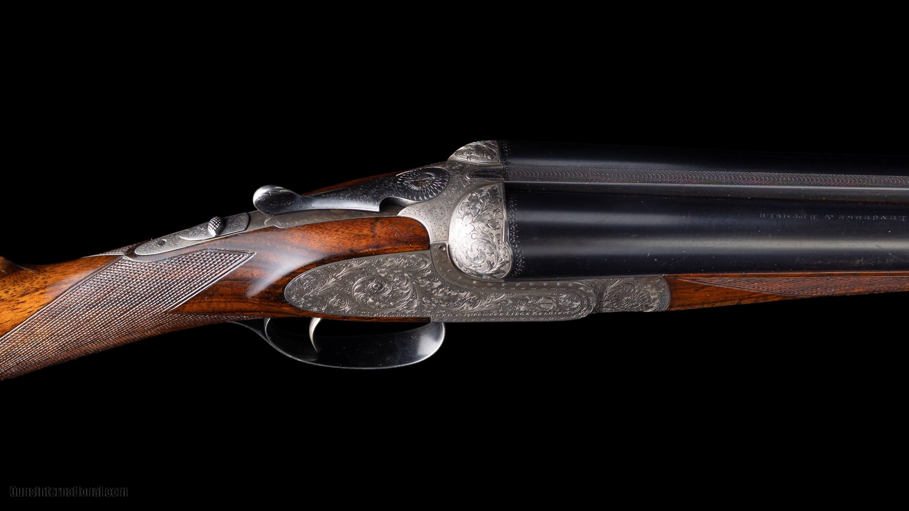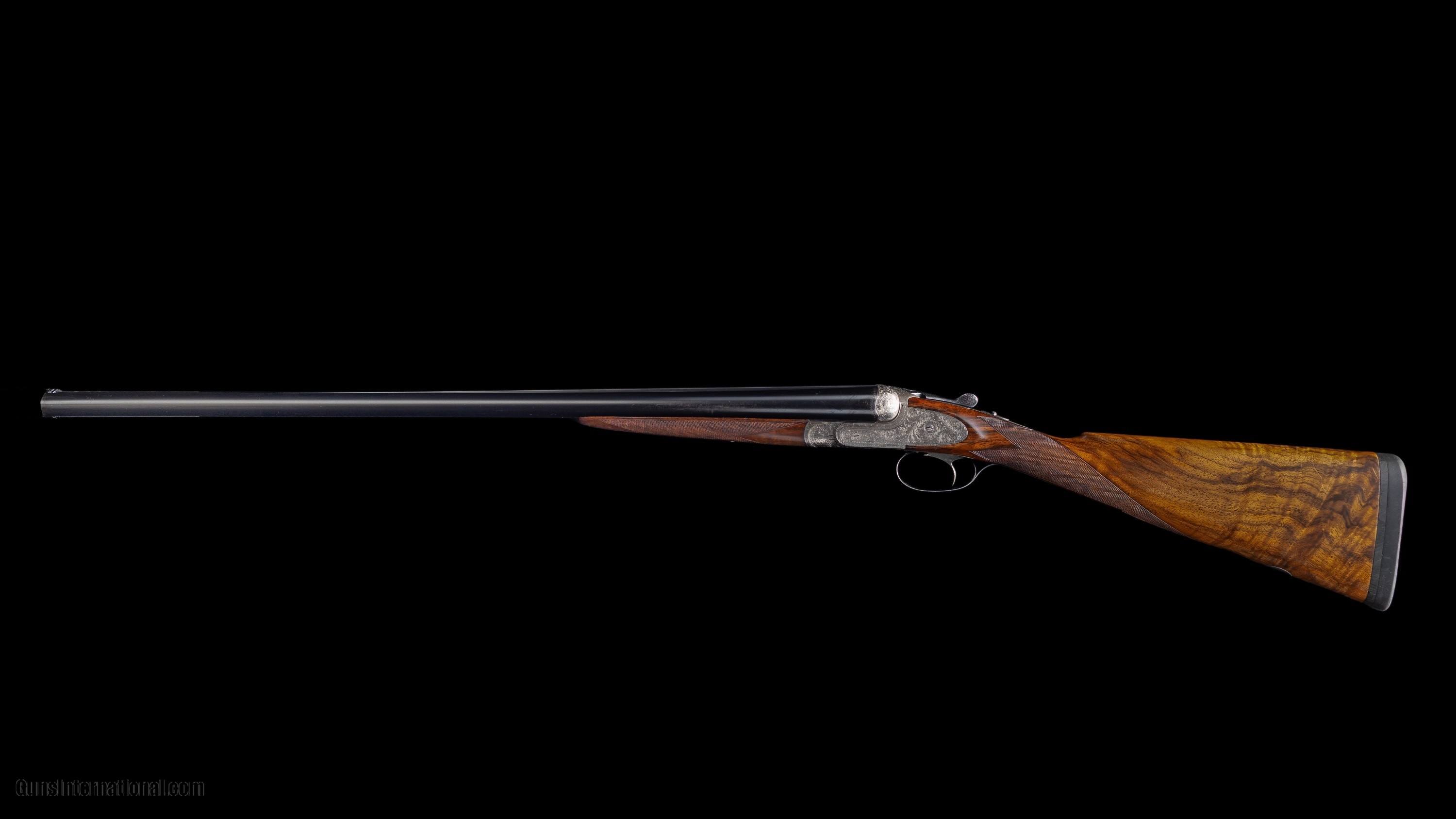 Description: Offered here is an elegant A. Francotte "Jubilee" sidelock/boxlock-style side-by-side shotgun in 12 gauge, serial number 87825, presented in excellent overall condition. This finely finished Jubilee model features 28″ round barrels, 2 3/4″ chambers, and a smooth, concave filed game rib with a single brass bead. The action is fitted with a single Miller-style mechanical trigger, and the stock is an English straight grip in high-quality walnut finished with an oil finish and a leather-covered pad. The gun balances beautifully at 6 lbs 12 oz, making it an excellent sporting arm built for classic field use. Key specifications - Maker / Model: A. Francotte — "Jubilee" (Jubilee family) - Gauge: 12 bore (12 ga) - Barrels: 28″, round - Chamber: 2 3/4″ - Chokes: Screw-in choke set (set of 5) - Rib: Smooth, concave filed game rib with single brass bead front sight - Trigger: Single Miller mechanical trigger (non-selective) - Stock: English straight grip, oil finish, leather-covered pad - Length of Pull: 14 1/2″ over leather pad - Drops: Drop at comb: 2 1/2″ · Drop at heel: 1 3/4″ - Cast: -0- (neutral) - Weight: 6 lbs 12 oz - Serial Number: 87825 - Condition: Excellent overall — mechanics are crisp, metal finishes strong, and wood is sound with attractive figure Description A. Francotte’s Jubilee line represents the maker’s higher-grade commercial work, and this example is a textbook representation: refined engraving, crisp factory fit, and a balanced sporting configuration. The single Miller trigger provides a classic, clean pull, while the screw-in choke set (five capacities included) allows the gun to be tailored to a wide range of shot sizes and field conditions. The 28″ barrels and 6 lbs 12 oz balance make this an ideal walking and upland gun — light enough for long days, yet substantial enough to present confidently for driven or standing game. The concave filed rib and single brass bead present a traditional hunting profile that frames targets cleanly in the field. Condition & mechanical notes This Jubilee is in excellent overall condition. The metalwork shows a healthy, even finish with light, sympathetic handling marks commensurate with careful use. The action is tight with positive lockup and smooth ejector function (if ejectors present), and the single Miller trigger functions crisply. The stock is well-figured, free of cracks or repairs, and the checkering remains sharp. Bores and chambers appear strong for the age (detailed bore scope photos and a gunsmith report are available on request). Provenance & verification Serial number 87825 is provided for reference. A factory ledger/history letter or maker’s archival search is recommended for precise build date and original specification; this can be supplied to serious buyers upon request. Belgian proof marks and barrel stamps are visible and can be documented in high-resolution photographs for buyer review. Why buy this gun This Francotte Jubilee combines old-world Belgian gunmaking with practical sporting ergonomics. It is a rare chance to acquire a finely made, well-balanced 12-gauge Jubilee in excellent condition — a collectible shotgun that is equally well-suited for regular field use or as part of a focused sporting collection. Shotgun Gauge: 12 Gauge Manufacturer: A. Francotte Model: Jubilee Serial Number: 87825 Barrel Length: 28 Chambers: 2 3/4 Condition: Excellent Metal Condition: Excellent Wood Condition: Excellent Bore Condition: Excellent Barrel Type: SxS Triggers: Single Miller mechanical trigger (non-selective) Stock Comb: 1 3/4 Stock Heel: 2 1/2 LOP: 14 1/2 Rib: Smooth, concave filed game rib Weight: 6 lbs 12 oz Sights: Single brass bead front sight Chokes: Screw in -5 choke set Item Location: Michigan Grips: English straight grip Price: $12,999.00 Buy Now Contact Seller |