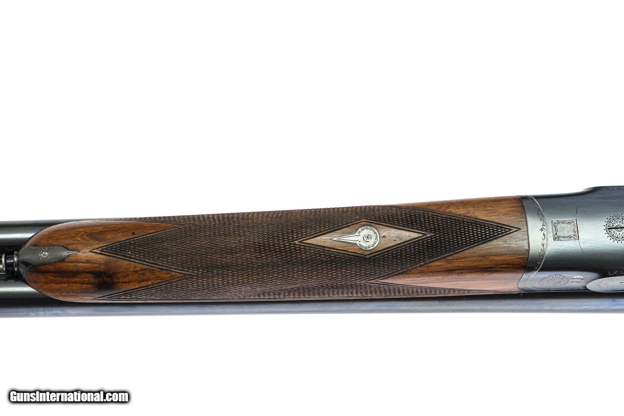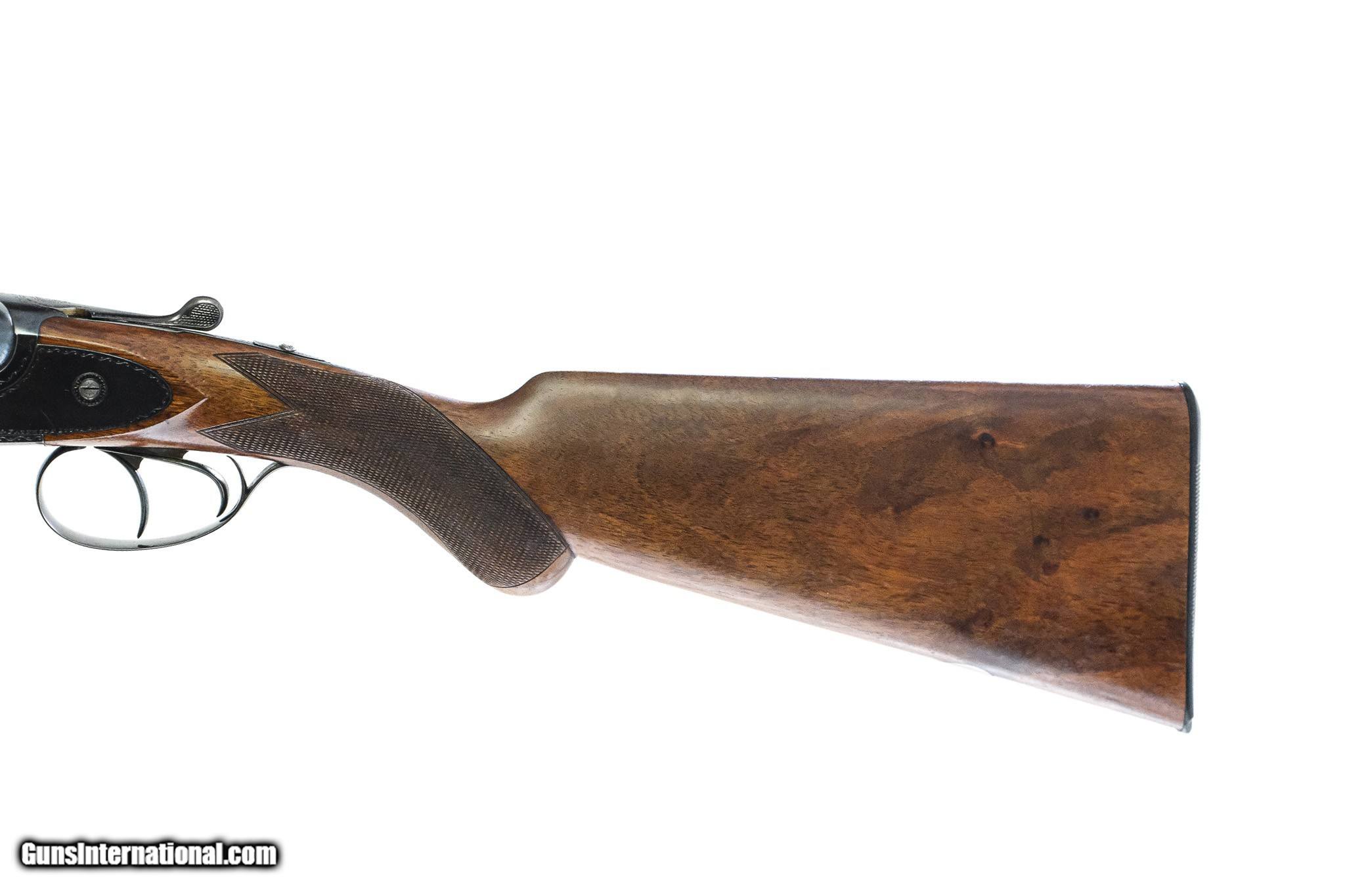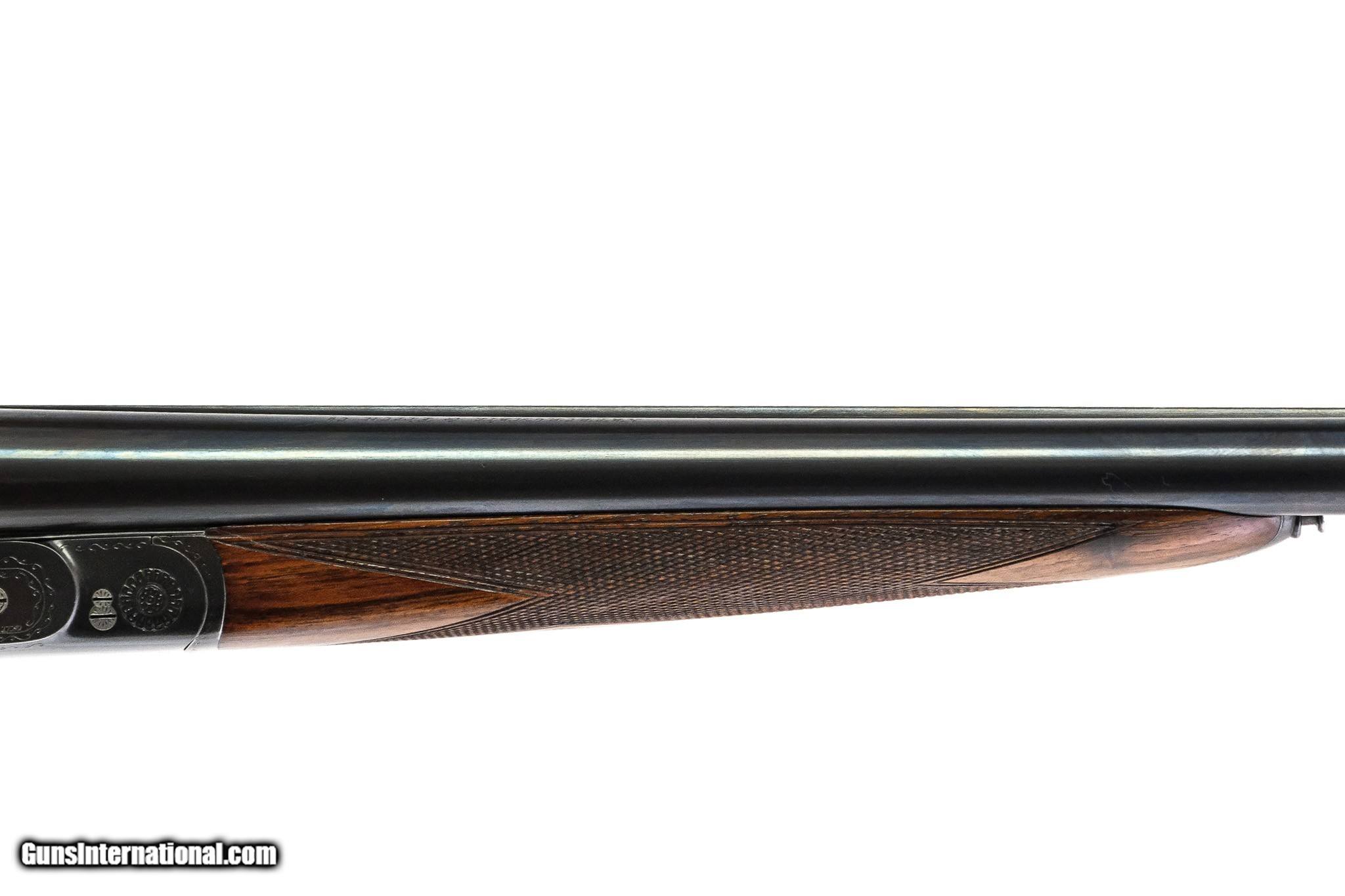 Description: A. Francotte - Jubilee, SxS, 20ga. 26" Barrels Choked IC/M (.006”/.015”). Round knob stock, factory serrated butt plate, double triggers, automatic ejectors, side clips, splinter forend, game gold oval, imported by Abercrombie and Fitch in 1940, sideplated gun with boarder engraving over a blued finish, gun remains in very good overall condition, 5lb., 4oz makes this the perfect field gun, available for immediate delivery. Inv: 76294 5 lbs. 4 oz. 14 ½” x 1 ½” x 2 ¼” $4,750.00 SOLD |