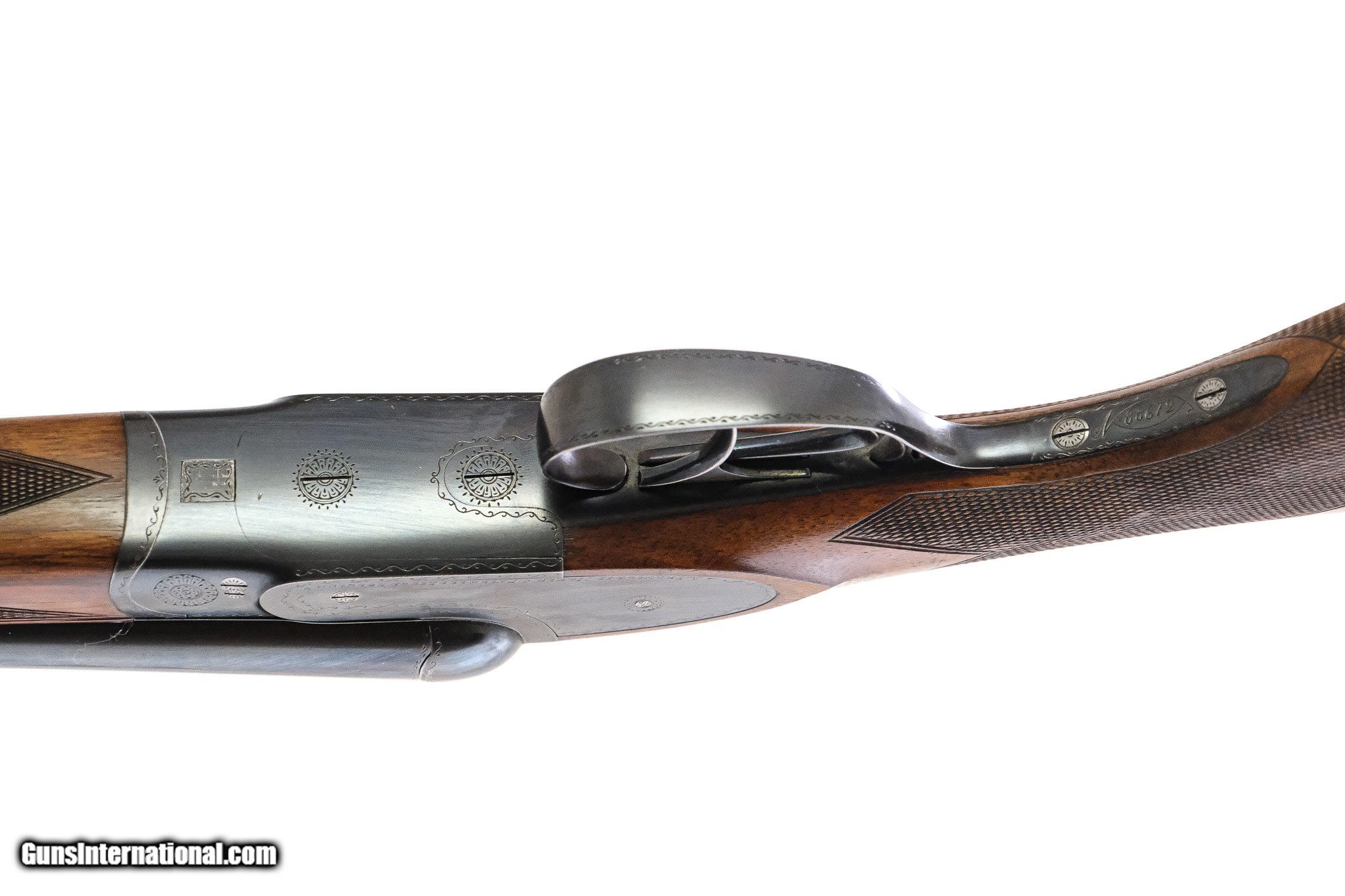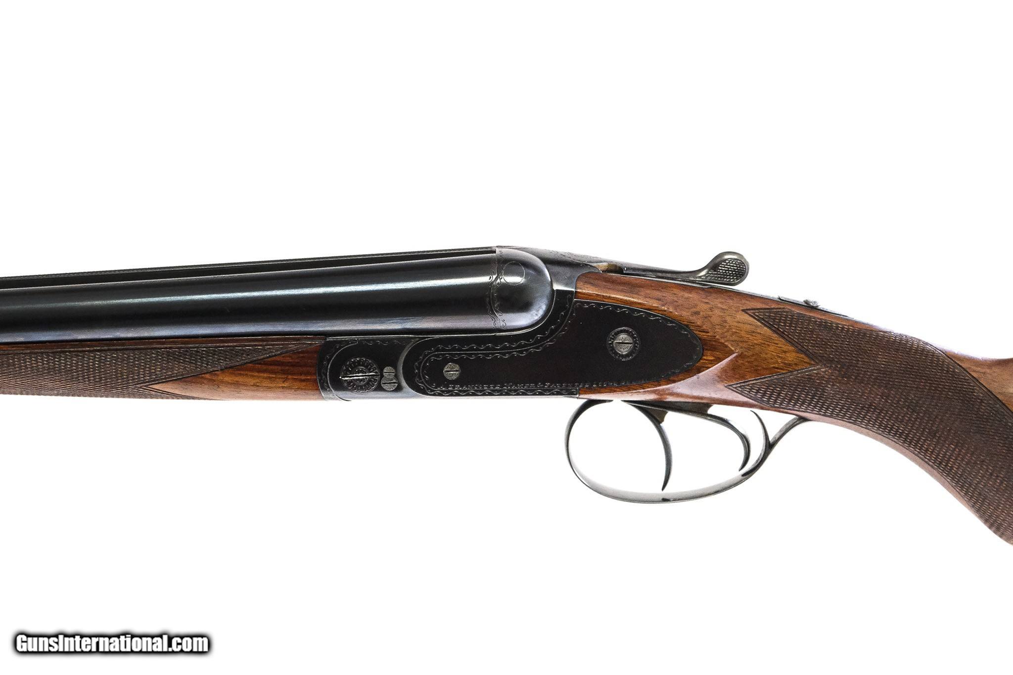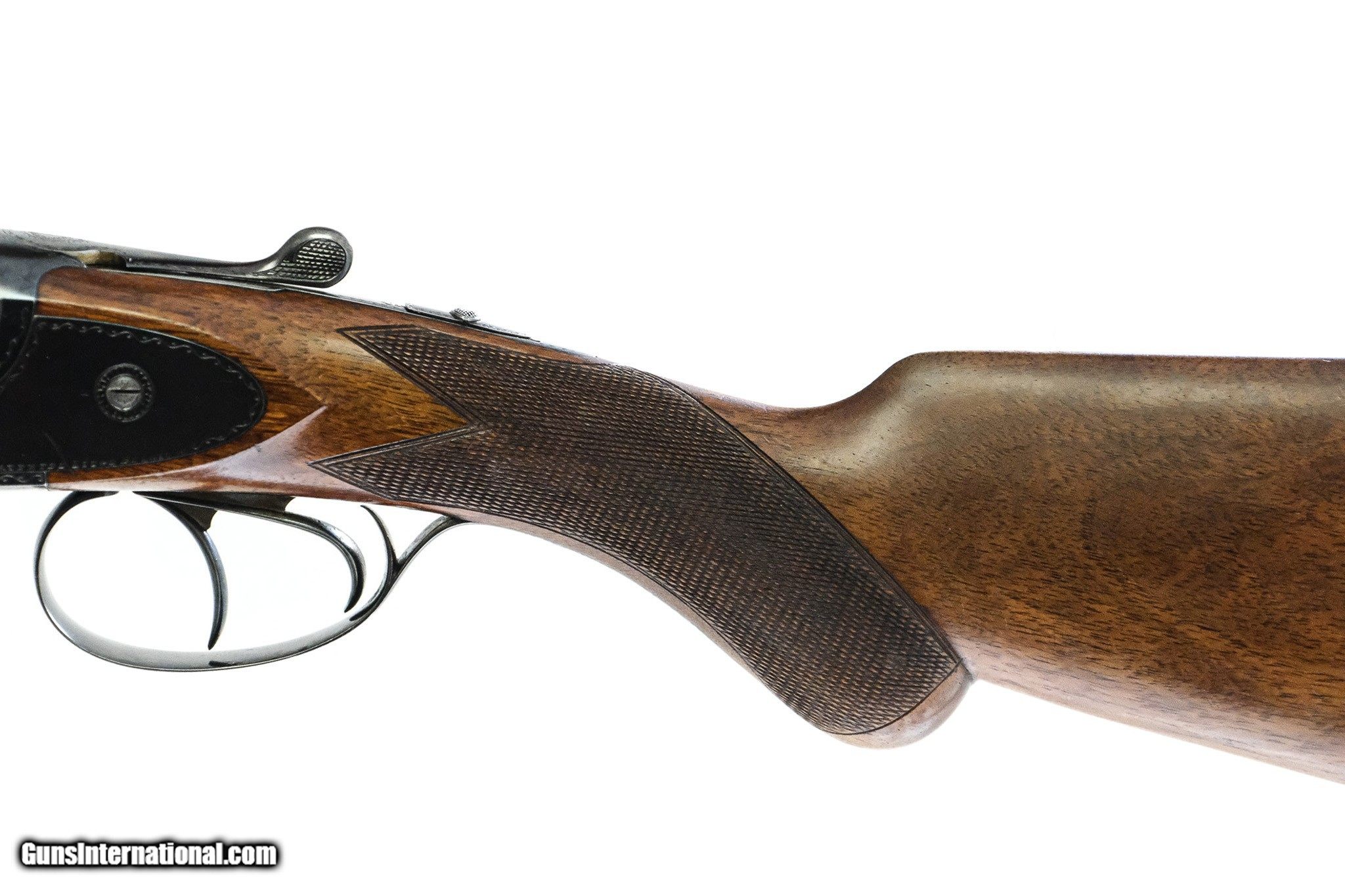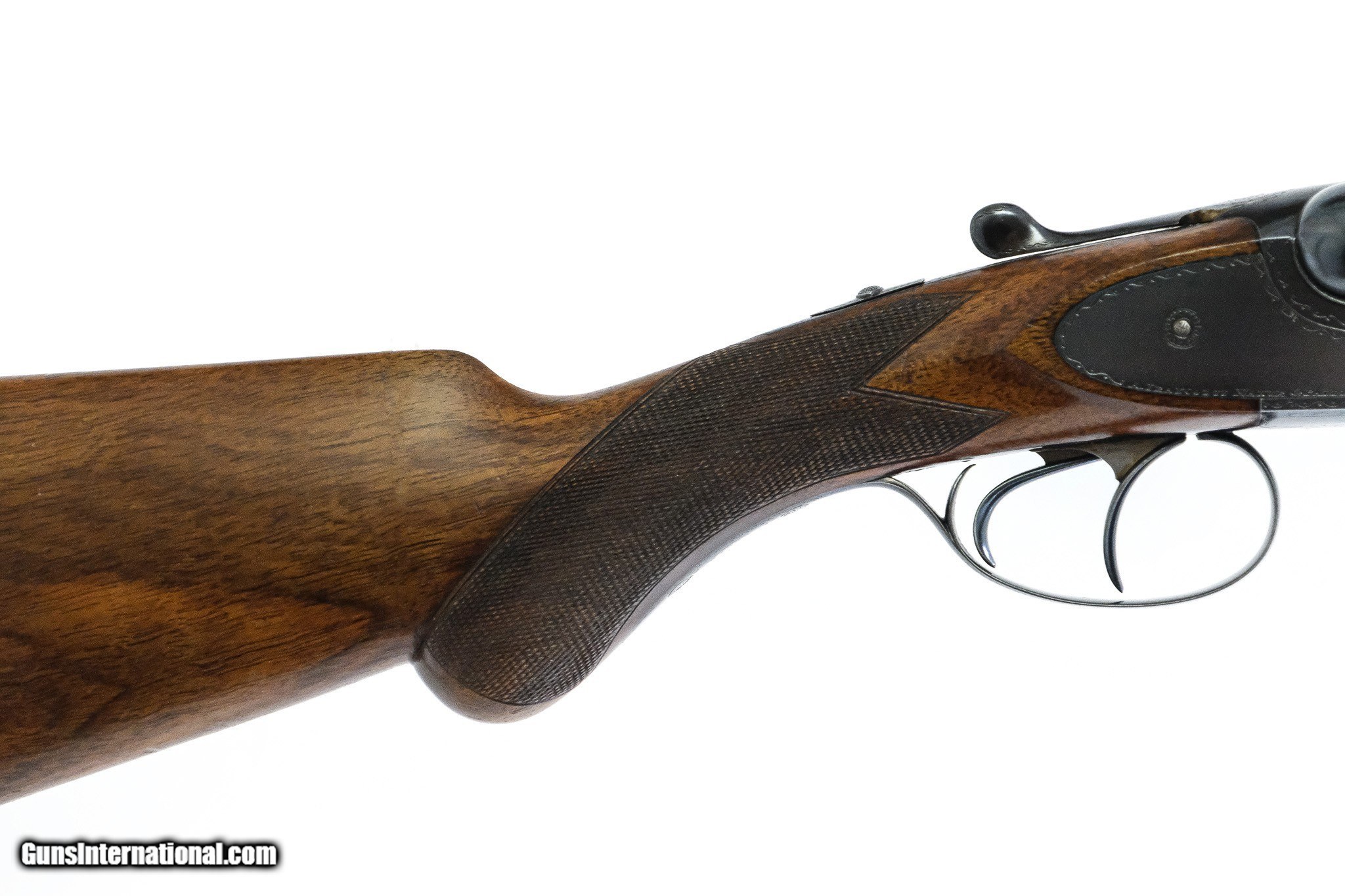 Description: A. Francotte - Jubilee, SxS, 20ga. 26" Barrels Choked IC/M (.006”/.015”). Round knob stock, factory serrated butt plate, double triggers, automatic ejectors, side clips, splinter forend, game gold oval, imported by Abercrombie and Fitch in 1940, sideplated gun with boarder engraving over a blued finish, gun remains in very good overall condition, 5lb., 4oz makes this the perfect field gun, available for immediate delivery. Inv: 76294 5 lbs. 4 oz. 14 ½” x 1 ½” x 2 ¼” $4,750.00 SOLD |