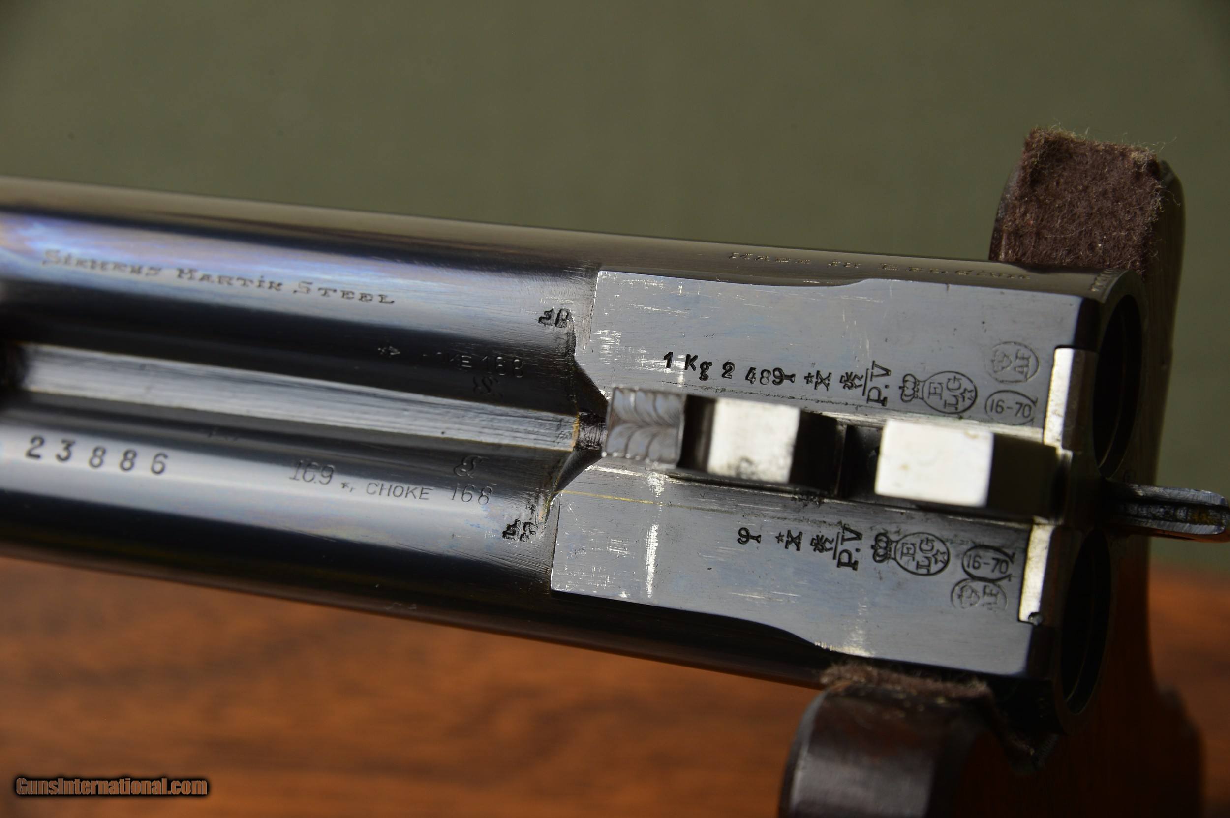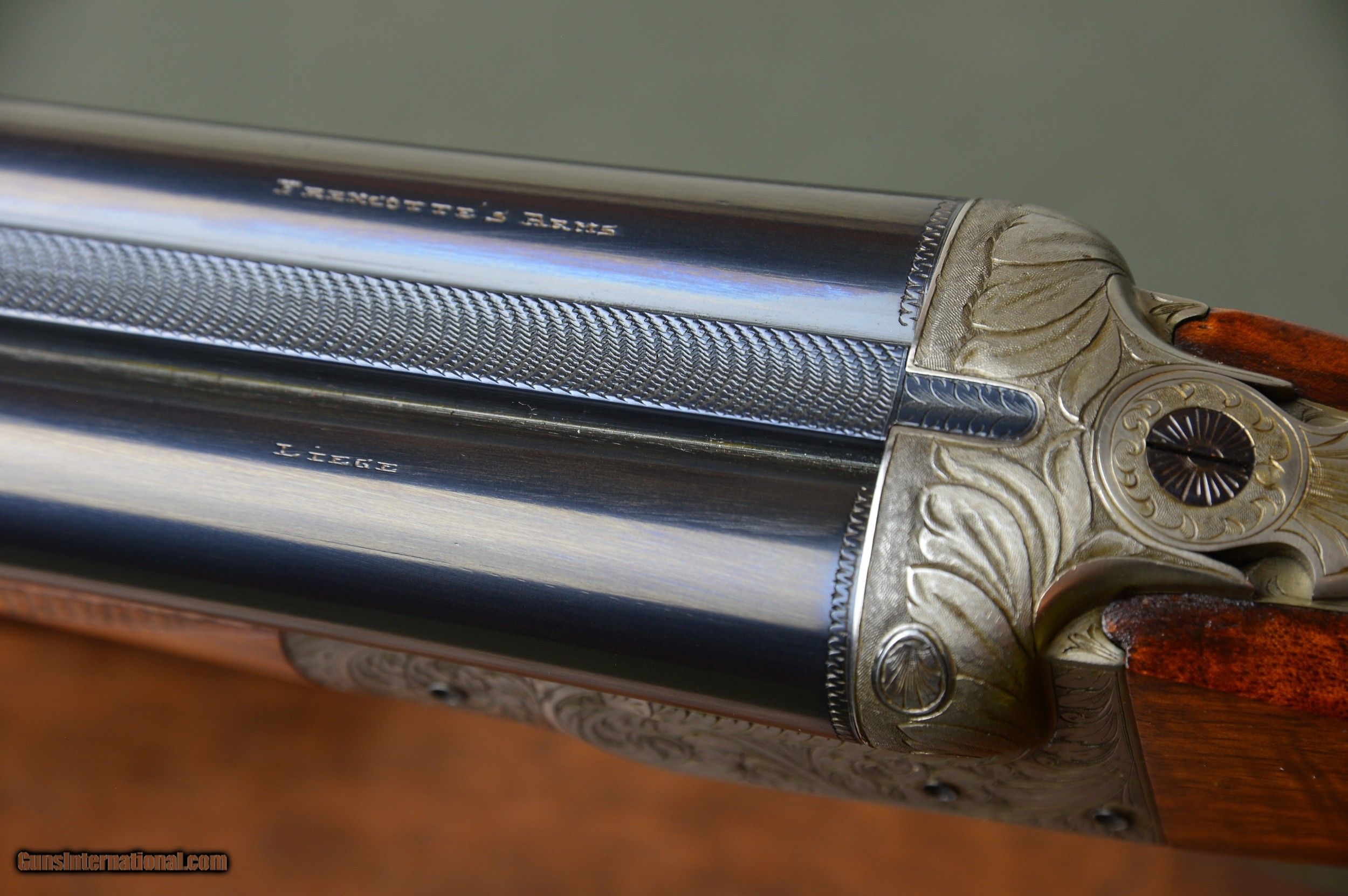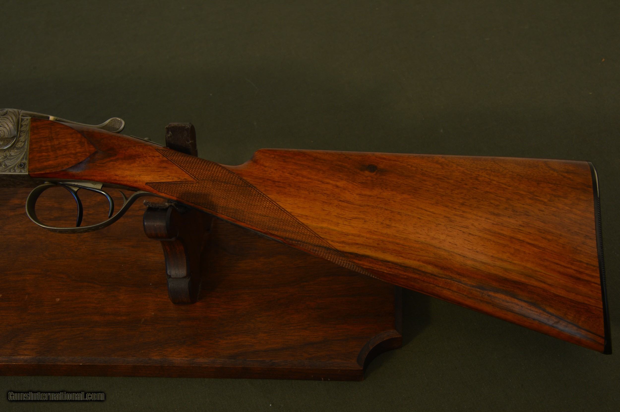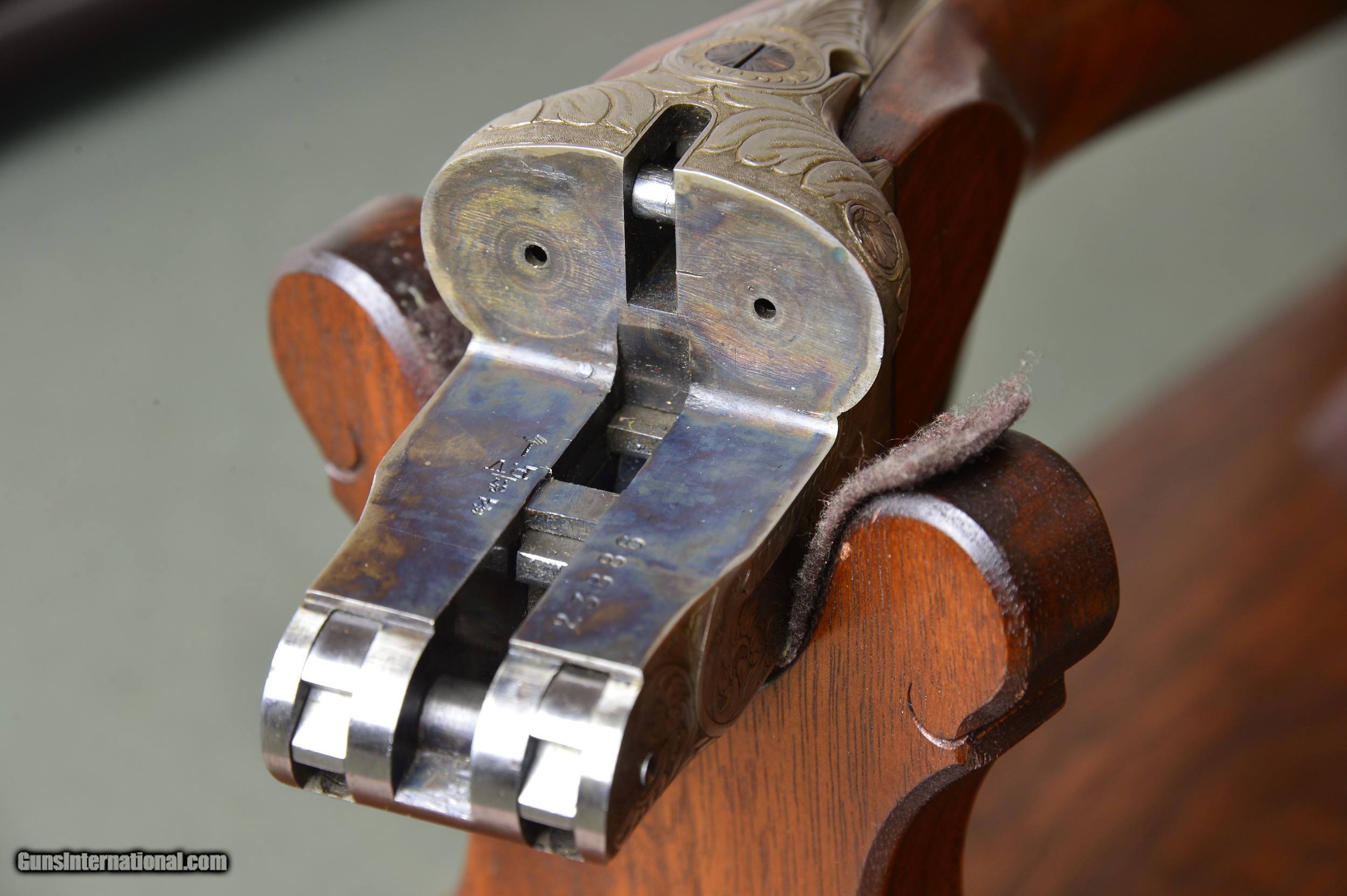Description: *** SOLD *** CONDITION CONDITION CONDITION *** 1960’s vintage 16 gauge Francotte boxlock non-ejector in excellent condition. Shows few signs of use. Highly engraved, nicely figured European walnut stock, and great handling. Kersten cross-bolt for strength and double triggers. Weighs 6lbs 2oz. Serial number 23886. Another well-made double from this quality Belgian gunmaker. *** The 28” Siemens Martin Steel barrels are chambered for 2-3/4” shotshells and are equipped with extractors. They are topped by a raised solid tapered crosshatched rib. The right barrel is inscribed “Francotte’s Arms” and the left is inscribed “Liege” and lower down “Made in Belgium”. The right barrel is bored 0.667 with a constriction of 0.020 for Modified choke. The left barrel is also bored 0.667 and has a constriction of 0.025 for Full choke. The bluing is 99%+ and the bores are shiny. *** The straight grip stock and splinter forearm are made of nicely figured European walnut. Checkering is crisp. Stock dimensions are 14-1/2” over a factory plastic butt plate by 1-3/8” by 2-1/8”. Very slightly cast off for the righthanded shooter. The finish is in superb condition with only a very few minor handling marks. The butt plate has a few scratches. *** SPECIAL NOTE: This 16 gauge Belgian double is the first gun of a multi-gauge composed pair and may be purchased by itself or with its consecutively serial numbered 20 gauge mate which is listed separately. Please contact me for details. *** I am an FFL and will need a signed copy of your dealer’s FFL license. Not for sale where prohibited by state or local laws. Buyer is responsible for all shipping, insurance, and any other related charges. I give a 3-day non-firing inspection period and will only accept returns at buyer’s expense. *** Come and see this great double and other fine firearms at the MacNab booth at the Vintage Gunners Cup September 15th --- 18th, 2021 at Hausmann’s Hidden Hollow Sporting Clays in Friendsville, PA. SOLD |