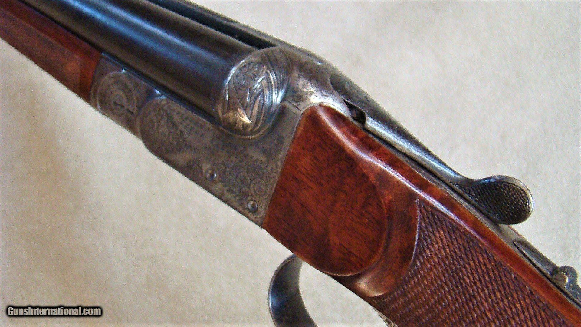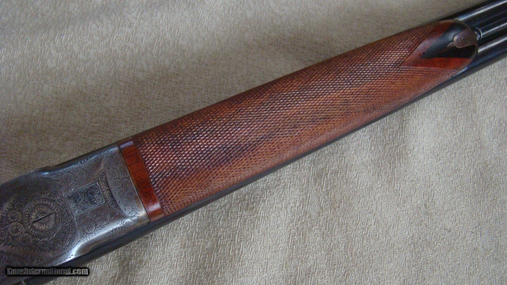 Description: Francotte 28 ga. Model 14, 26" barrels choked improved cylinder and modified (.005/.014). Barrels marked with importer Von Lengerke & Detmold (VL&D) New York address. Matted top rib and Greener crossbolt. Extractors, auto safe. Finely engraved action retains a pleasing patina incorporating the ever-reliable Miller single trigger. Nicely restocked with splinter forend, Prince of Wales grip shows fabulous flame-grain figure throughout and measures 1-3/8" comb, 2-3/8" heel, 14-1/2" LOP over the rear position single trigger. Weighing just 5 lbs, 6 oz., makes this a truly fast handling upland double. SOLD |