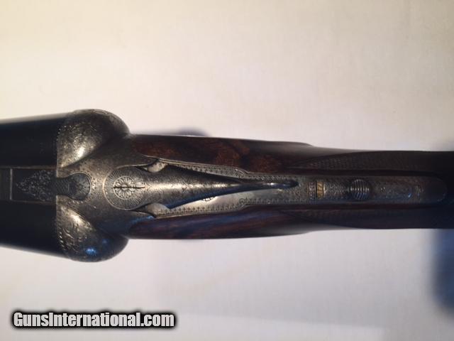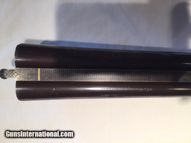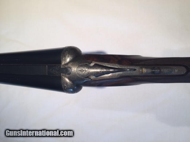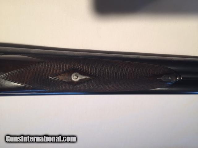 Description: 12 gauge 2/ 3/4" chambers. This fine, high quality, gun that comes with two sets of bbls, one 30" of steel, and the other 28" Damascus. Both sets of bbls have flat, matted, pigeon ribs, are engraved "Von Lengerke & Dettmold" US agents of New York. Bbl flats are stamped with Belgium proofs,and "NON POUR BALLE". Barrels are stamped with steel type. Bottoms of barrels on both sets are stamped with two and three-quarter inch chambers. Case hardened box lock action with ornamental sideplate features automatic safety, crossbolted dolls head third fastener, side clips, and double triggers. Action is engraved in typical Quality 30 style with near full coverage varying sized simple scroll within geometric borders. Rose bouquets and very well detailed flying pigeons are superimposed over this scroll. Stock is made of dense European walnut square pistol grip that measures 14 inches over checkered horned butt plate. Gun has closely spaced point pattern checking with line borders at the grip. Matching splinter ejector fore end has Anson release. Steel 30". Condition: Action is tight with both sets of barrels. Damascus barrels retain over 90% of the original brown with numerous light mark's. Action and side plates retain approximately 20 to 30% of the original case color. The balance is bright silver. Stock retains nearly all of it's hand rubbed oil finish, edges slightly rounded with a few subsequent marks, checkering recut borders are excellent. Bores are excellent. Bbls. are on face. Ejectors are in time. SOLD Curio/Relic: Yes Antique: Yes Manufacturer: Francotte Model: Quaility 30 Serial Number: 27XXX Bore: 12 gauge Chambers: 2 3/4 Ejectors: yes Condition: Excellent Metal Condition: Excellent Wood Condition: Excellent Bore Condition: Excellent Barrels: Excellent Barrel Type: Double Action: Boxlock Triggers: Double Gauge Info: 12ga Stock Dimensions: 14 Stock Drop: At heal 2 5/16 Stock Comb: 1 5/16 Stock Cast: 1/4" Fore End: Splinter Butt Pad: Horn LOP: 14 Rib: Flat, matted, pigeon Finish: oil Weight: 7 lbs Manufacture Date: 1894 Choke Left: Full .728 Choke Right: Full .727 Engraving: Quality 30 Extras: ejectors, extra set of Damascus bbls. Minimum Wall Thickness Left: . 032 Minimum Wall Thickness Right: .034 |