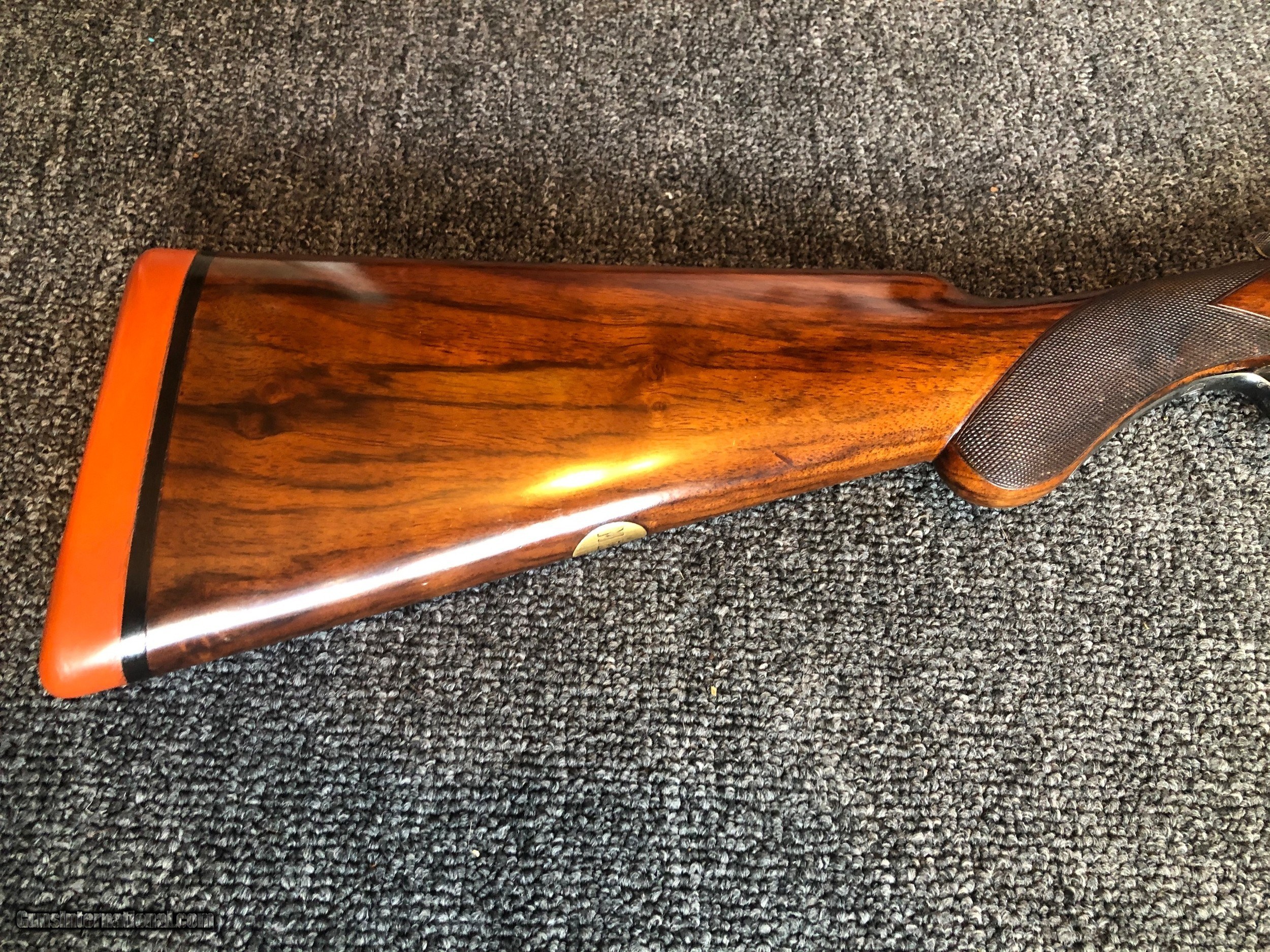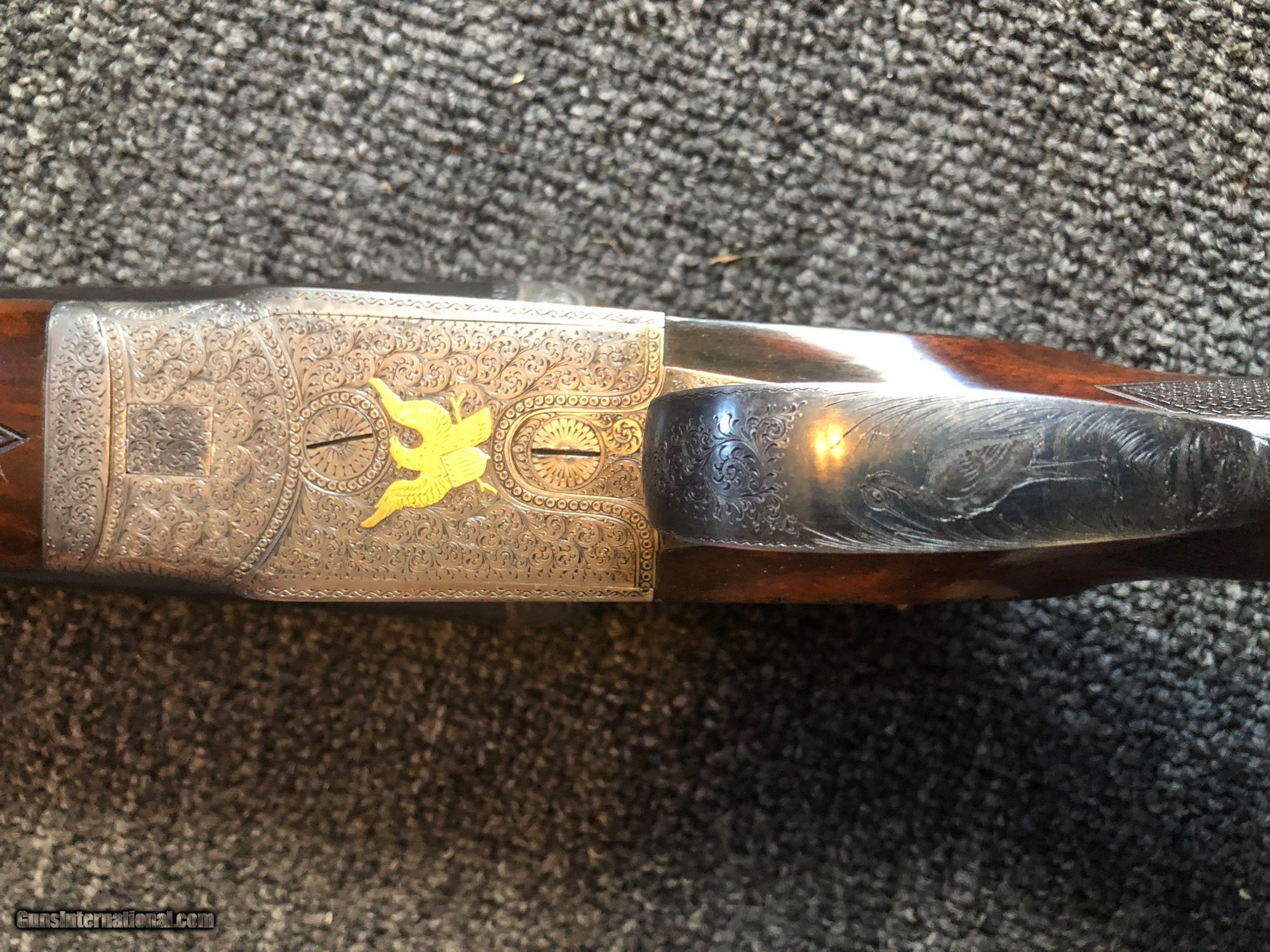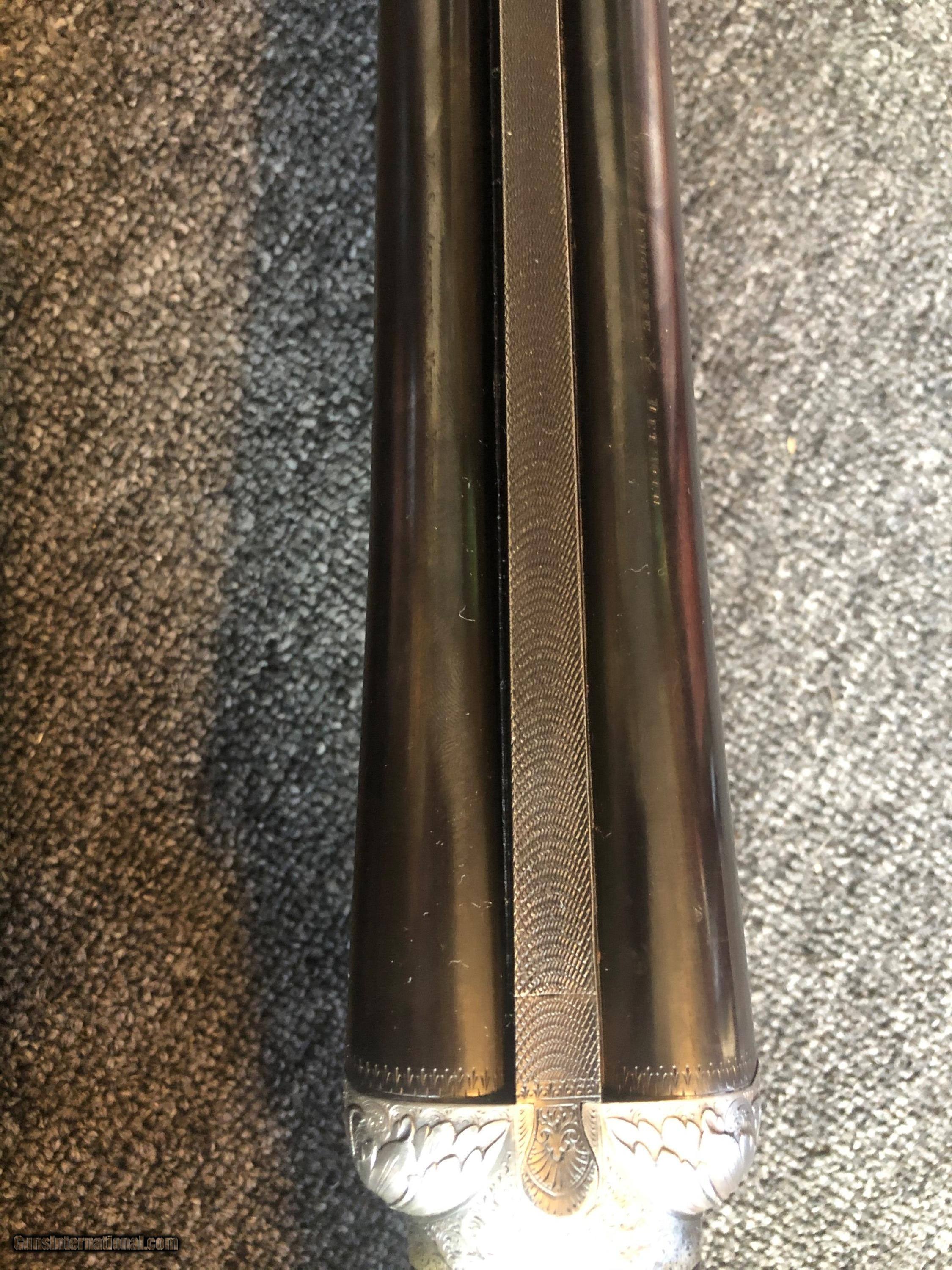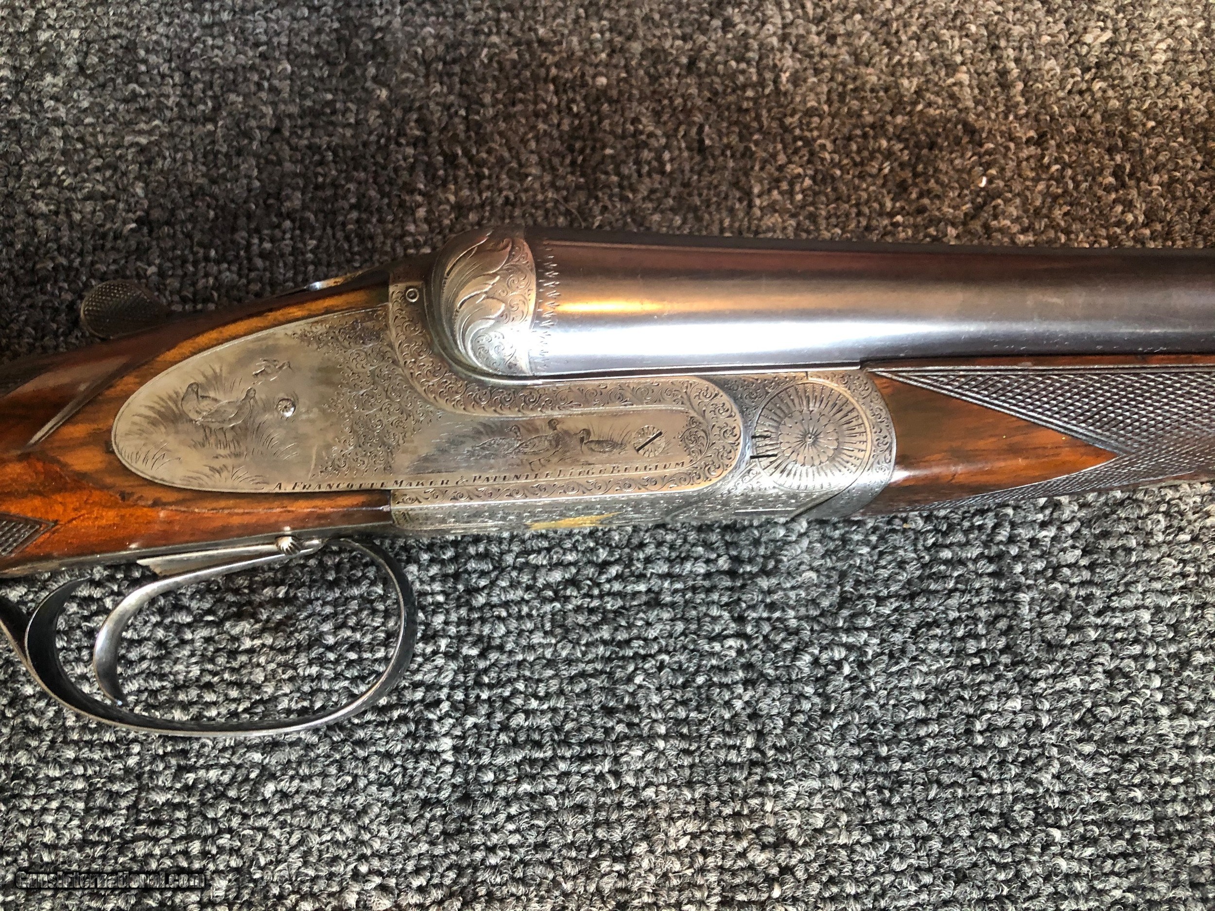 Description: Beautiful Francotte Eagle grade 12 gauge with 30" barrels choked IM/F, single selective trigger, automatic safety, and ejectors . It weighs 8 lbs. 2 oz. and the stock measures 14 3/8 X 1 1/2 X 2 1/2 over Silvers pad. The game scene engraving is outstanding and the gun is in excellent condition overall.REDUCED! SOLD |