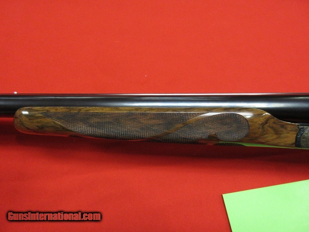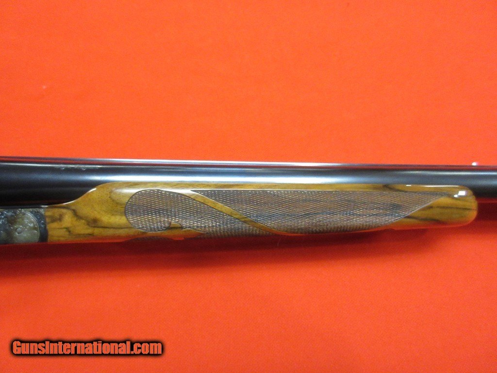 Description: Francotte Boxlock 12ga/30" -- Case colored boxlock action with custom engraving by Williams (signed on the flats). This gun has been custom stock with high grade walnut by Gary Gowdy. It features a straight grip stock with shadow-line cheekpiece, skeleton butt, extractors, and a beavertail forend. This gun has deep relief scroll engraving across the fences with very well-executred scroll engraving on the sides of the receiver. It would cost a small fortune to reproduce a gun of this quality. Barrel bores measure .732" with .007"/.010" choke). This would make a great gun for clays or general upland use. Comes with a leather case. SOLD |