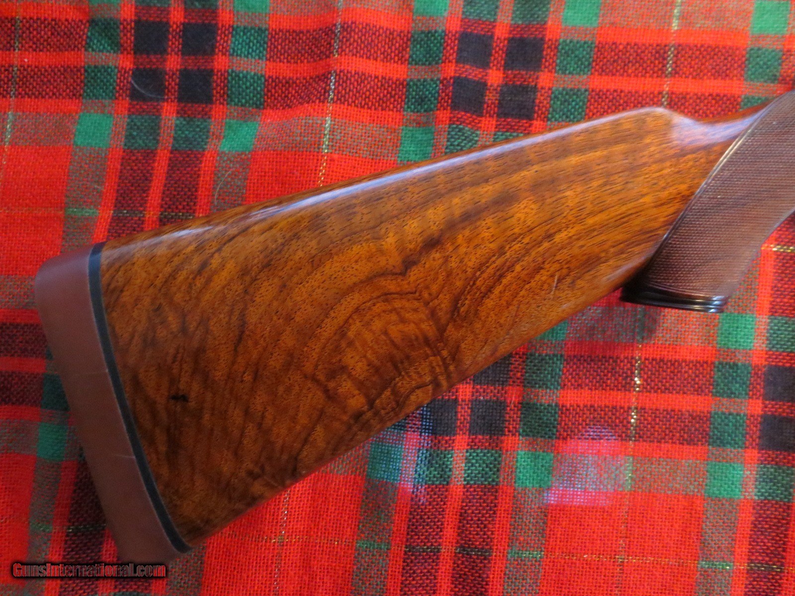 Description: REDUCED!! A real beauty. Perfect restored Francotte 14. Box lock. Damascus 12 ga. 26 inch barrels. 2.75", perfect bores both at .731. Choked at Rt. .000 and left at .000.Double trigger. I cannot find any nitro proof marks. Auto safety. Non-ejector. Vivid case colors. Wonderful Acanthus engraving. The gun is overall 95% restored. I have shot 2.5" low pressure shells through it. with out problems. You would need to confirm with your gunsmith, like I did, that these barrels are safe. However, why do that at all when you have the best of both worlds. You have fitted light weight full length Briley tubes with four screw in flush chokes. Skeet, I.C., Mod. and full. Choke wrench, Hammer , and the knocker outer tool. Perfect quail or grouse gun. Shoot all the modern 2.75" ammo you want through these 20ga. tubes. The beauty of Damascus barrels with the safety of modern, "removable sleeving." 14.25 LOP. DAC 1 5/8". 7 pounds 12 ounces with tubes in. Lock up is double bite with third fastener of Greener cross bolt with dolls head rib extension. Cased. SOLD Manufacturer: Francotte Model: 14 Serial Number: 28xxx Barrel Length: 26 inch Bore: .731 Chambers: 2.75 Ejectors: Extractors Condition: excellent 95% restored Bore Condition: shiny and no pitting Barrels: Steel and Damascus Barrel Type: SxS Action: Box lock style Triggers: double Stock: Pistol grip Stock Comb: 1 5/8 Stock Heel: 2.25 Stock Cast: neutral Fore End: splinter Butt Pad: Silvers LOP: 14.25 Rib: concave with dolls head Finish: Damascus and Case colored Weight: seven pounds 12 ounces with tubes in Sights: front bead Chokes: Briley tubes 20ga. Four removable flush chokes. Engraving: Factory engraving acanthus and scroll Extras: Full length inserts by Briley. Chokes- skeet, I. C., Mod. and Full Case: yes Item Location: Reno Proof:Nitro: No Proof:Black: yes |