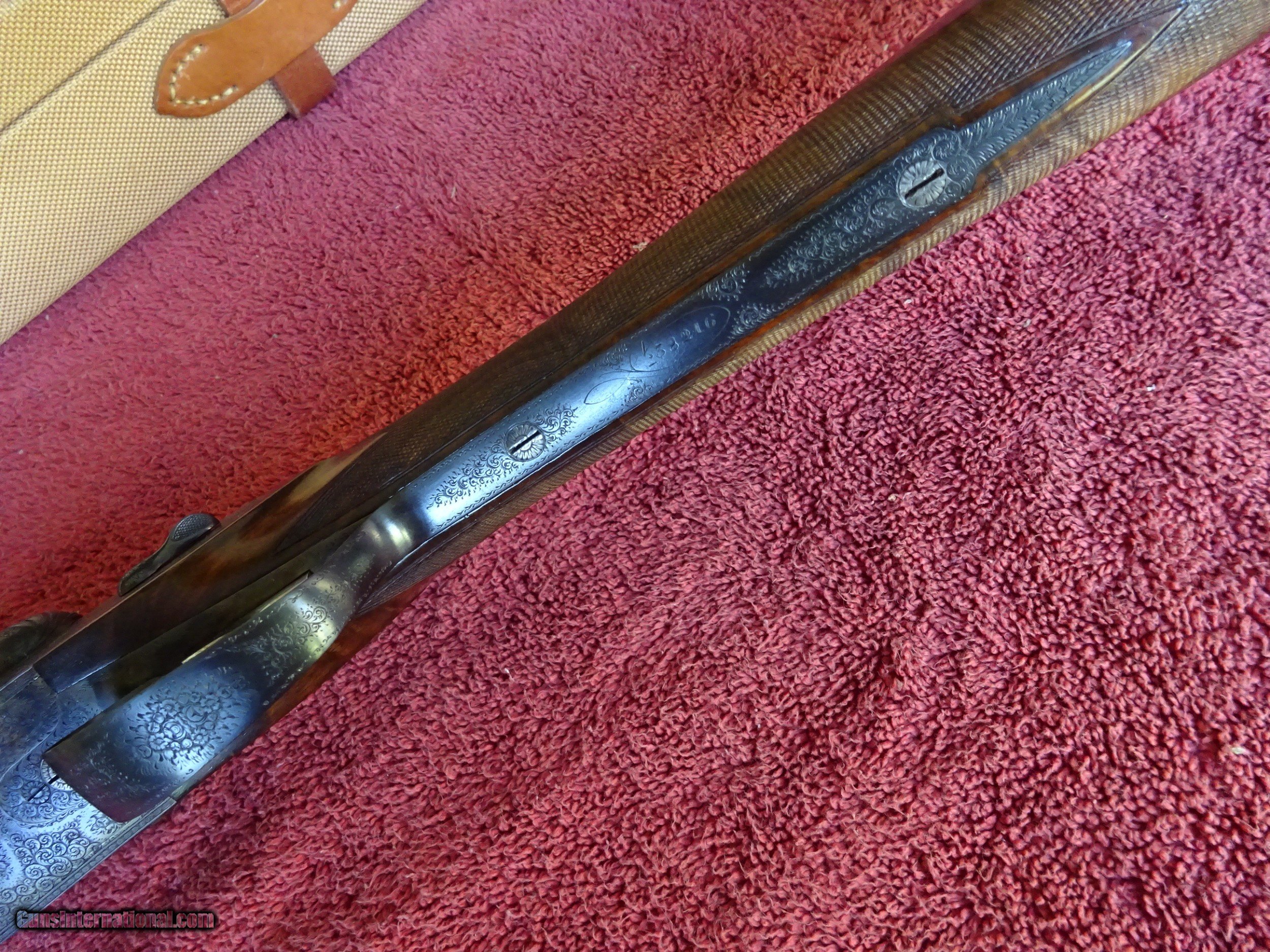 Description: FRANCOTTE, LIÈGE BELGIUM, SPECIAL ORDER 12 GAUGE. 28" BARRELS, 99% ORIGINAL BLUE, MIRROR PERFECT BORES, AUTOMATIC EJECTORS, TWIN IVORY SIGHTS, FULL AND MODIFIED, 2 3/4" CHAMBERS, ENGRAVED AT BREECH ENDS AND RIB EXTENSION. PROFUSELY ENGRAVED, 100% COVERAGE WITH VERY FINE SCROLL AND FLORAL BOUQUET, BEAUTIFULLY CARVED FENCES WITH SIDE CLIPS, PERFECT ENGRAVED SCREWS, EXCELLENT BOLD CASE COLOR, UNUSUAL 3 POSITION SIDE LEVER SAFETY, "DGS" INLAYED IN GOLD, JAEGER PATENT SINGLE TRIGGER. STRAIGHT GRIP STOCK, SPLINTER FOREARM, EXTREMELY FINE CHECKERING (PROBABLY 32 LINES PER INCH), NICELY FIGURED EUROPEAN WALNUT, GOLD STOCK INLAY WITH FANCY MONOGRAM. GREAT DIMENSIONS, 1 1/2" X 2 1/4" X 14", 6 POUNDS 8 OUNCES. CASED IN A CANVAS AND LEATHER FELT LINED TRUNK CASE, BRASS FITTINGS, AUGUSTE FRANCOTTE LABEL, KEY. OUTSTANDING ORIGINAL HIGH GRADE FRANCOTTE. $3850.00 + $50.00 Insured shipping to an FFL address. See all Pats listings We also have hundreds of pieces of ORIGINAL gun company advertising & memorabilia available for sale. We have no reprints or reproductions. Email for more information. SOLD Curio/Relic: Yes Serial Number: 38,xxx |