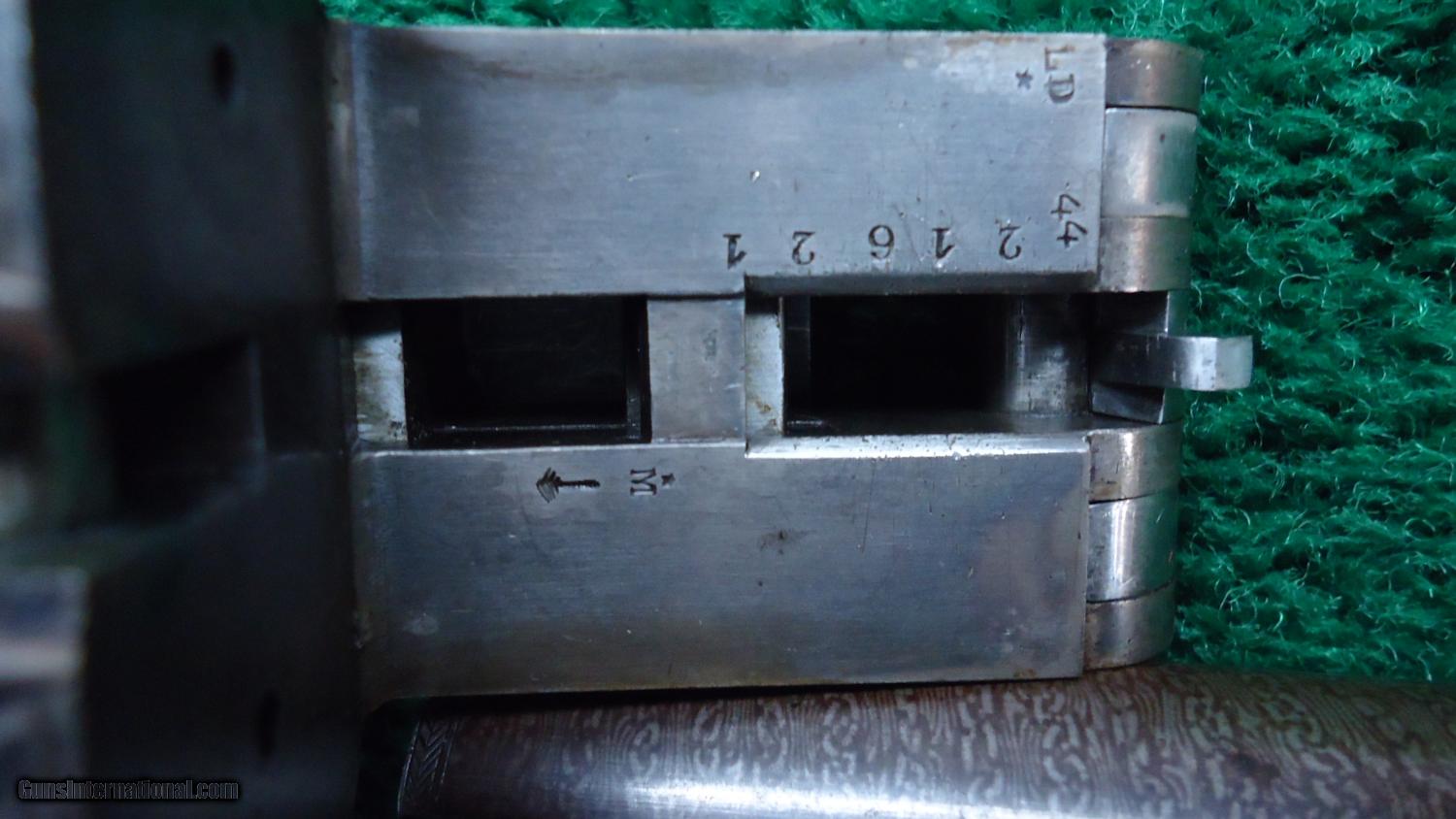 Description: This is a 12 ga with 2-1/2" chambers. A boxlock shotgun with the Greener style cross-bolt locking system. A handsome looking gun with 30" bbls. Beautiful Damascus pattern on these bbls that have aged to a pleasing brown color. VG condition both inside and out. Good solid bbls that have the famous "Damascus ring". Manufactured in 1894 with Serial no. 21,6XX. Francotte is noted for having very fine firearms. This is an early gun with beautiful tight delicate engraving that pretty much completely covering the metal. The bolsters have rather elaborate relief engraving. All metal is in very nice condition. Wood also is exceptional and nice fitting with no cracks or losses. Superb checkering is still very sharp. Don't know if it has been re-cut but would have had to be a Master if it was. Wood looks like it has had a coat of something hand rubbed in years ago. Buttplate looks orig with just a couple little dings and one light crack coming off the bottom screw. Nothing missing. Fine shotgun! Leroy Merz Antique Firearms specializes in antique and vintage Winchesters and other fine American firearms. Since 1965 Mr. Merz has taken part in the world of firearms and has been a contributor to many well known reference books. Just recently we mailed the 126th edition of our privately-published catalog. We have hundreds of additional guns in every price range at our home online. Search for Merz Antiques in google. SOLD Antique: Yes |