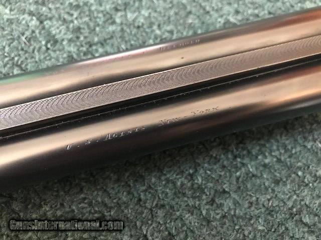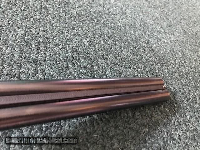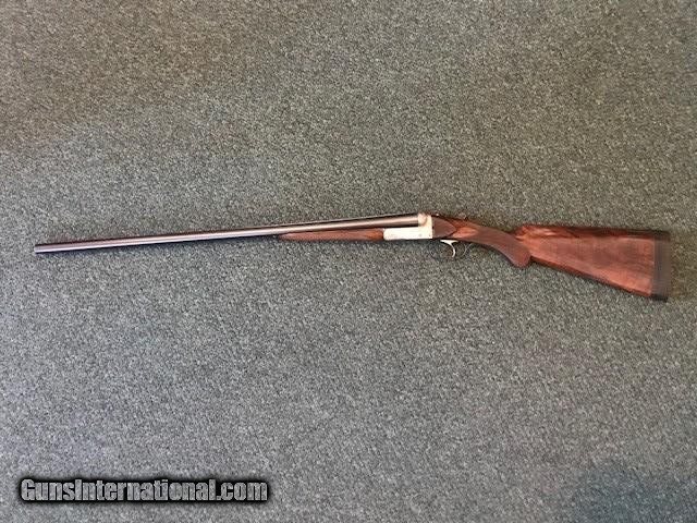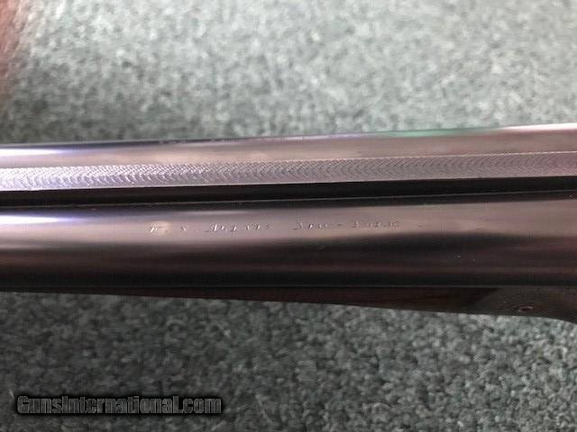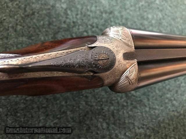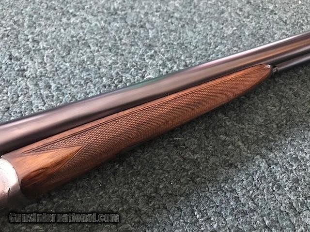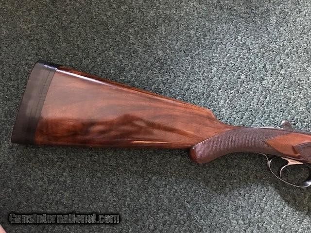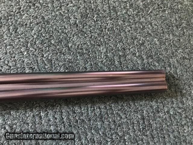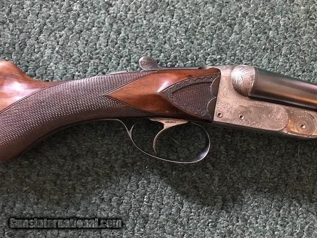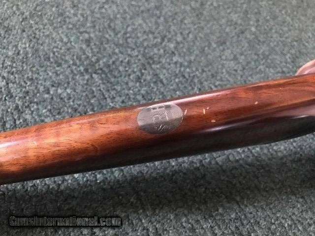 Description: Francotte, "The Knock About Gun", 20 ga, single Jurjevc trigger, ejectors, 2 3/4" chamber, solid rib, scroll engraving, pistol grip, double under locking lug, splinter forearm, 26" barrels, 14 5/8" length of pull, solid pad, 2 7/8" drop at comb, silver stock shield has initials SRH, side by side, stock lengthened, very good condition, light handling marks. Serial No. 82734. For further information call John at 941-748-7318. SOLD |