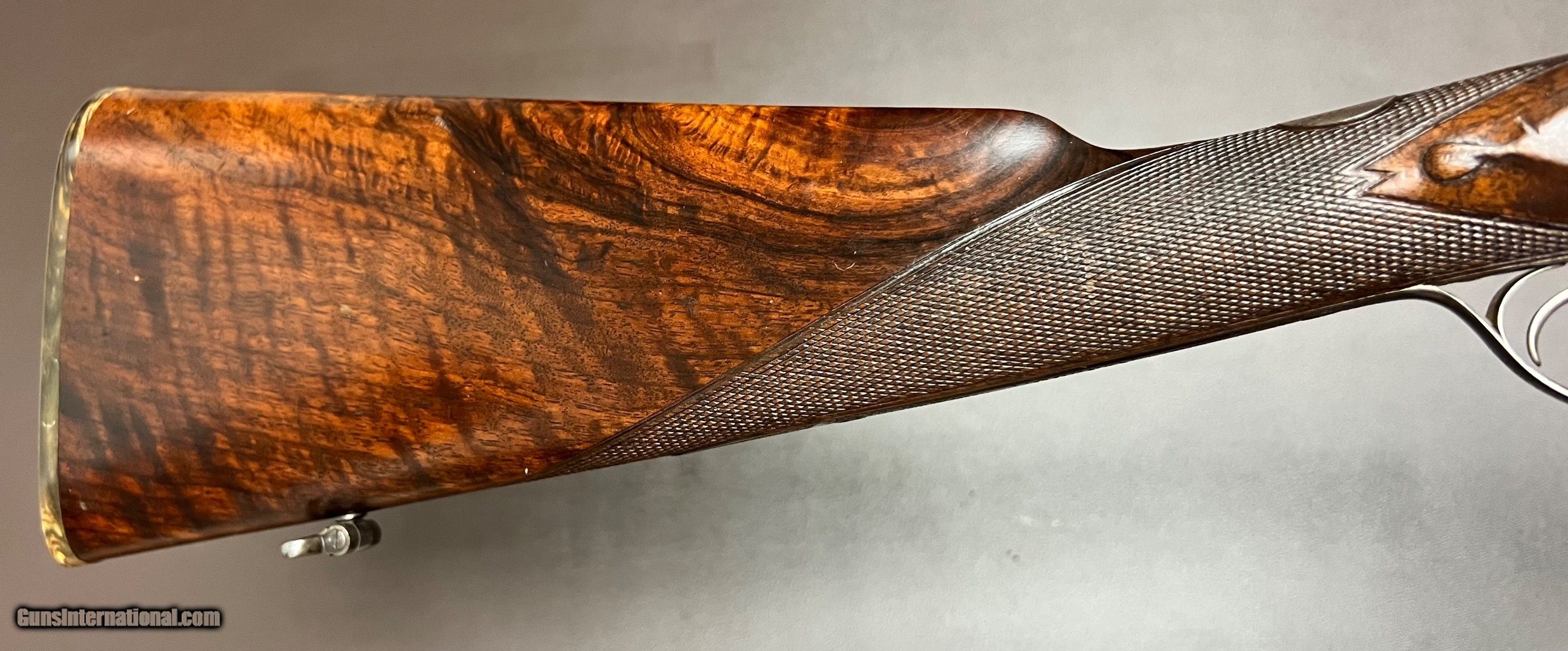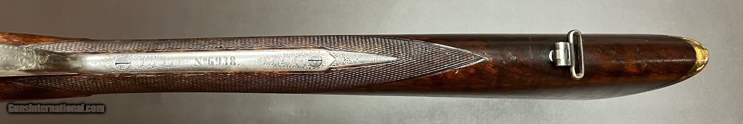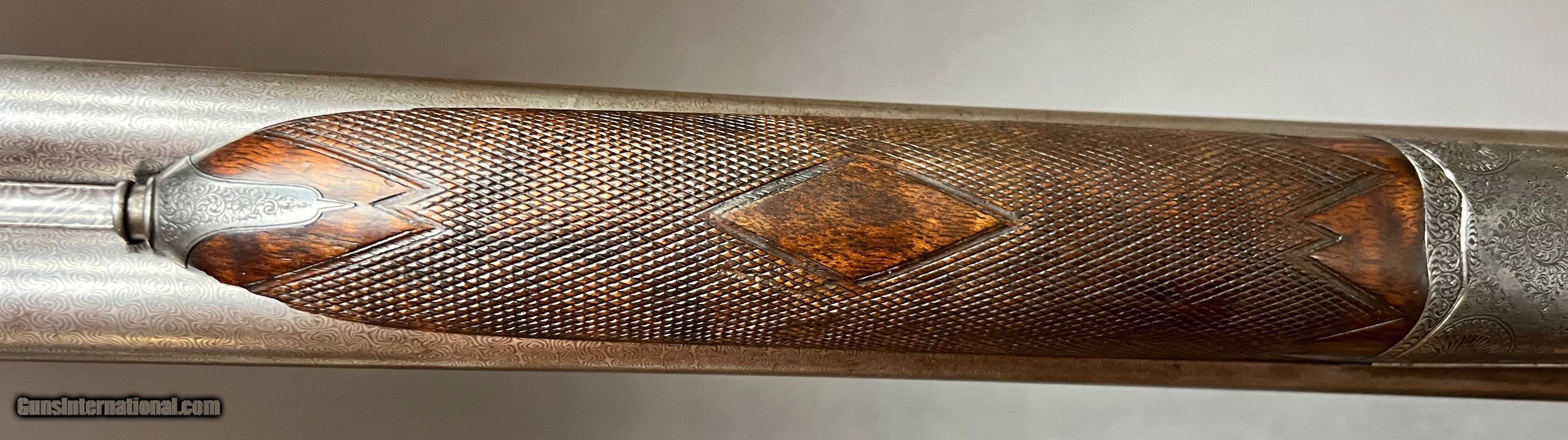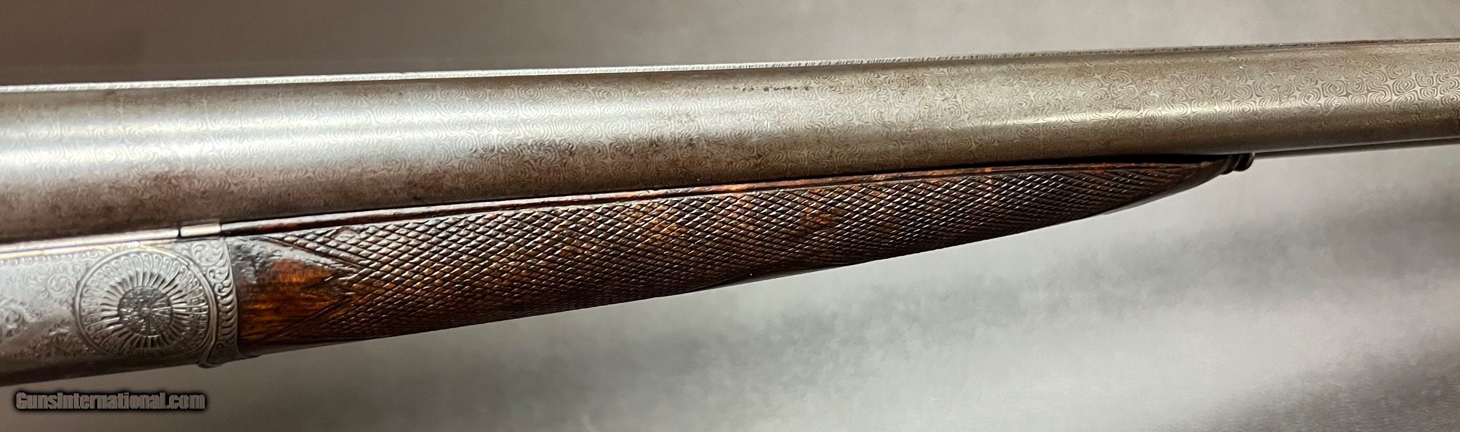 Description: Johann Springer Vienna (Built by August Francotte) best quality 16ga rounded bar action hammergun 29.5" non ejector fine Damascus game rib barrels with single front bead 2 1/2" chambers Chokes: .009/.021 IC/M Bore measurements: .678/.676 Minimum wall thickness R:0.026 L:0.025 Lockup is tight closes like a vault Damascus barrels have excellent bores with no dings or dents. Original sling swivels Highly figured straight grip stock and splinter forend with original flat top checkering, silver initial oval on top of grip. Wood to metal fit is perfect with no cracks anywhere. LOP 14 1/4" over checkered horn butt with engraved screws DAC 1 5/8 DAH 2 1/4 Cast off 1/8" 6lbs 4oz Built in the mid 1890s Crisp well cut full coverage scroll engraved rounded bar crossbolt action with sculpted low hammers that fall out of the line of sight when cocked, every detail is top quality and all screws & pins are in excellent condition. The Auguste Francotte maker mark can be seen on both sides of the barrel flats (AF) towards the rear. Very nice original condition with some handling marks from use, highly figured best quality Damascus barrels would look brilliant with a re brown. This gun is a Antique and can be shipped directly Antique: Yes Shotgun Gauge: 16 Gauge Price: $4,500.00 Buy Now Contact Seller |