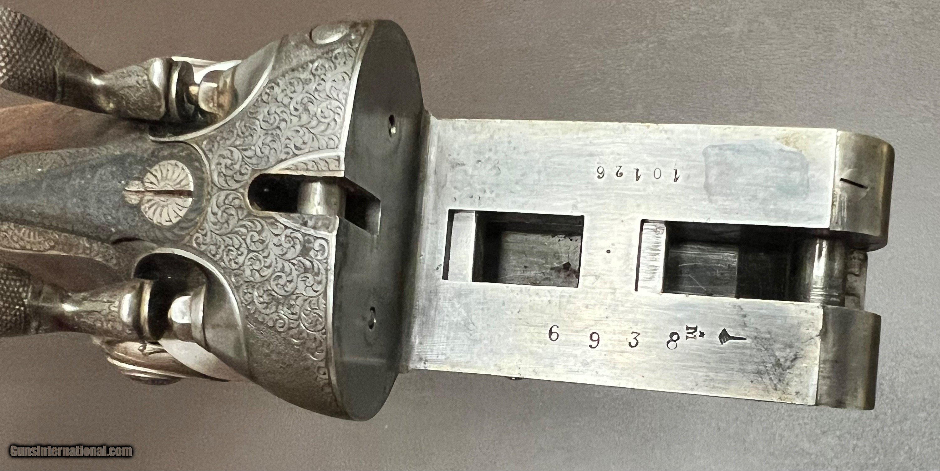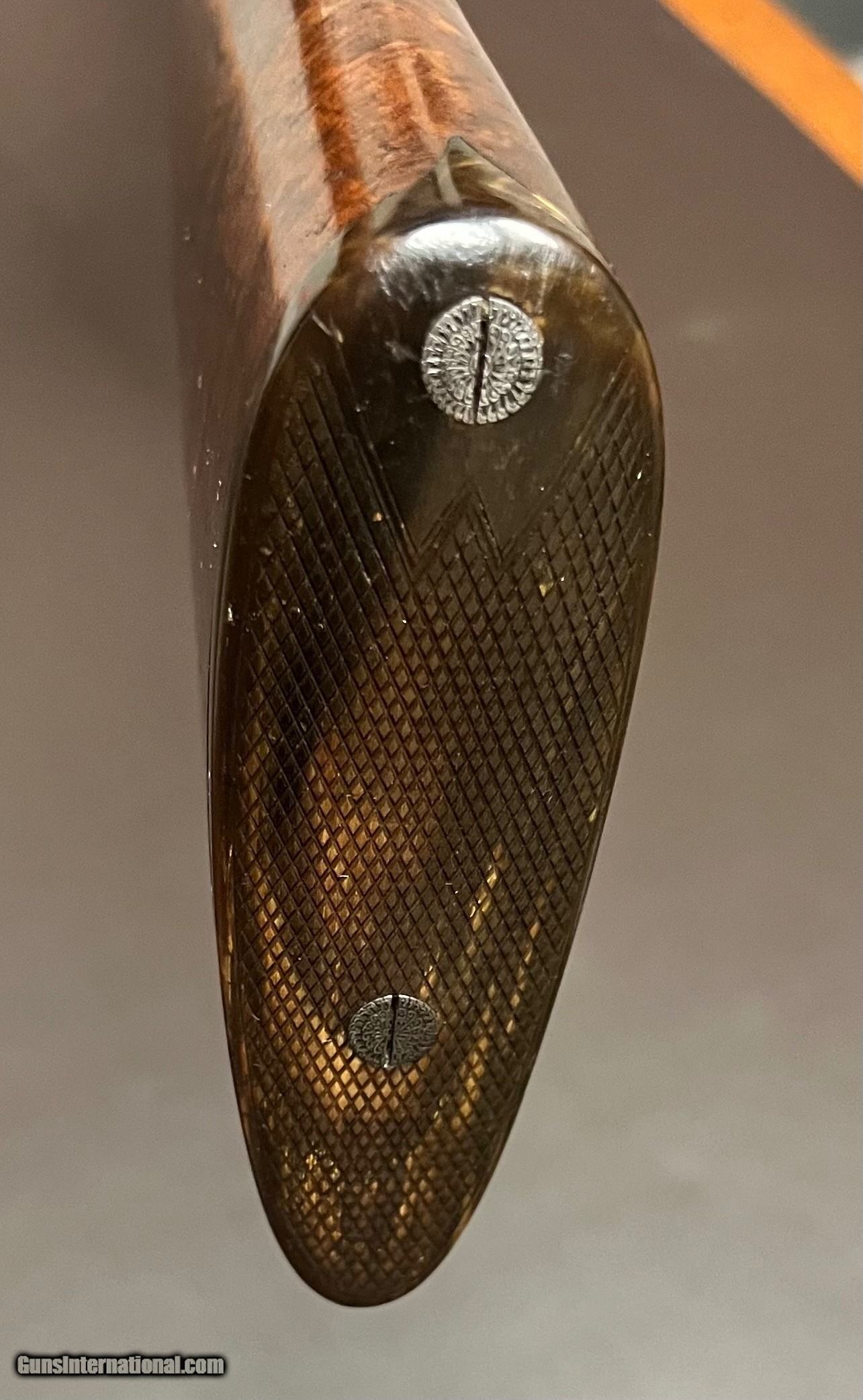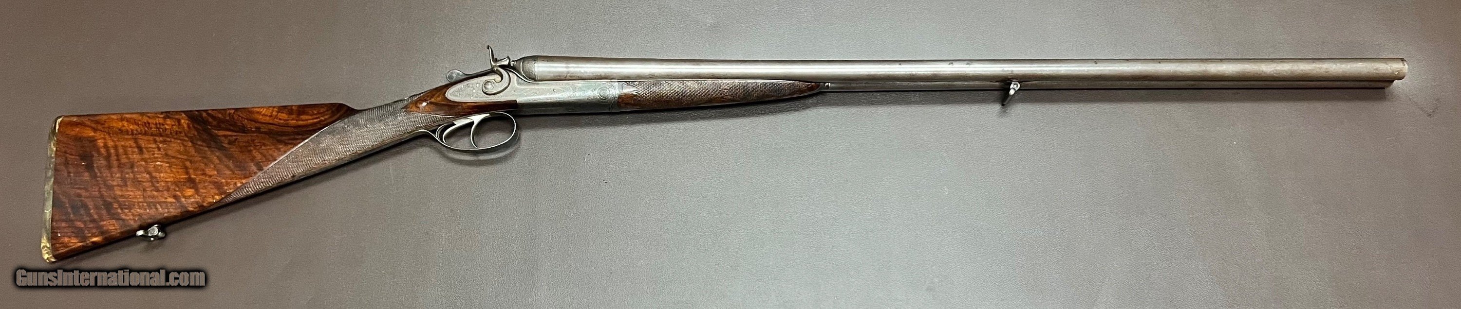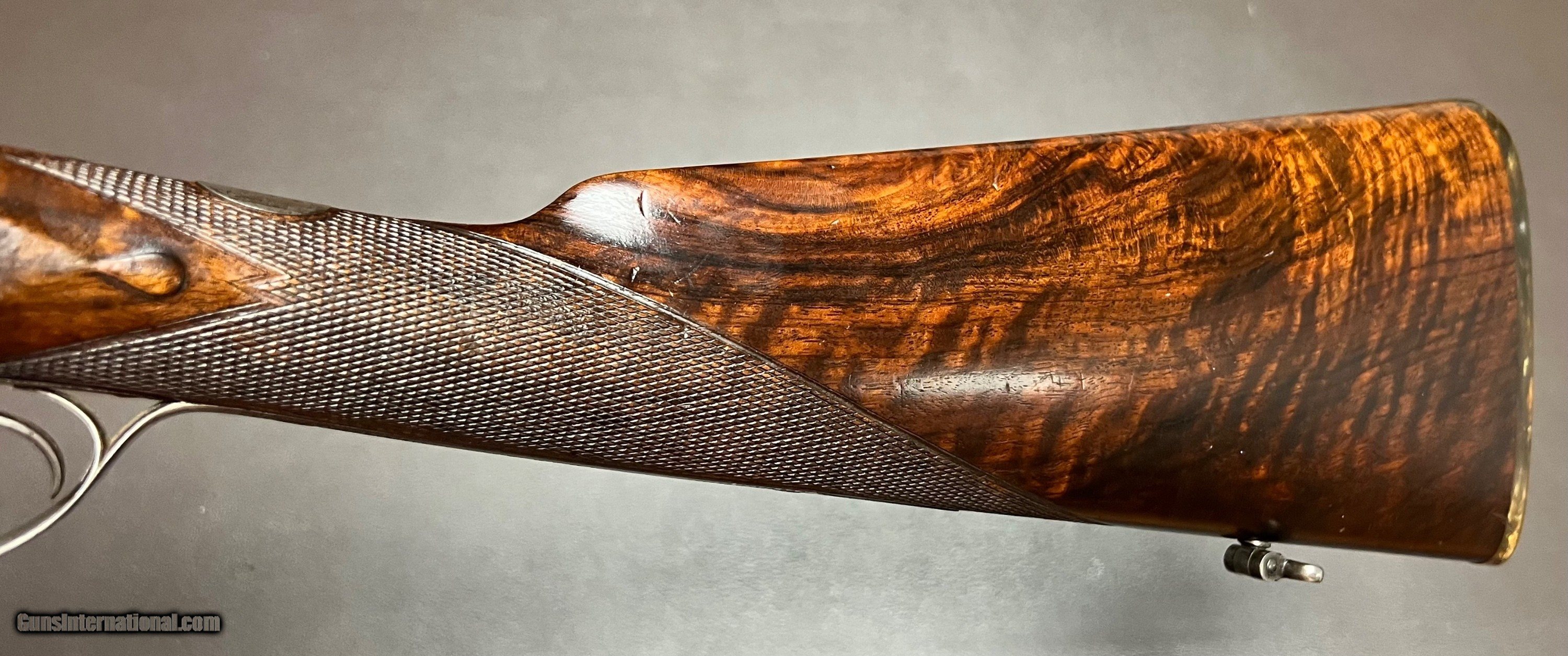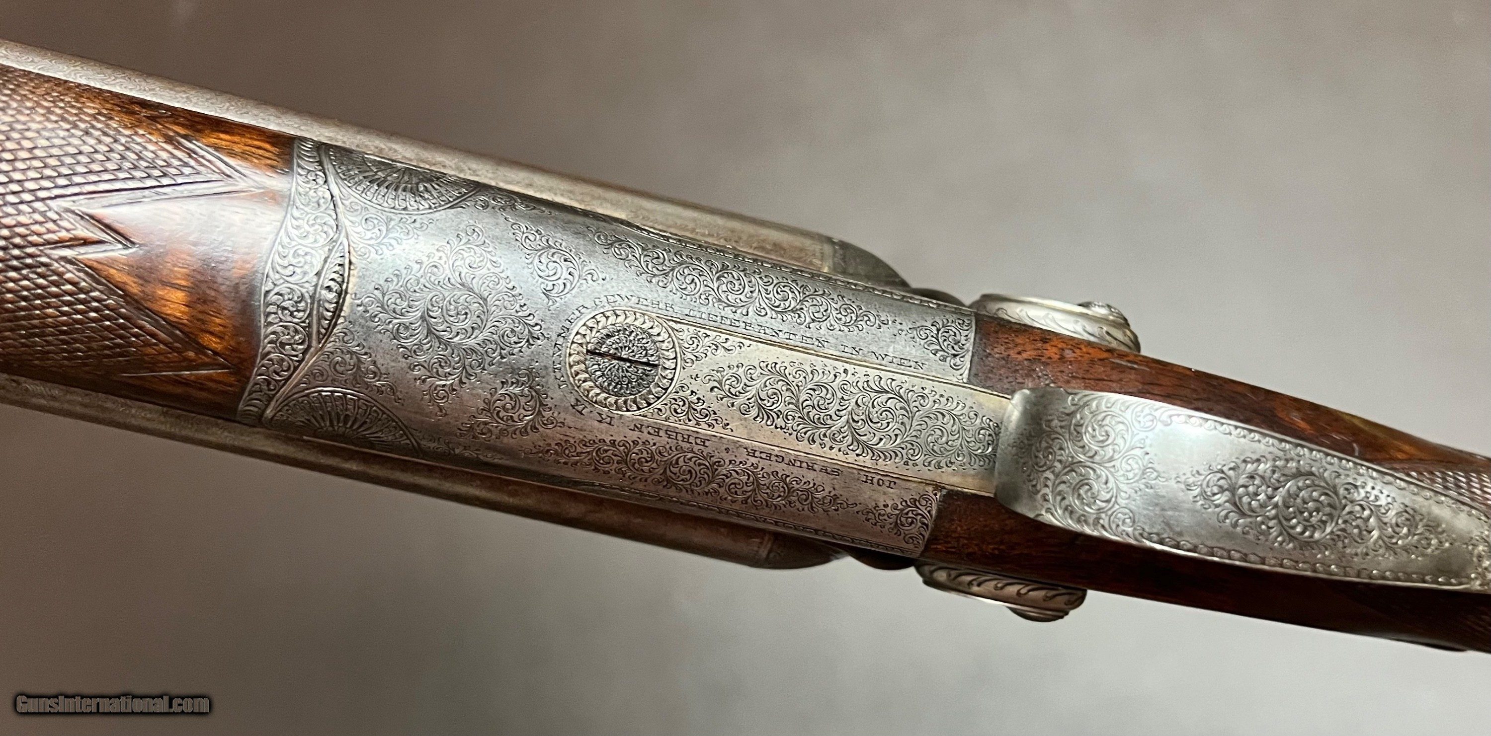 Description: Johann Springer Vienna (Built by August Francotte) best quality 16ga rounded bar action hammergun 29.5" non ejector fine Damascus game rib barrels with single front bead 2 1/2" chambers Chokes: .009/.021 IC/M Bore measurements: .678/.676 Minimum wall thickness R:0.026 L:0.025 Lockup is tight closes like a vault Damascus barrels have excellent bores with no dings or dents. Original sling swivels Highly figured straight grip stock and splinter forend with original flat top checkering, silver initial oval on top of grip. Wood to metal fit is perfect with no cracks anywhere. LOP 14 1/4" over checkered horn butt with engraved screws DAC 1 5/8 DAH 2 1/4 Cast off 1/8" 6lbs 4oz Built in the mid 1890s Crisp well cut full coverage scroll engraved rounded bar crossbolt action with sculpted low hammers that fall out of the line of sight when cocked, every detail is top quality and all screws & pins are in excellent condition. The Auguste Francotte maker mark can be seen on both sides of the barrel flats (AF) towards the rear. Very nice original condition with some handling marks from use, highly figured best quality Damascus barrels would look brilliant with a re brown. This gun is a Antique and can be shipped directly Antique: Yes Shotgun Gauge: 16 Gauge Price: $4,500.00 Buy Now Contact Seller |