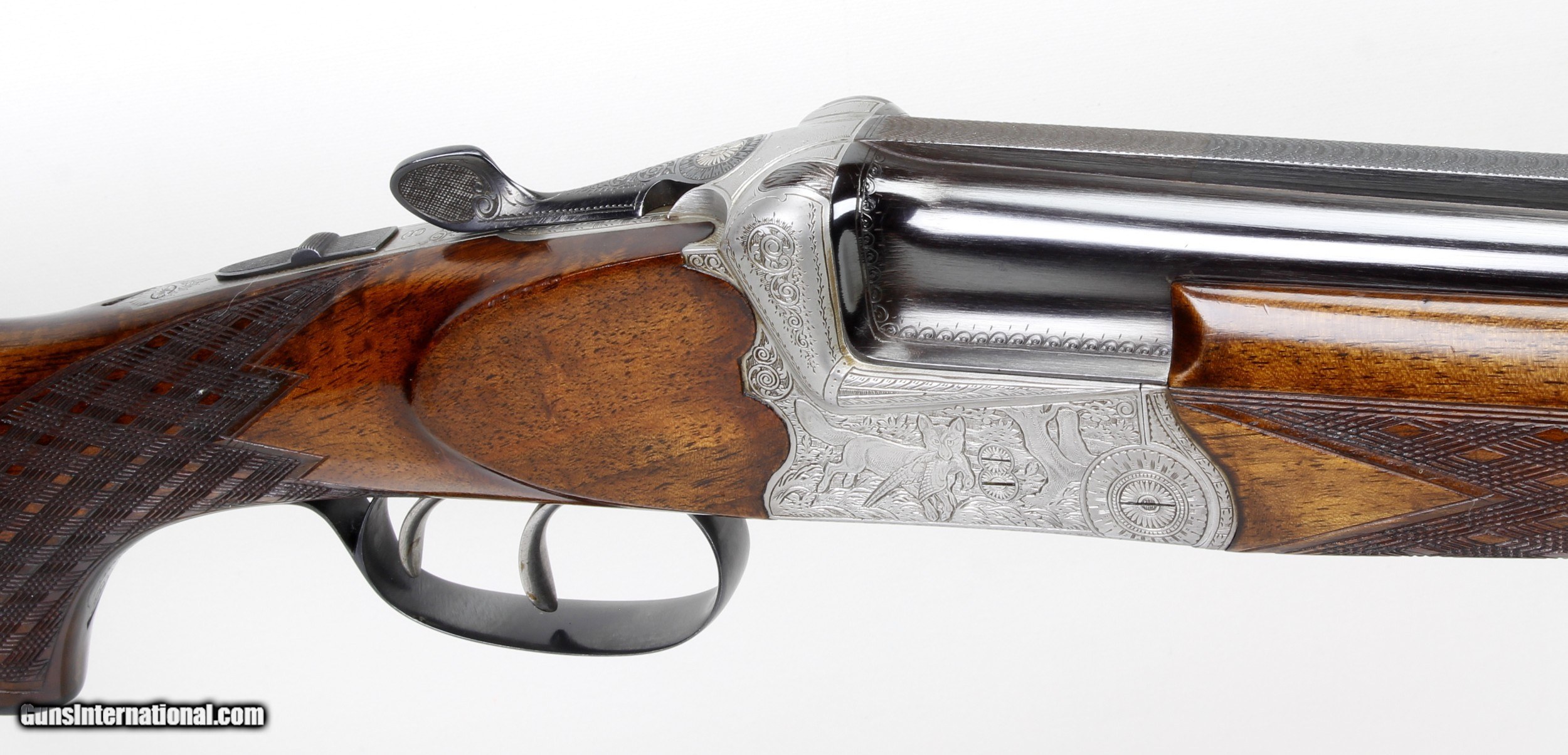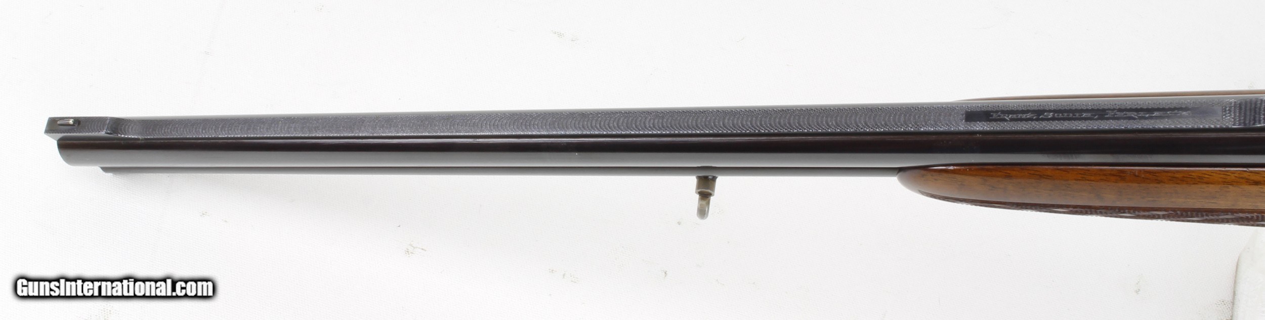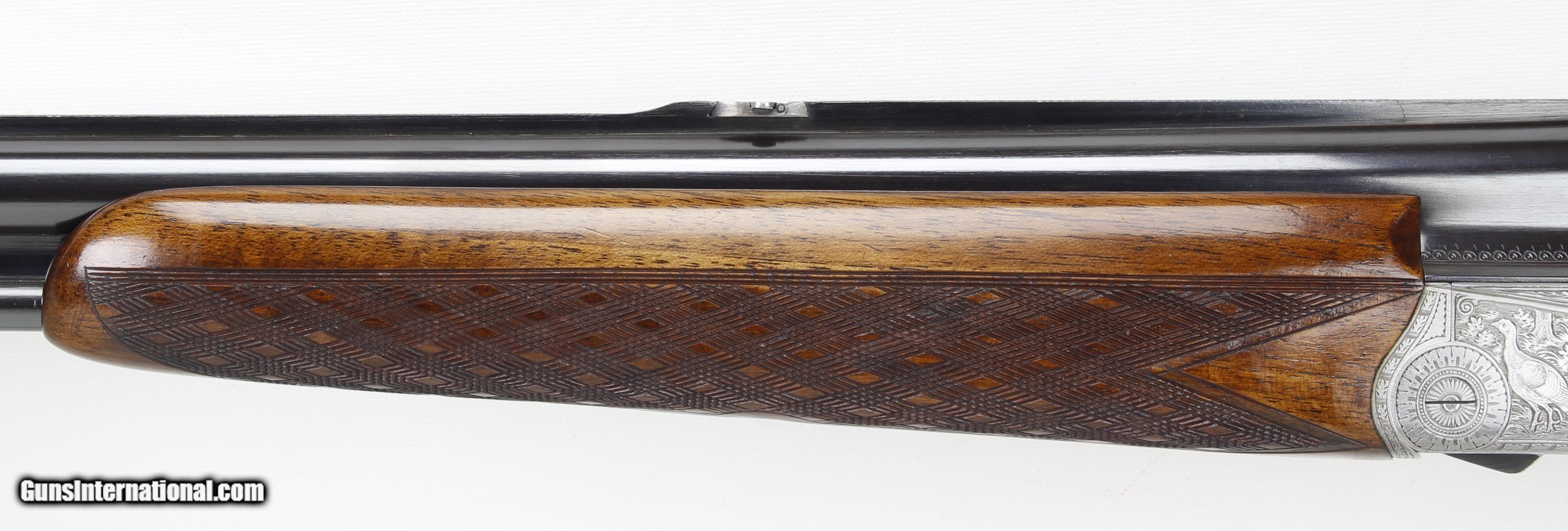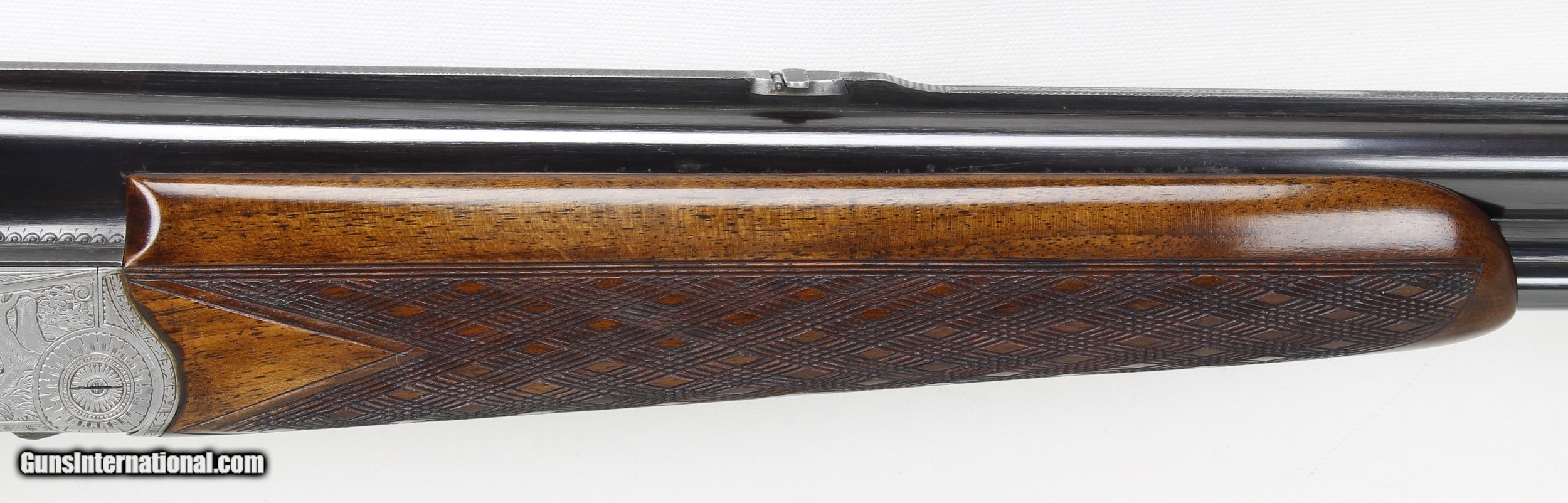Description: Franz Sodia 16Ga./.222 Rem. O/U Engraved Combo Gun.SN #7357. Mfg. in Ferlach, Austria in 1957. LOP 14". Chamber 2 3/4". DAC 1 1/2"- DAH 2 1/4". Buhler-Stahl 24 3/8" barrels with excellent, mirror bright bores on both the rifle and shotgun barrels. Light Modified choke on the 16Ga. barrel.The blued metal finish on the barrel is in very good condition. The receiver is highly engraved with Wildlife scenes. Walnut checkered stock and forend are in fine condition. Double triggers. Flip up rear rifle sight. Plastic buttplate. Sling swivels. A rare find in great condition. Weight 6.6 Lbs. More pictures available upon request. Ships lower 48, W/ Insurance $65.00. SOLD Manufacturer: Franz Sodia Model: Combination Gun Serial Number: 7357 Barrel Length: 24 3/8 Caliber Info: .222 Rem. Chambers: 2 3/4 Condition: VG Metal Condition: VG Wood Condition: VG Bore Condition: Excellent Triggers: Double Gauge Info: 16 LOP: 14 Finish: Blue Weight: 6.6 Lbs Manufacture Date: 1957 Engraving: Wildlife Scenes |