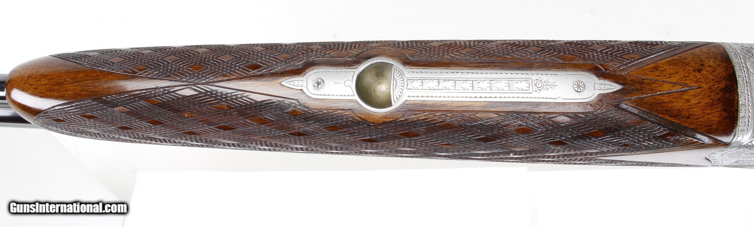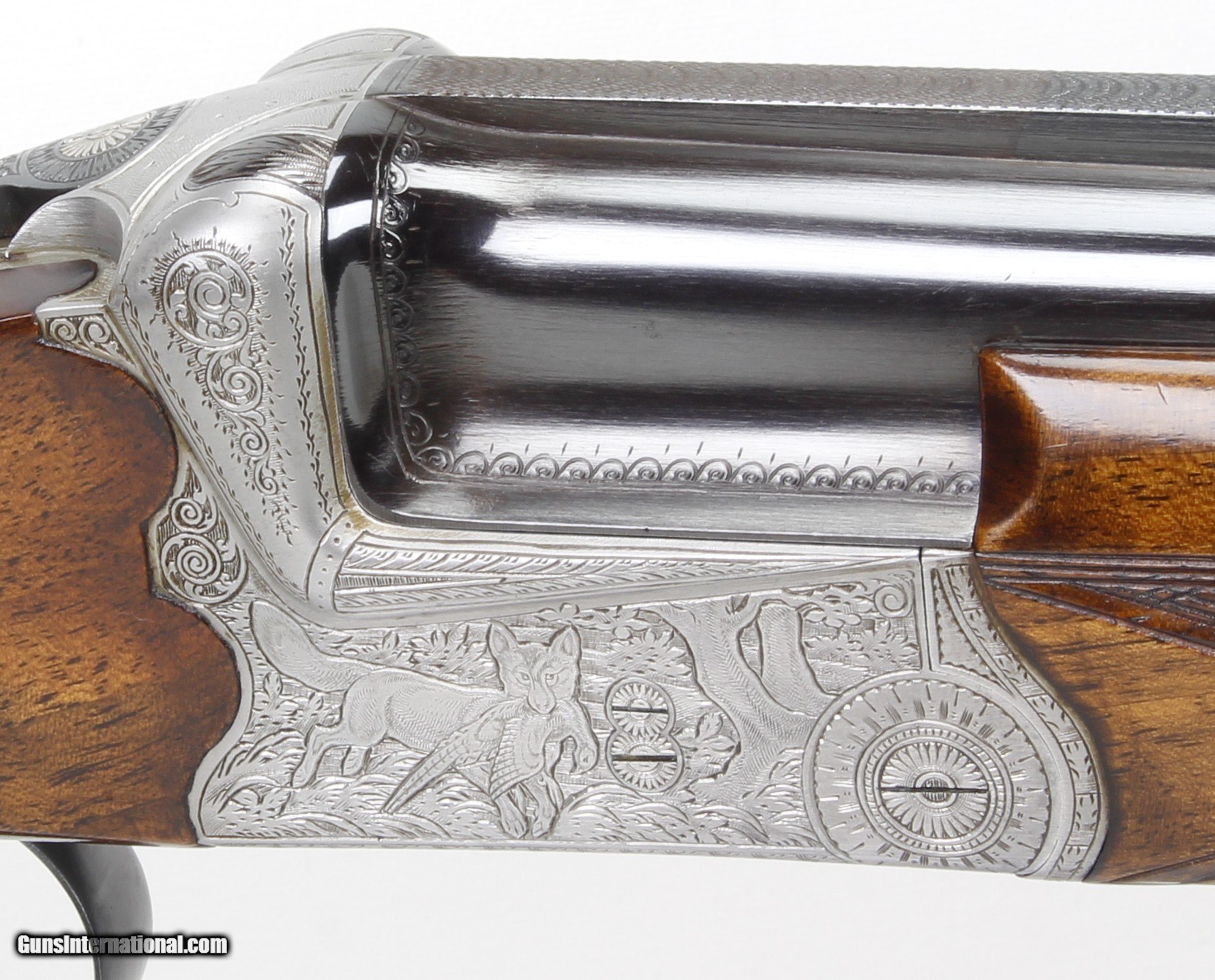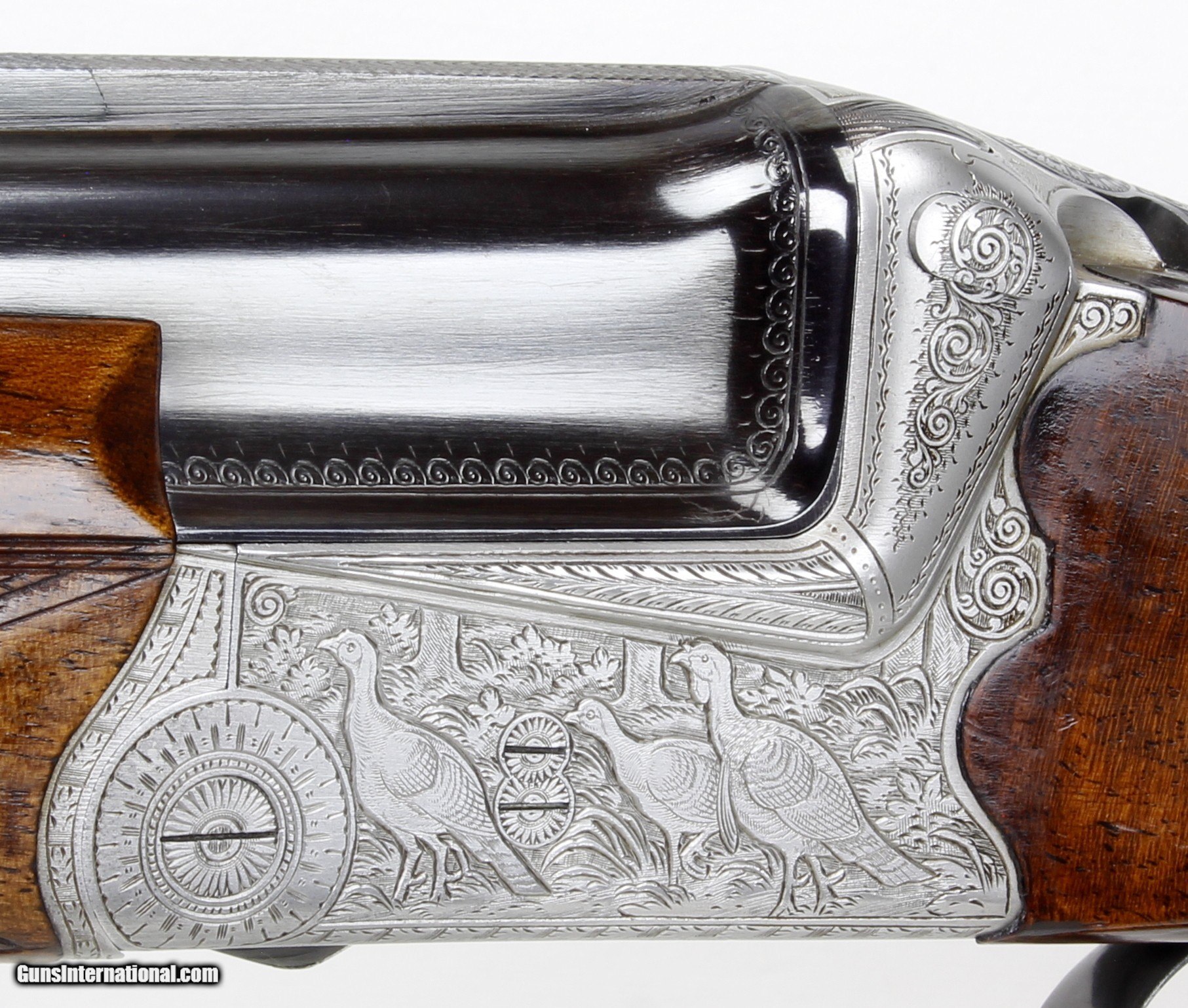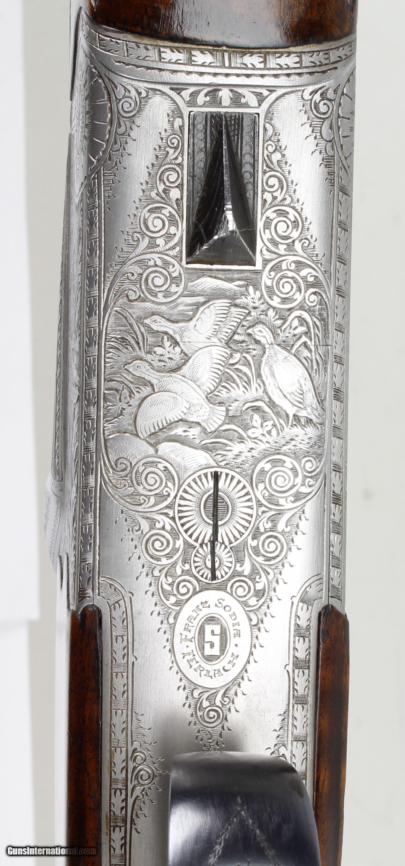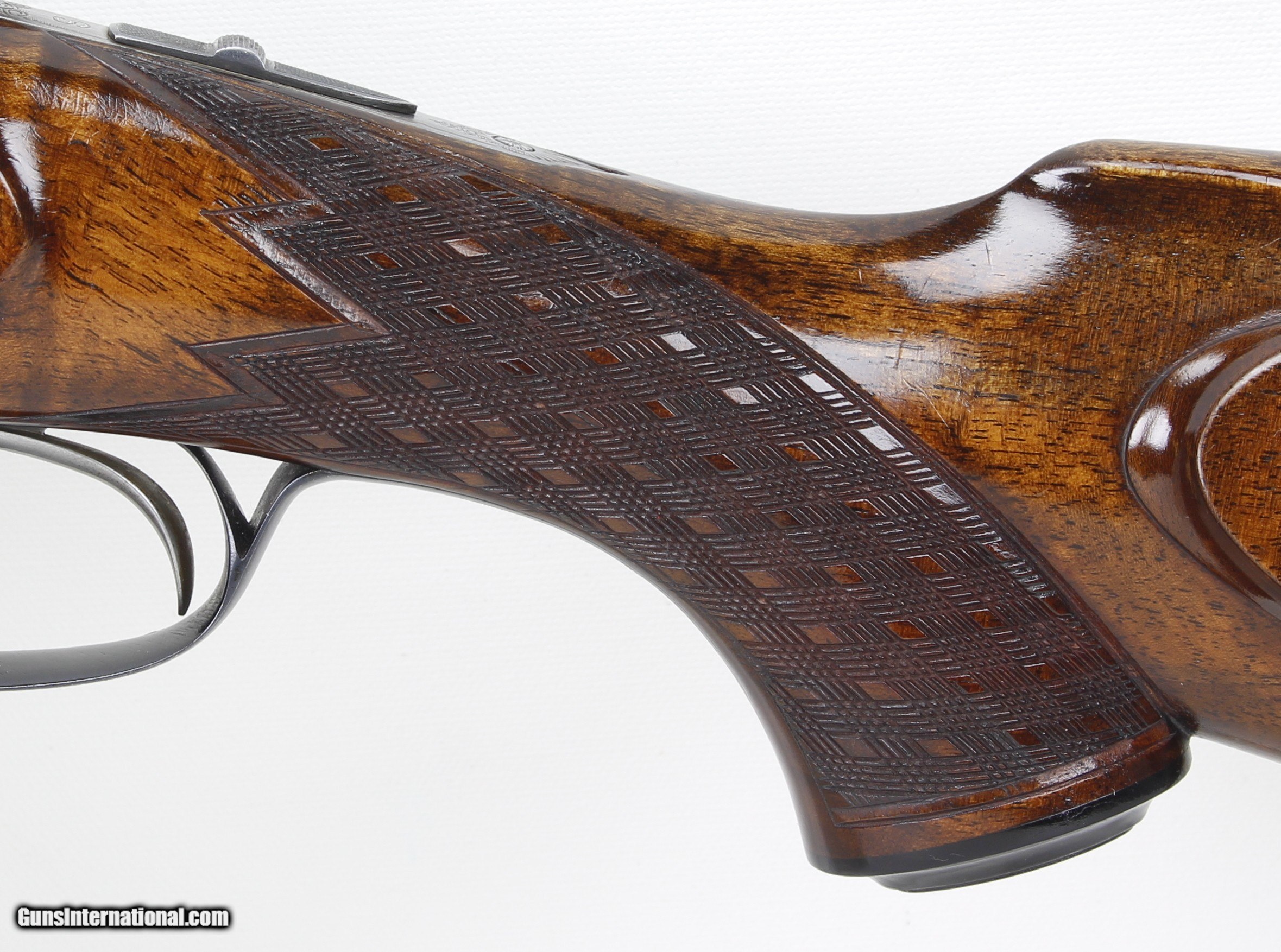 Description: Franz Sodia 16Ga./.222 Rem. O/U Engraved Combo Gun.SN #7357. Mfg. in Ferlach, Austria in 1957. LOP 14". Chamber 2 3/4". DAC 1 1/2"- DAH 2 1/4". Buhler-Stahl 24 3/8" barrels with excellent, mirror bright bores on both the rifle and shotgun barrels. Light Modified choke on the 16Ga. barrel.The blued metal finish on the barrel is in very good condition. The receiver is highly engraved with Wildlife scenes. Walnut checkered stock and forend are in fine condition. Double triggers. Flip up rear rifle sight. Plastic buttplate. Sling swivels. A rare find in great condition. Weight 6.6 Lbs. More pictures available upon request. Ships lower 48, W/ Insurance $65.00. SOLD Manufacturer: Franz Sodia Model: Combination Gun Serial Number: 7357 Barrel Length: 24 3/8 Caliber Info: .222 Rem. Chambers: 2 3/4 Condition: VG Metal Condition: VG Wood Condition: VG Bore Condition: Excellent Triggers: Double Gauge Info: 16 LOP: 14 Finish: Blue Weight: 6.6 Lbs Manufacture Date: 1957 Engraving: Wildlife Scenes |