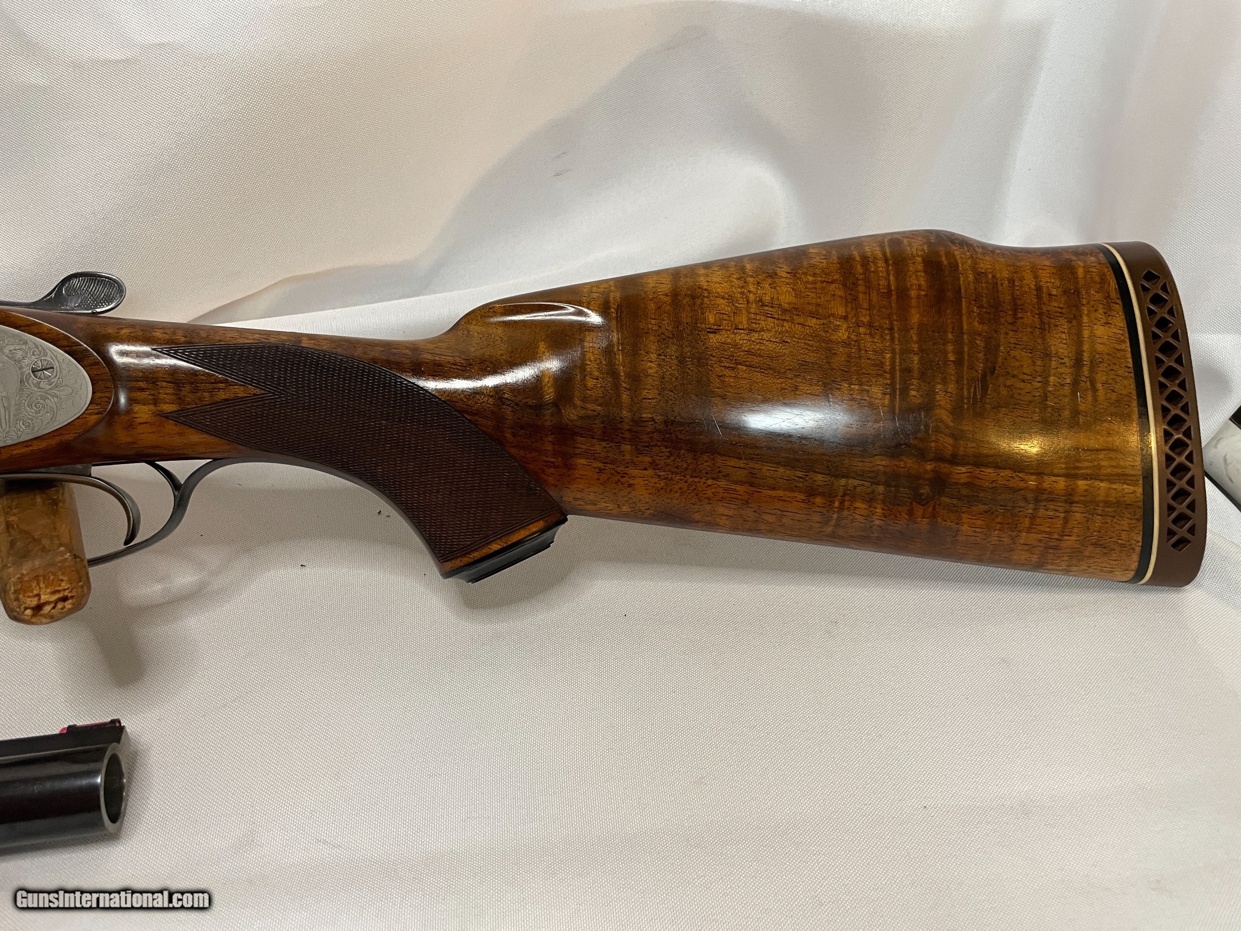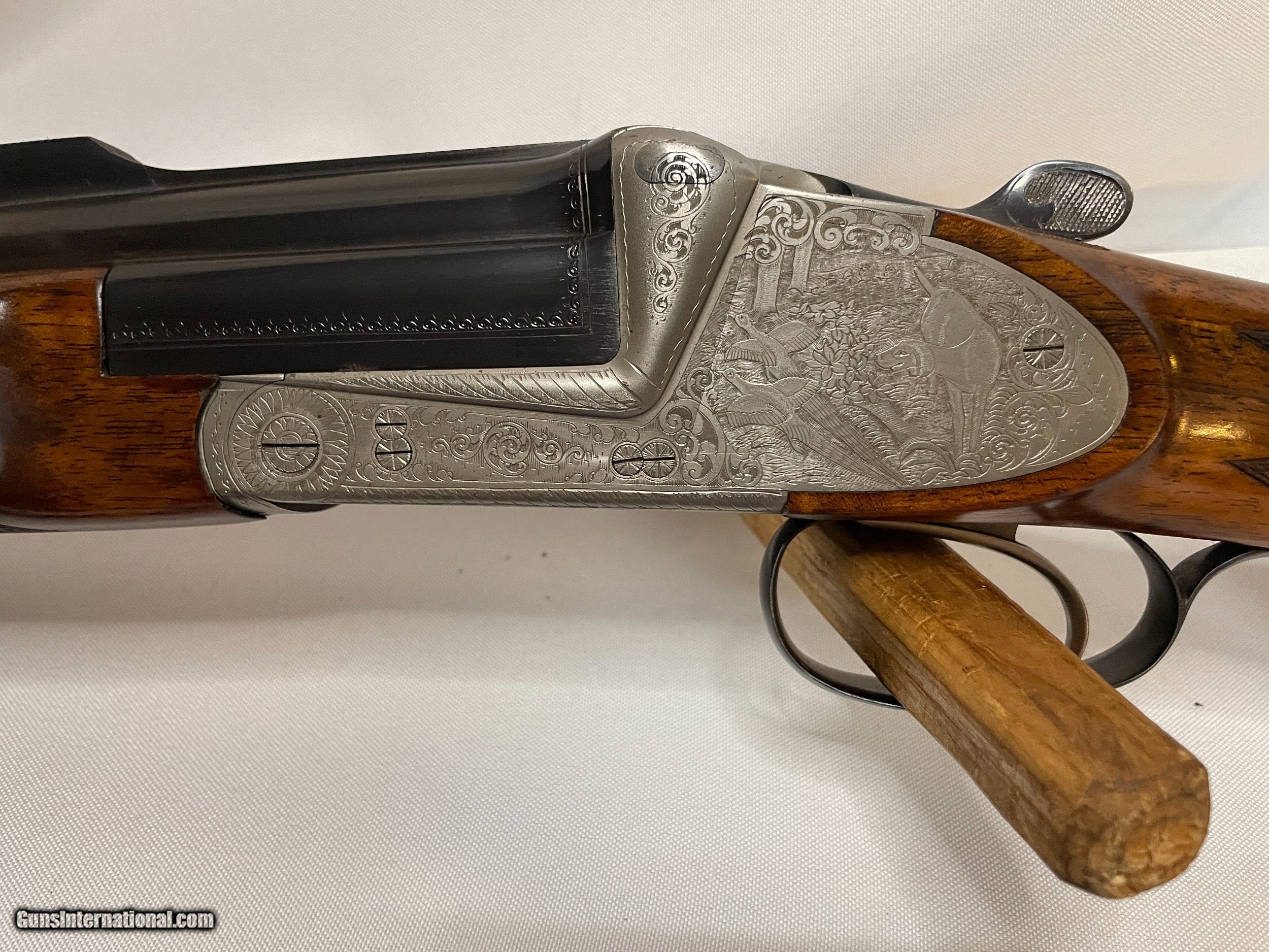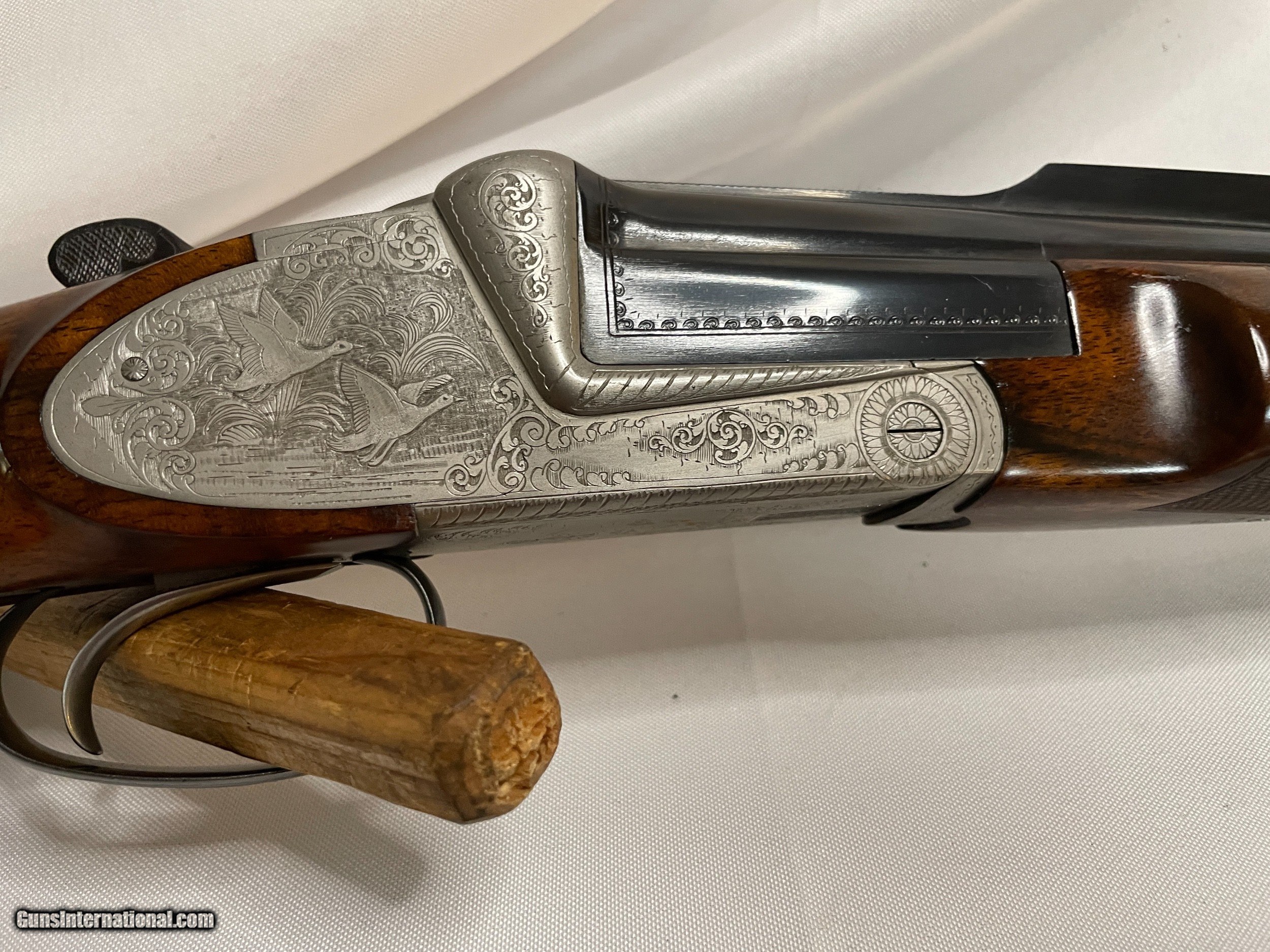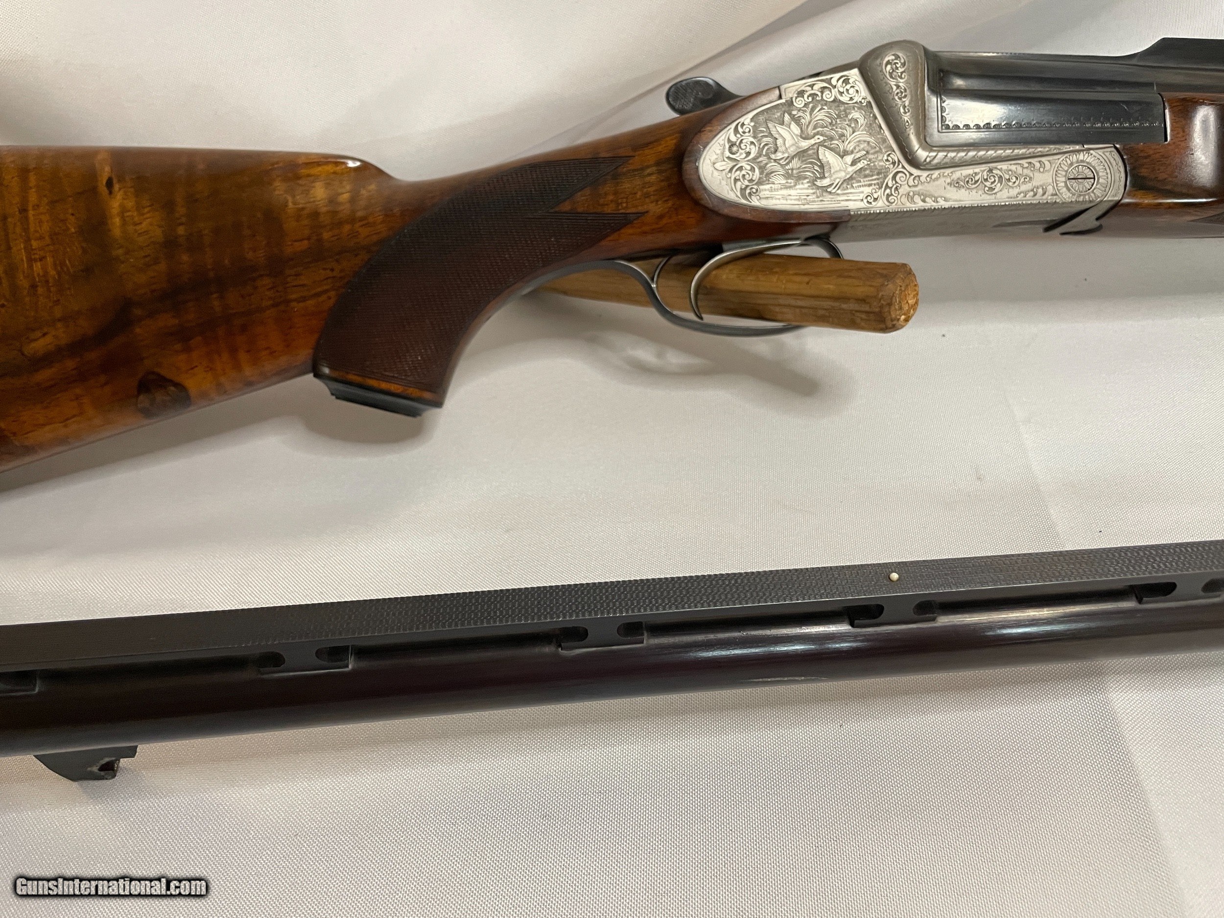 Description: Franz Sodia Ferlach 2 Barrel Cased Trap Set 12 Gauge 2 3/4” Single Trigger Side Plate Box Lock With Game Scene Engraving ( Pheasants and Waterfowl) Deluxe Hand Checkered Walnut Beavertail Forend No Safety 14 1/8” Length of Pull 1 5/8” Monte Carlo Drop Both Barrels are 32” Vent Rib Choked .039 Extra Full Choked .028 Improved / Modified Superb Condition Throughout SOLD Curio/Relic: Yes |