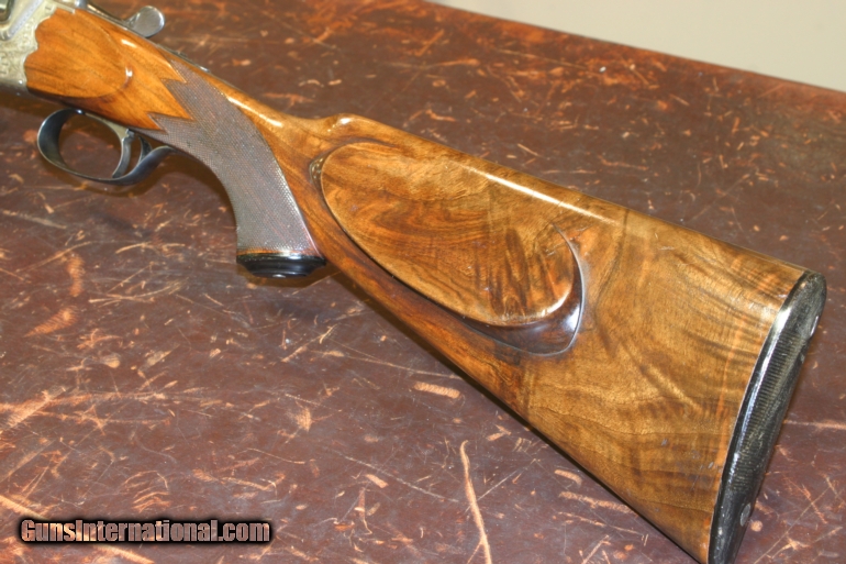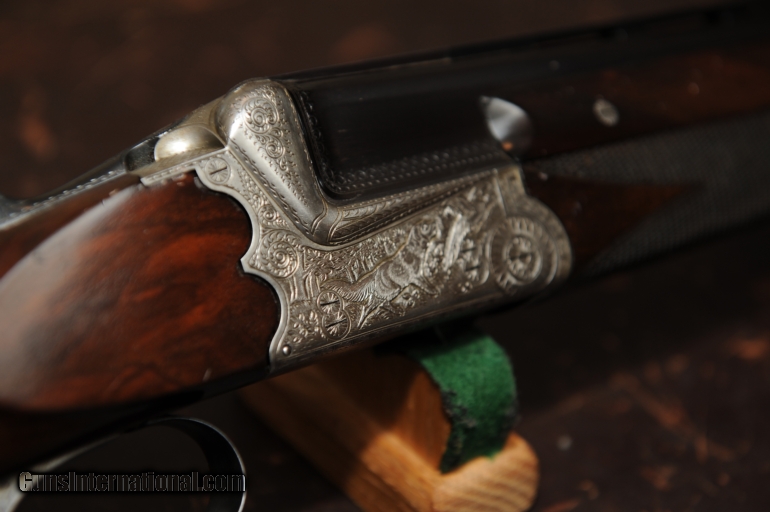 Description: Over/under in 16 gauge, 28" vent rib choked Cyl & I/Cyl ,very detailed engraving of a hunting scene,built in 1956 13 3/4" lop 1-3/4"-2 1/2" 6 3/4LBS "Forever Yours" engraved in gold on rib, cheek piece on left side SOLD Curio/Relic: Yes |