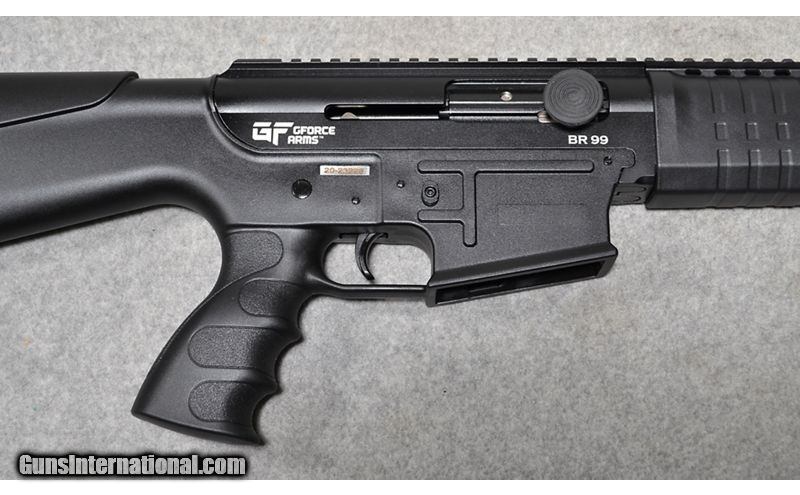 Description: G Force Arms model BR99 12 Gauge with 3" chamber and 20" barrel. Barrel is bright with no dings, dents, rings, or bulges. The shotgun is in excellent overall condition. Includes the factory box and paper work. Two five round magazines, choke tube wrench, five factory choke tubes, one extended choke with break, and four flush choke tubes. 12 Gauge SOLD Chambers: 3" chamber. Metal Condition: Action and barrel are in excellent condition. Wood Condition: Black synthetic stock and fore end are in excellent condition. Bore Condition: "Bright bore with no dings, dents, rings, or bulges. Barrels: 20" barrel. Triggers: Smooth trigger. Stock Dimensions: 14 1/2" LOP Fore End: Factory black synthetic stock and fore end. Butt Pad: Factory black rubber recoil pad. Sights: Carry handle with fully adjustable ghost ring sight and front post. Both removable for optics. Chokes: Factory screw in chokes. Item Location: Mitchell, SD |