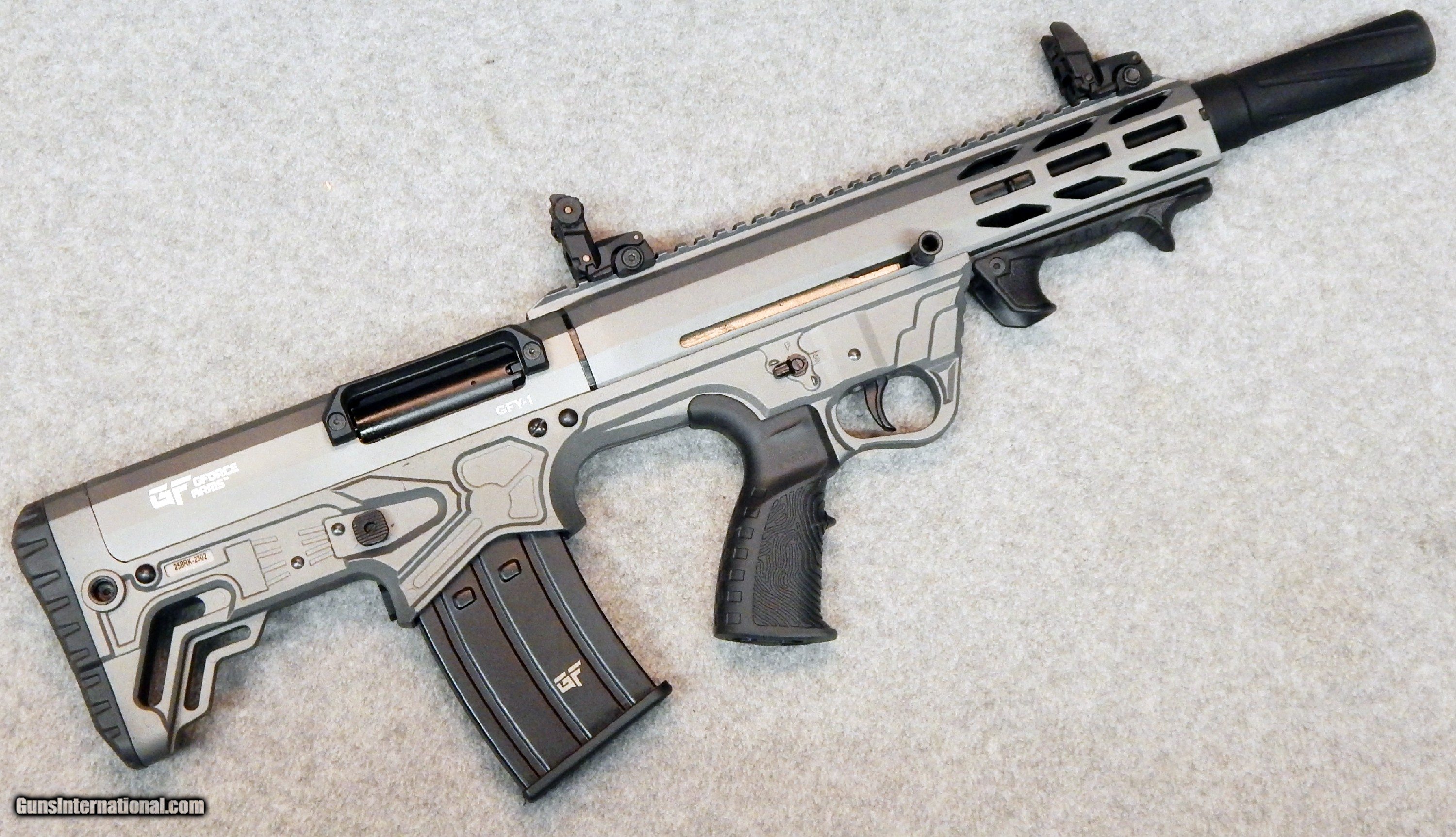 Description: GForce ~ NK-1 ~ Chambered in 12 Gauge. Is a semi-auto bullpup home defense / tactical shotgun. Features an 18.5" barrel outfitted with a barrel shroud with a skeet choke inserted, and is paired with polymer iron sights. Firearm has a gray finish, ambidextrous safety selector, rubberized black pistol grip, and the aluminum forend has a polymer M-Lok handstop affixed. Comes with a single 5 + 1 capacity magazine. 12 Gauge SOLD Chambers: 12 Gauge. Metal Condition: Very good condition. Bore Condition: Good condition. Barrels: 18.5" inches. Triggers: 8 pounds. Stock Dimensions: 15.5" LOP. Fore End: "Aluminum, M-Lok. Butt Pad: Rubber. Weight: 8 pounds Sights: Iron sights. Chokes: Skeet choke. Item Location: Acworth, GA |