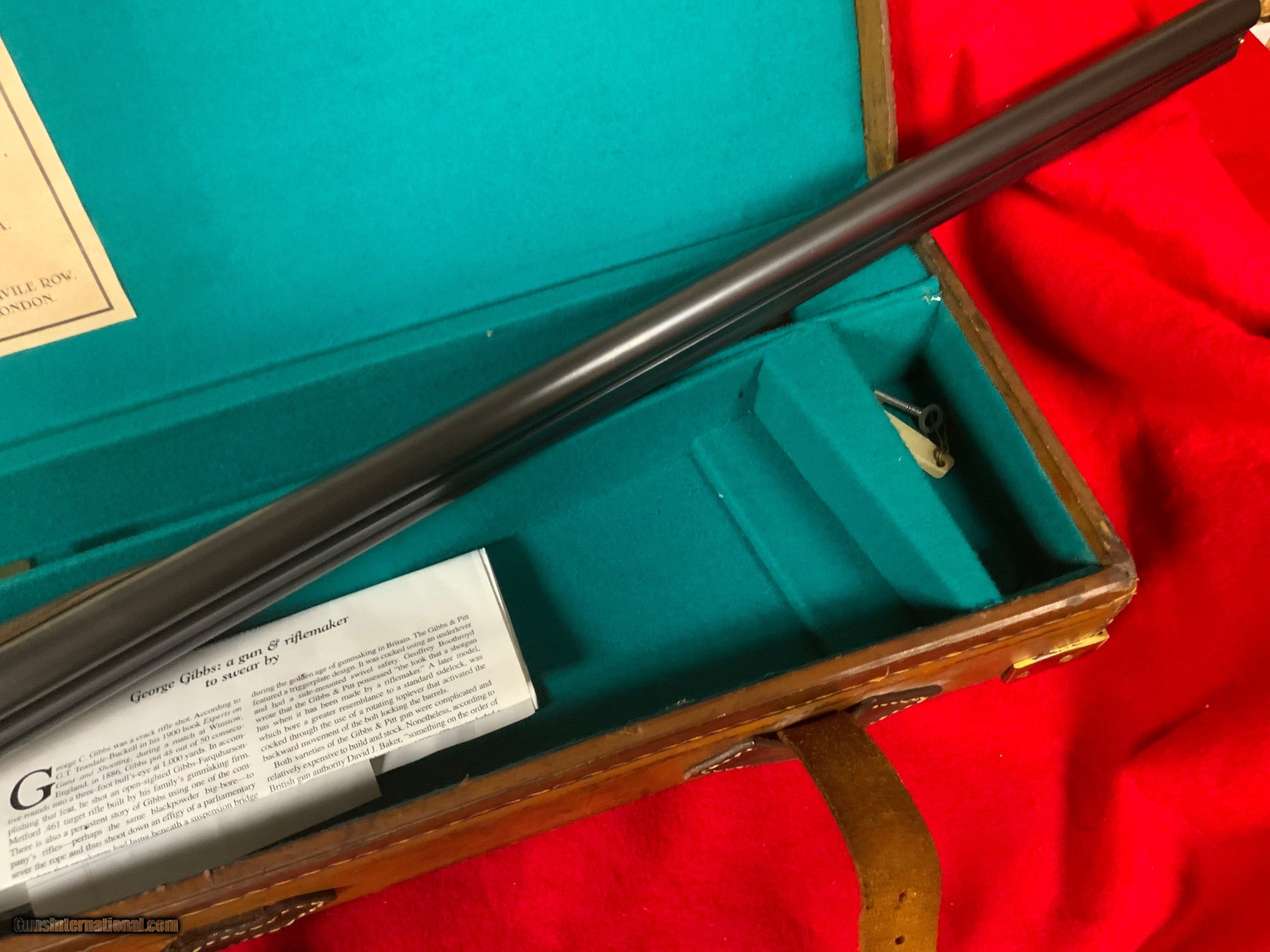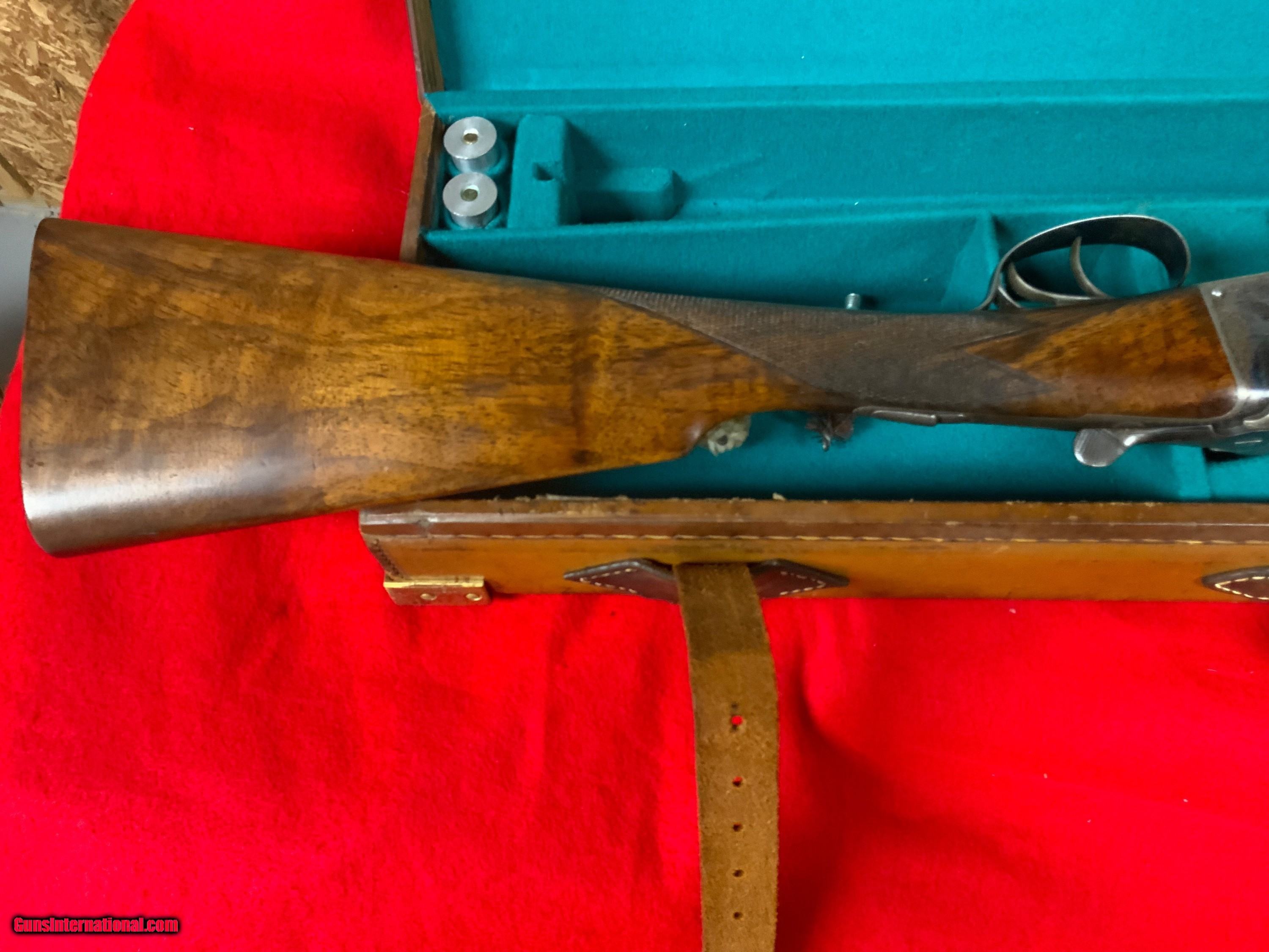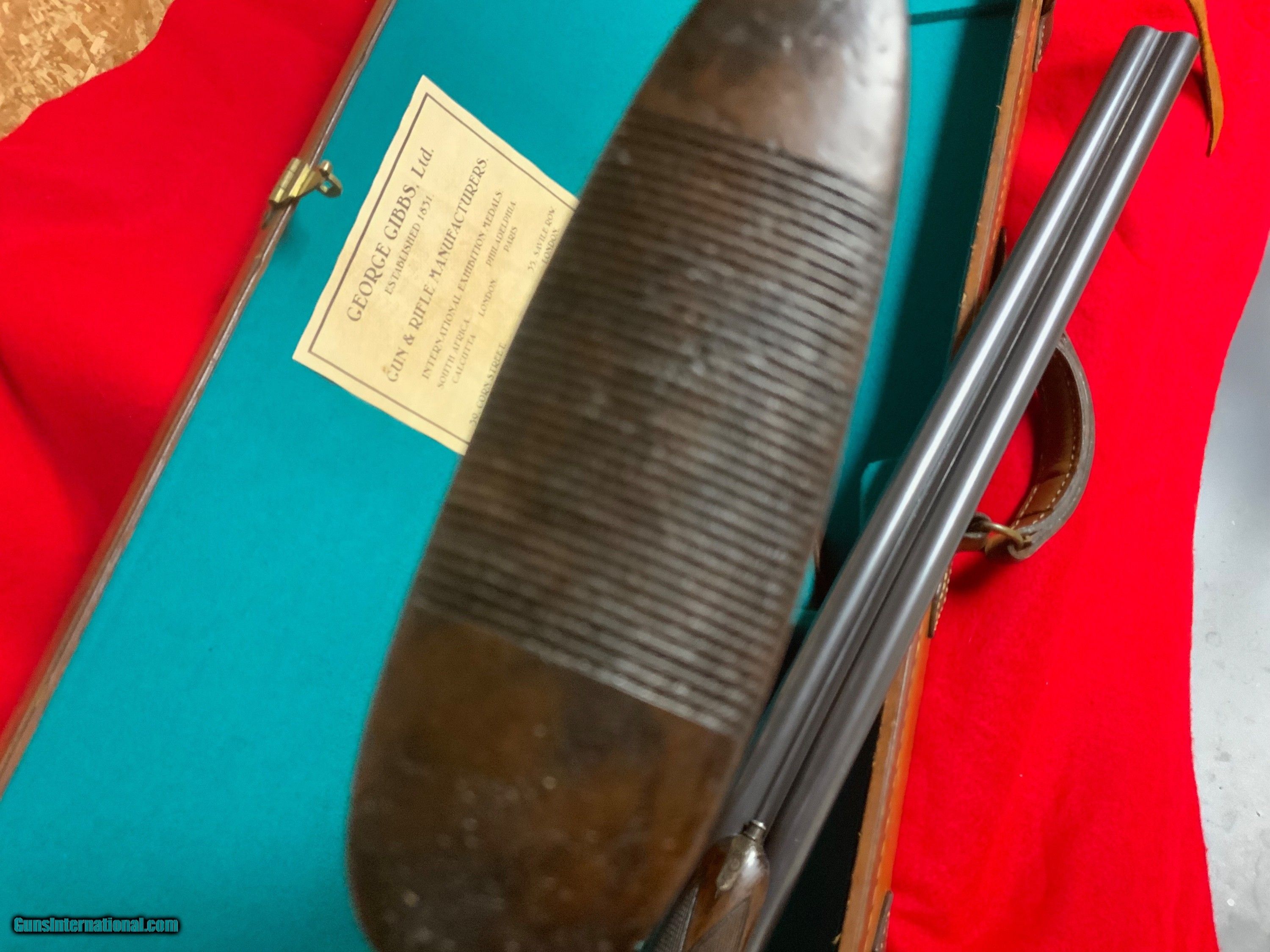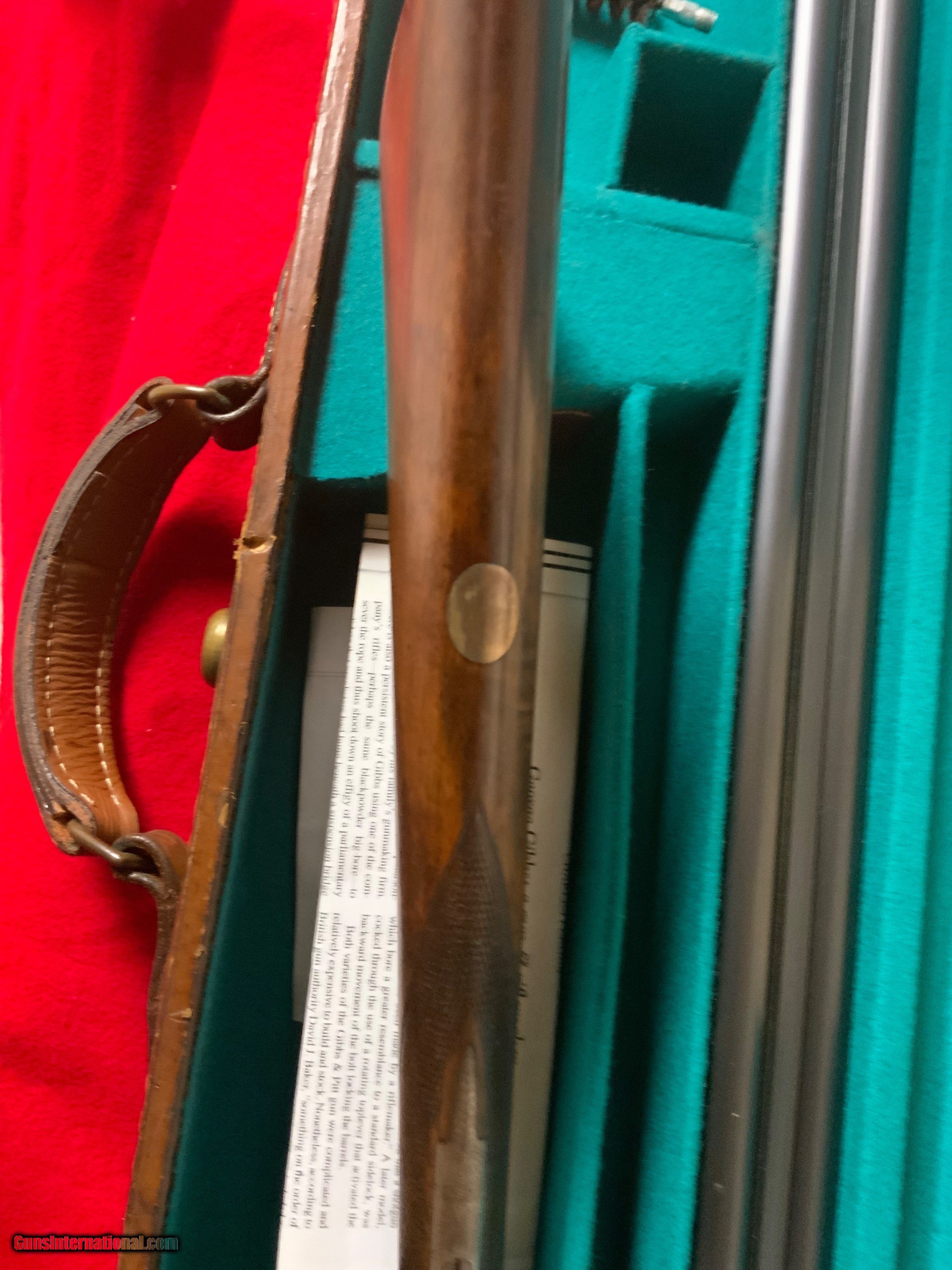 Description: A phenomenal pre war ORIGINAL shotgun. The address Is Bristol & 35 Saville Row, London. Housed in a great leather trunk case with brass corners (see attached picture) The condition is outstanding retaining almost 100% blue on the barrels, case coloring is around 65%, wood oil finish around 96% The chokes are R. Weak IC. L. Full.Instead of chopper-lump barrels, Gibbs uses through-lump barrels a stronger way of putting barrels together. The gun is extremely tight for use, dissambley and assembly. The case has been refined to new condition. Engraving is elegant and about 80% coverage. You will not be disappointed if you purchase this shotgun. Price $2595.00. Buyer pays shipping of $40.00 Curio/Relic: Yes Shotgun Gauge: 12 Gauge Manufacturer: Geo.Gibbs Model: Boxlock SxS Serial Number: 89253 Barrel Length: .29” Chambers: 2 3/4 Ejectors: Yes Condition: 96% Metal Condition: 99% Wood Condition: 96% Bore Condition: 100% Barrels: SxS Barrel Type: Through Lumps Action: Boxlock Triggers: Double Stock: Walnut Fore End: Splinter Butt Pad: Carvedwood LOP: 14 1/2” Rib: Solid Finish: Oil Weight: 6.22lbs. Sights: Open Manufacture Date: 20s or early 30s Choke Left: .734 Choke Right: .730 Engraving: Scroll Case: Brass and leather trunk Item Location: MD Price: $2,595.00 Contact Seller |