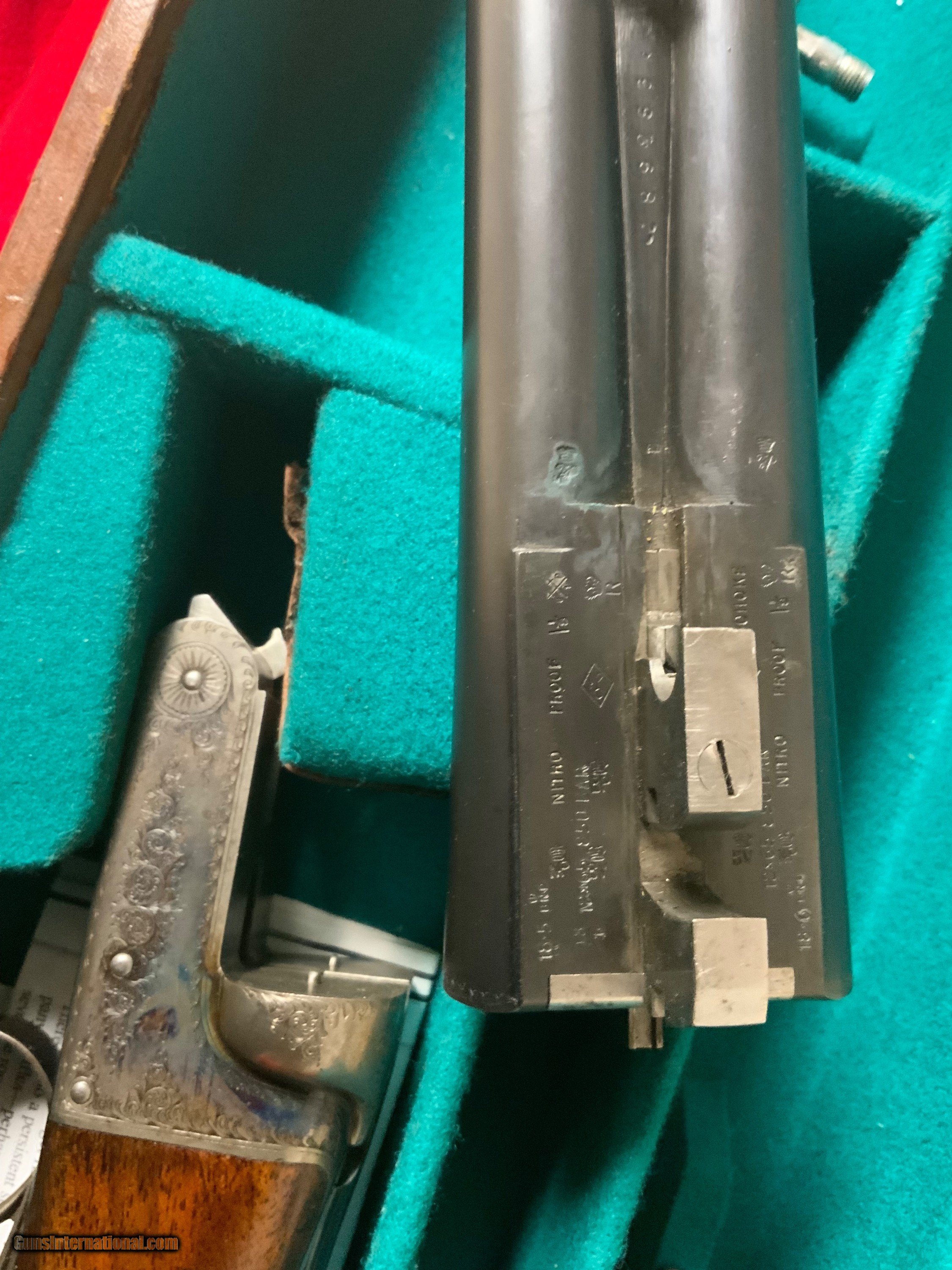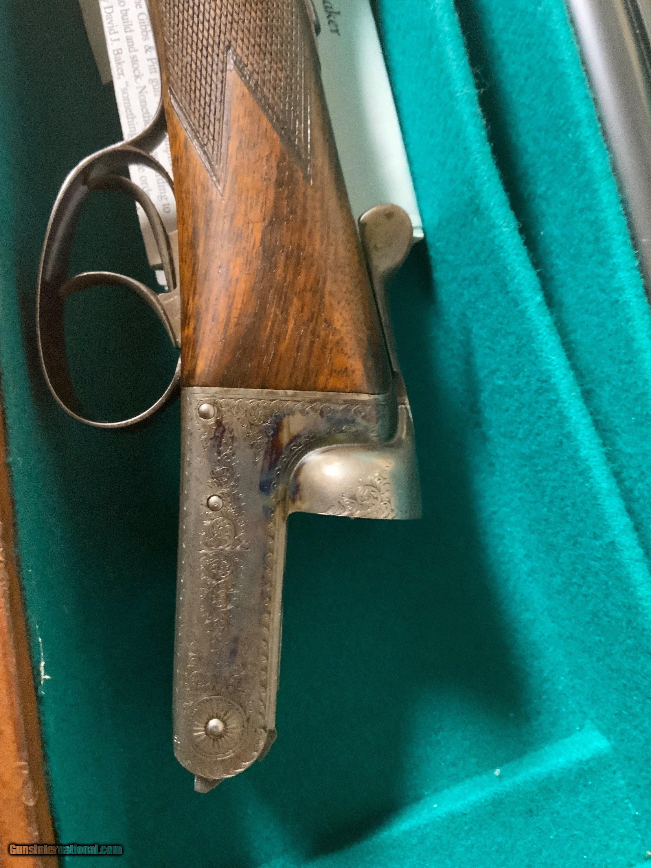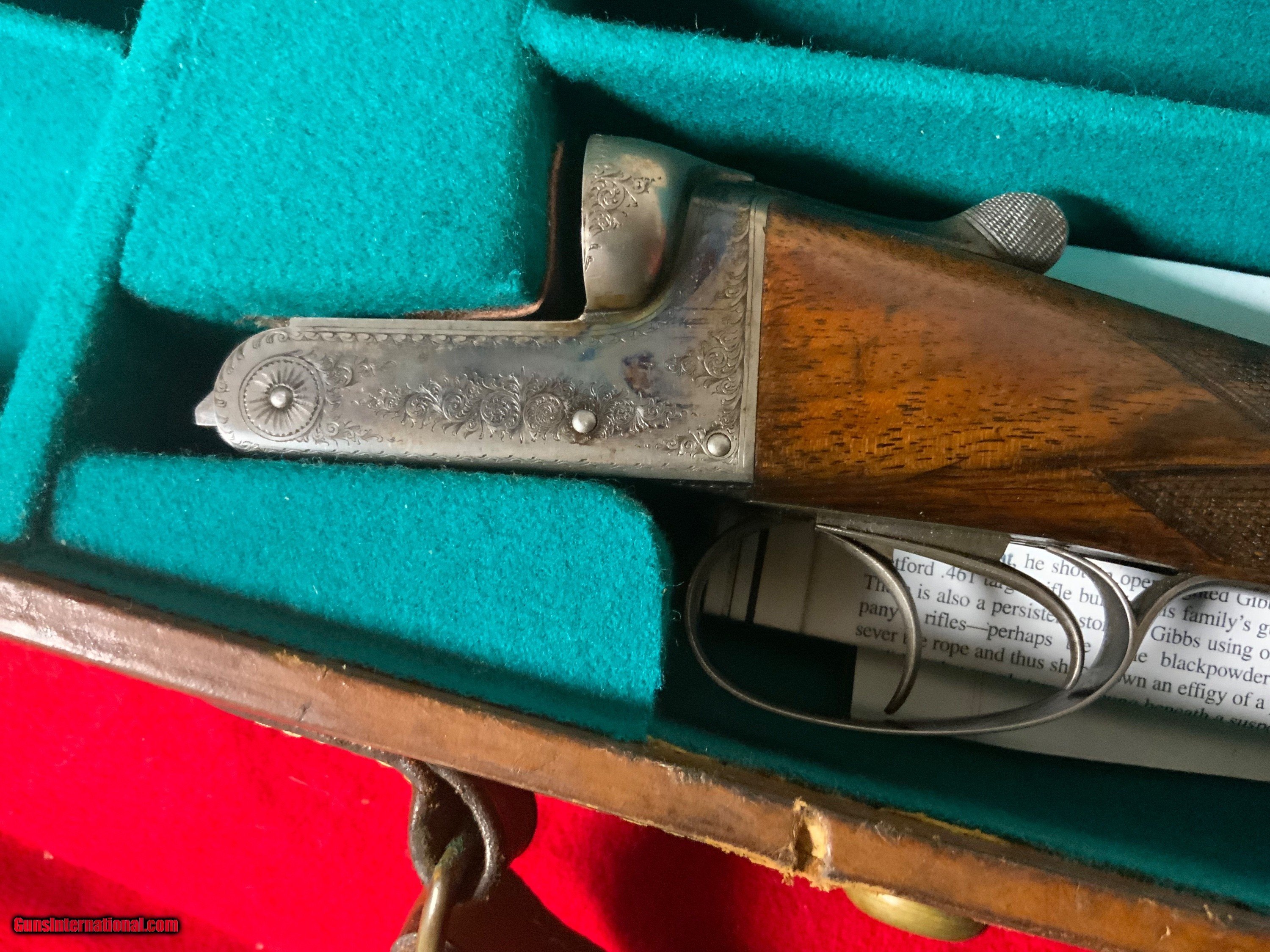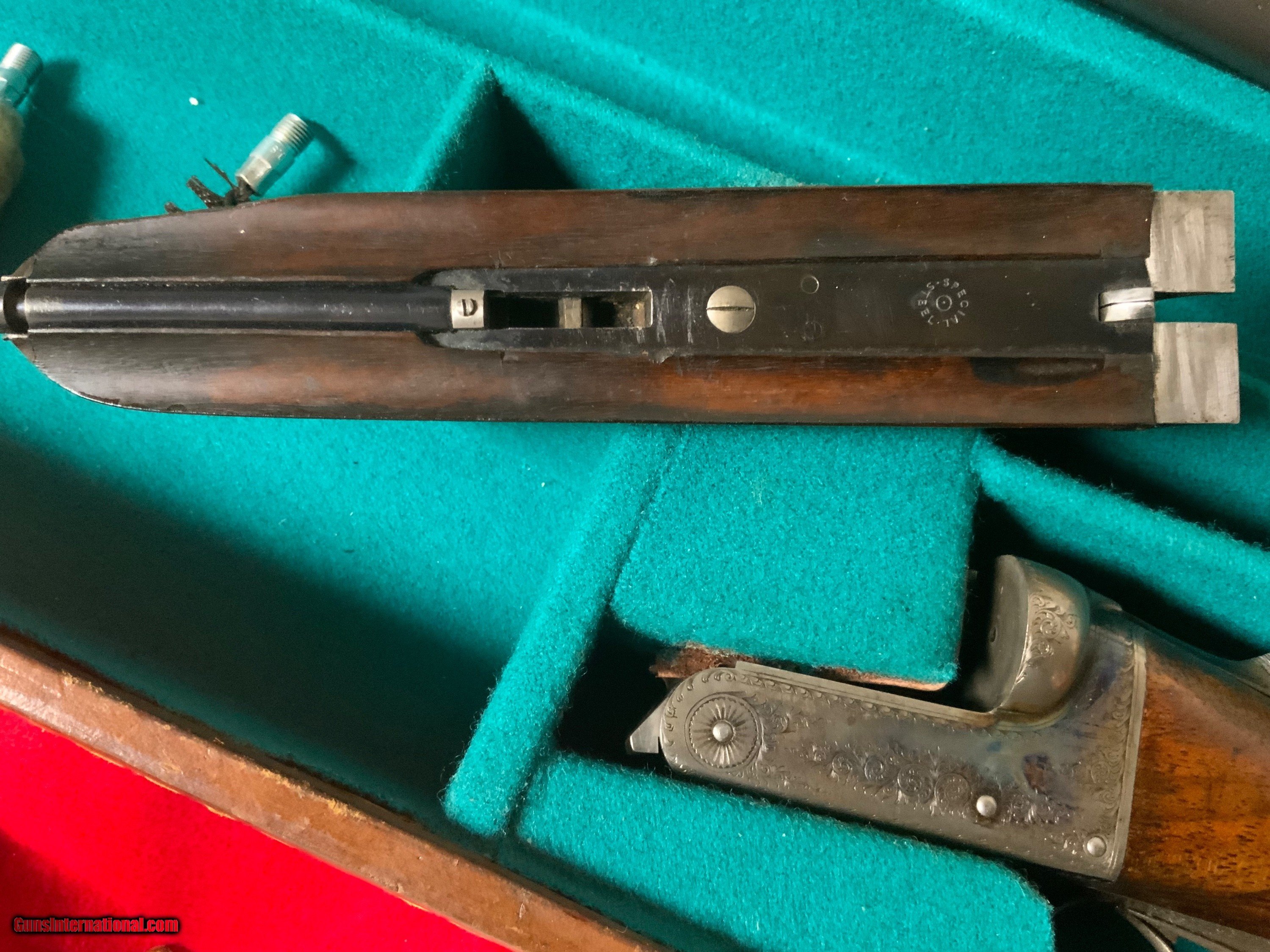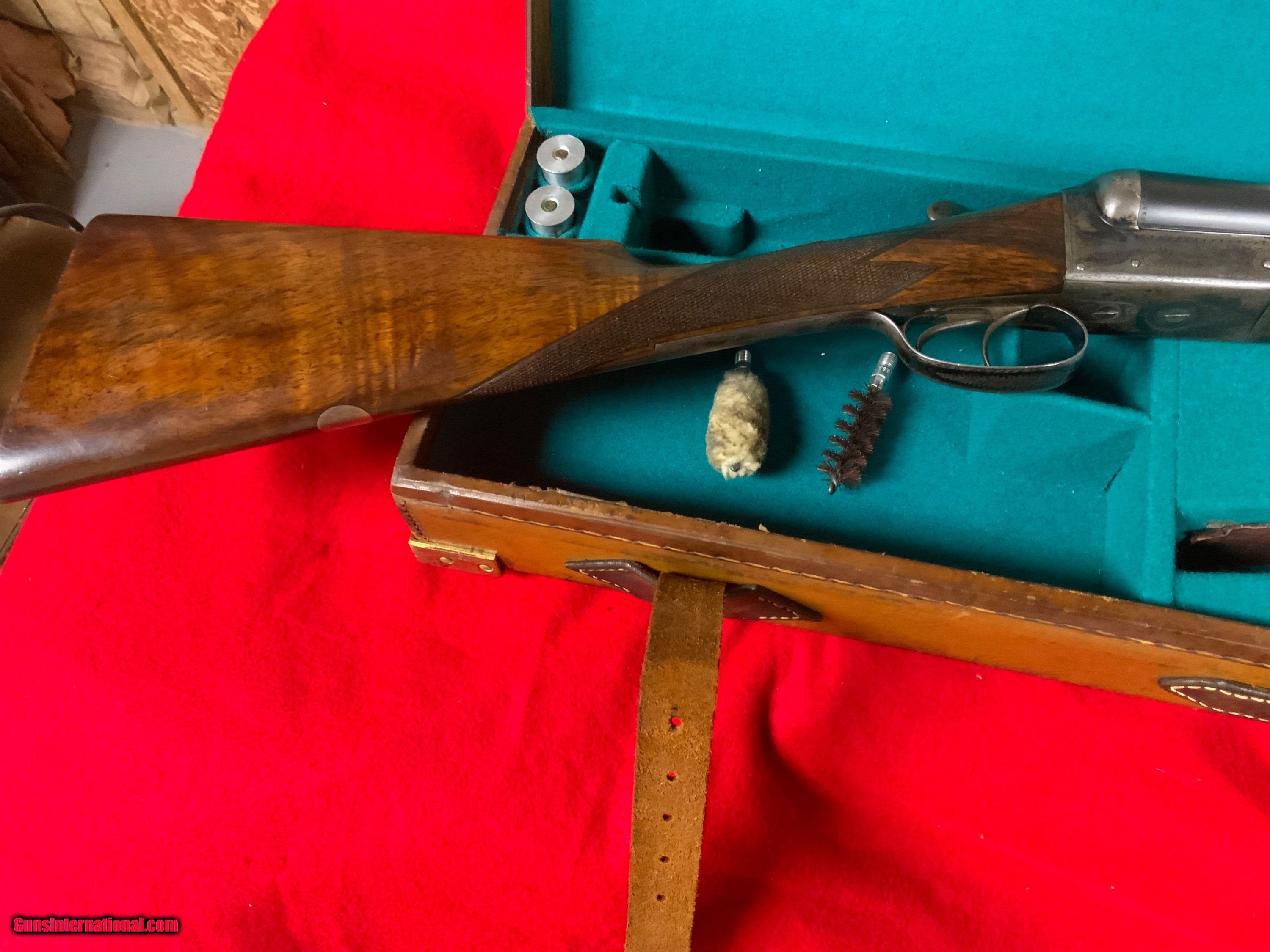 Description: A phenomenal pre war ORIGINAL shotgun. The address Is Bristol & 35 Saville Row, London. Housed in a great leather trunk case with brass corners (see attached picture) The condition is outstanding retaining almost 100% blue on the barrels, case coloring is around 65%, wood oil finish around 96% The chokes are R. Weak IC. L. Full.Instead of chopper-lump barrels, Gibbs uses through-lump barrels a stronger way of putting barrels together. The gun is extremely tight for use, dissambley and assembly. The case has been refined to new condition. Engraving is elegant and about 80% coverage. You will not be disappointed if you purchase this shotgun. Price $2595.00. Buyer pays shipping of $40.00 Curio/Relic: Yes Shotgun Gauge: 12 Gauge Manufacturer: Geo.Gibbs Model: Boxlock SxS Serial Number: 89253 Barrel Length: .29” Chambers: 2 3/4 Ejectors: Yes Condition: 96% Metal Condition: 99% Wood Condition: 96% Bore Condition: 100% Barrels: SxS Barrel Type: Through Lumps Action: Boxlock Triggers: Double Stock: Walnut Fore End: Splinter Butt Pad: Carvedwood LOP: 14 1/2” Rib: Solid Finish: Oil Weight: 6.22lbs. Sights: Open Manufacture Date: 20s or early 30s Choke Left: .734 Choke Right: .730 Engraving: Scroll Case: Brass and leather trunk Item Location: MD Price: $2,595.00 Contact Seller |