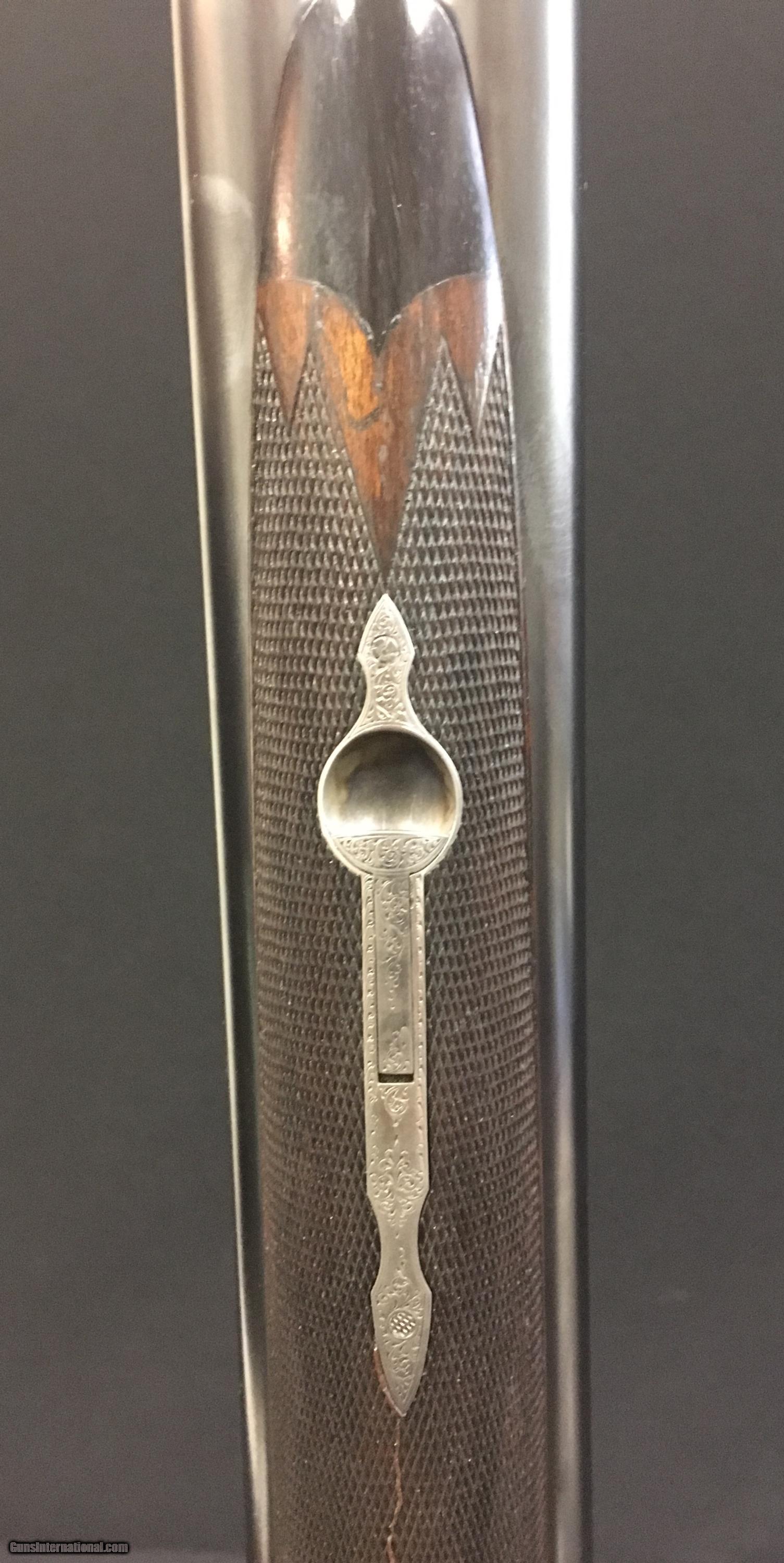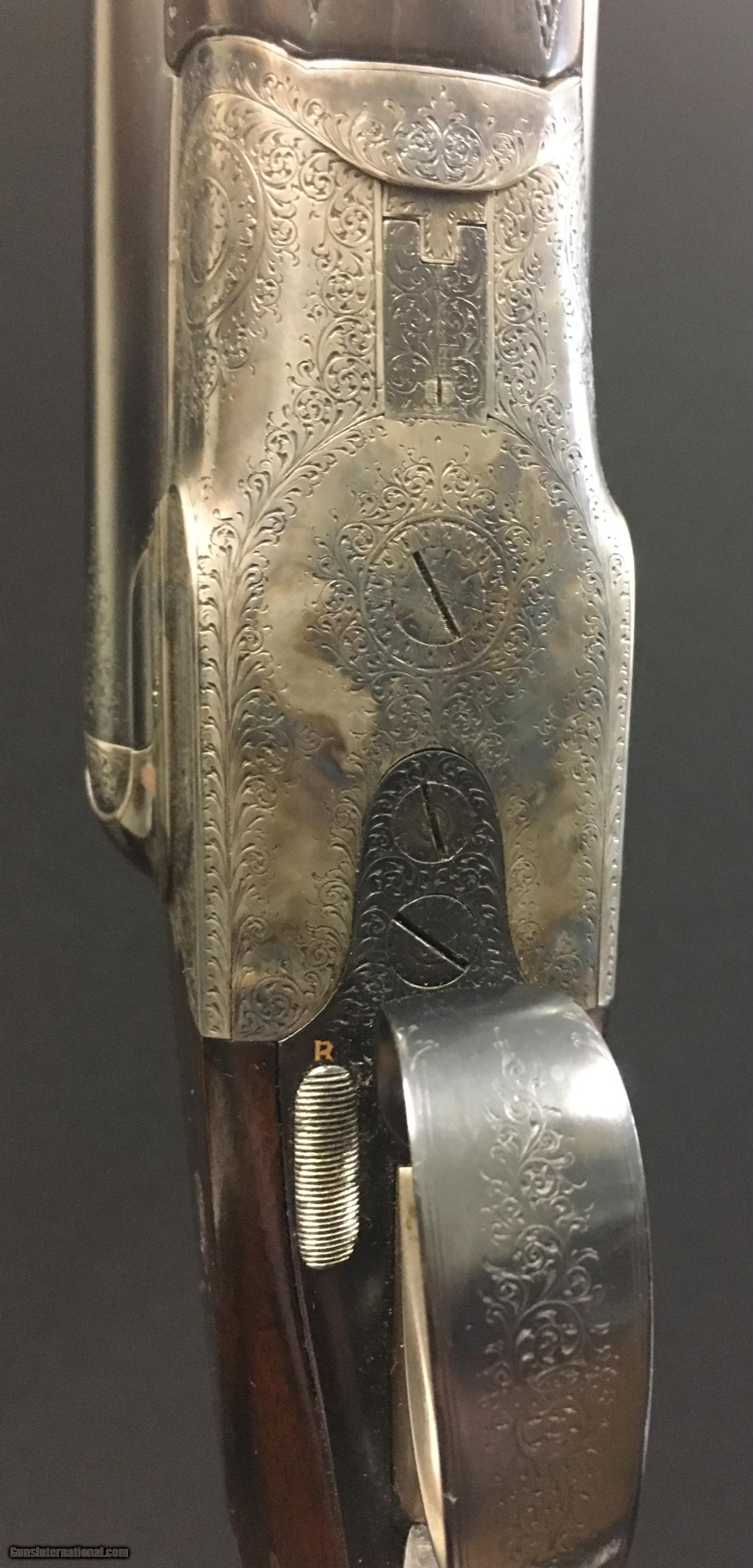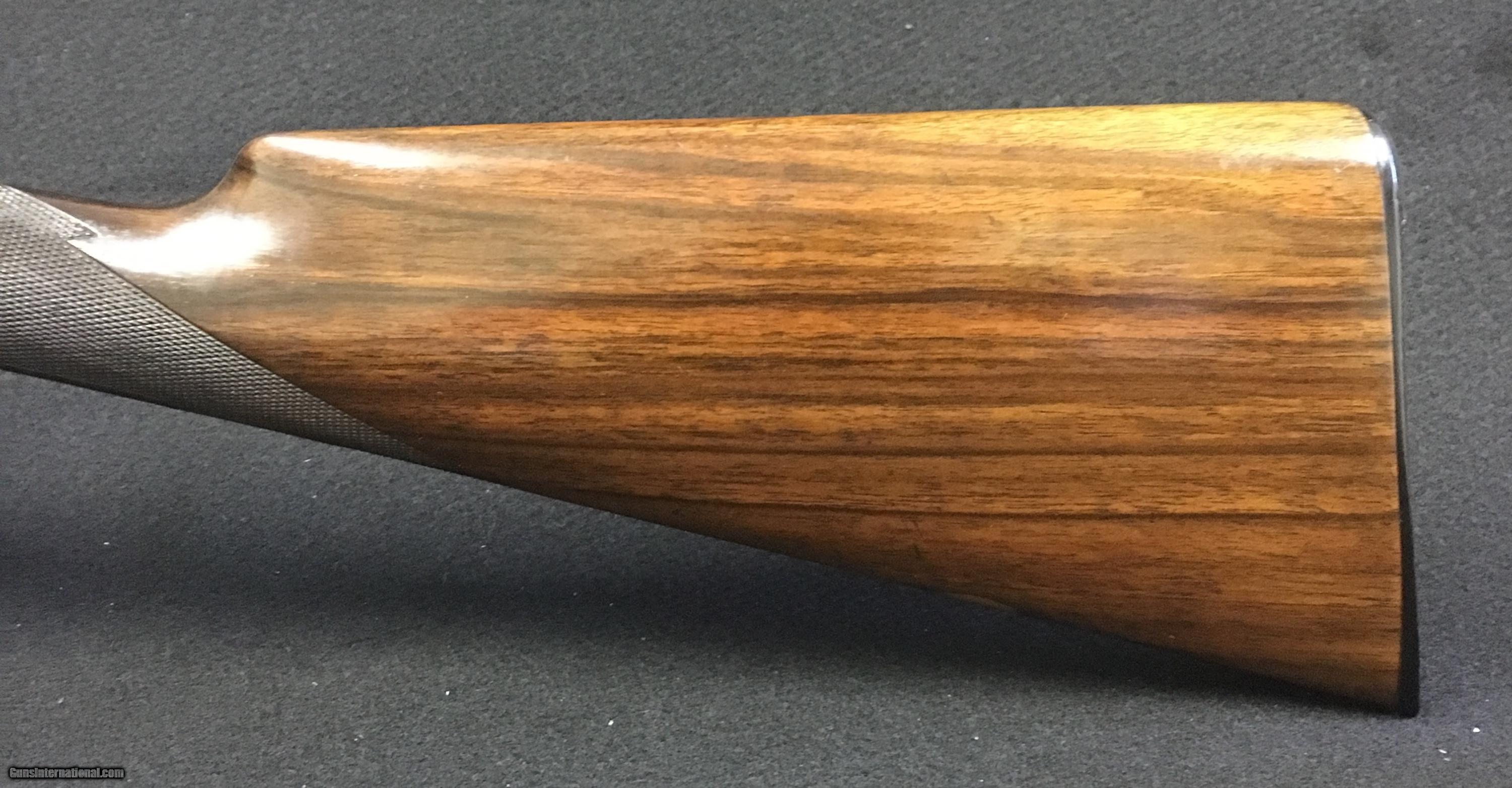 Description: Fabulous near new condition WW Greener FH70 Grade Game gun, Serial Number 58xxx, 12 bore Nitro Proofed for 1 1/4oz loads. Ejectors. 28" steel barrels choked Mod/Full with standard game rib and scroll chevron engraved breaches. Aciton retains most all of it's vivid case color and features beautiful and diminutive acanthus scroll engraving throughout. Single selective trigger. Iconic Greener side safety, non-automatic. Scroll engraved triggerguard with " GRADE FH70" engraved on tail end. Pleasing black streaked straight grain English walnut stock with straight grip and splinter forend with horn tip. Checkered horn buttplate. Beautiful mahogany retrofit case relined in green felt. Weight: 6lbs6oz. Condition: Gun is in excellent original condition. Tight action. Solid barrels and clean bright bores. Scant and faint and few handling marks. Ejectors strong. Stock: LOP 14 1/4", DAC 1 3/8" - DAH 2 1/4" Barrels: Min Wall Thickness: L:030", R:.031"h About Us Foxtrot Sporting is a fair and honest purveyor and appraiser of quality firearms, knives, sporting collectibles, and antiques. I, Francis Lombardi, am the founder and owner of the company and have been in the trade for over 32 years. All items that we sell are guaranteed to be fairly represented and come with inspection privileges to insure your absolute satisfaction. Foxtrot Sporting holds a valid Type 08 FFL (Importer) and is a corporation in good standing in New York state. . Experience and industry contacts are the key to our success. I am the former department head of The James D. Julia Company based in Fairfield, Maine – an internationally recognized and leading house for fine, rare, and historic firearms. During my tenure, I was able to see, handle, and assess more fine guns than most would in a lifetime of collecting or dealing. I have been a exhibitor/attendee at the following shows of significance, and many more: Las Vegas Antique Arms Show, SHOT Show, IWA Nuremberg, Safari Club International, NRA Annual convention, Louisville National Gun Day, Southern Side- by-Side Classic. Finder's Fees We are in a competitive business and understand that sometimes an incentive can make all the difference between us versus our competitor getting the collection of goods. We pay Finder’s Fees and fee level will depend upon a few factors: a.) Size and value of collection b.) Your influence in our acquiring/consignment/handling of the collection c.) Terms of service established with client. Importation of Firearms As a Type 08 FFL license holder, Foxtrot can legally and efficiently import your guns into the USA. We offer discreet concierge style service when helping our clients import. We are registered with US Customs and have a valid continuous surety bond in-place. The process is relatively simple and typically takes about 3 to 6 weeks to get the BATF Form 6 Import permit issued. We have contacts throughout the world that can assist with the necessary export permits and freight logistics. Our rates are competitive and will depend upon country of export, type of firearm, and quantity of items. Please call to discuss. Buyer's Agent Services Foxtrot offers Buyer’s agent services to our clients to assist them in their acquisitions where an uncompromised, honest, and experienced assessment can be communicated. This service is commonly retained when a client is interested in a gun at , understands that an house has a fiduciary duty to the seller, and where a third-party assessment can mean the difference between a great buy or a significant loss. From experience in the trade, trust us when we tell you that the small fee paid for this service is well worth the investment. Please call to discuss. SOLD Curio/Relic: Yes Manufacturer: WW GREENER Model: FH70 Bore: 12 Ejectors: YES Barrels: 28 Barrel Type: STEEL Action: BOXLOCK Triggers: SST Case: Wood Mahogany Proof:Nitro: Yes |