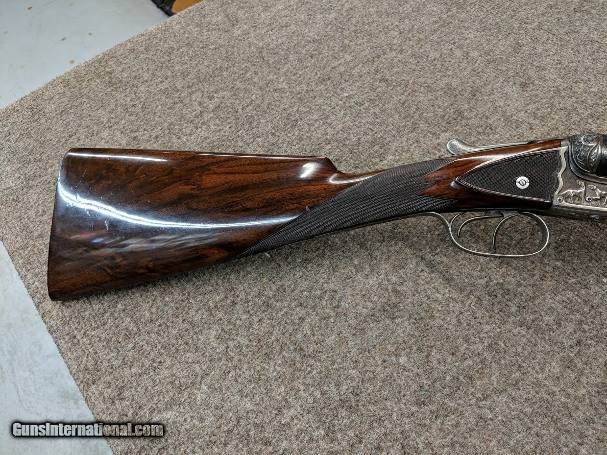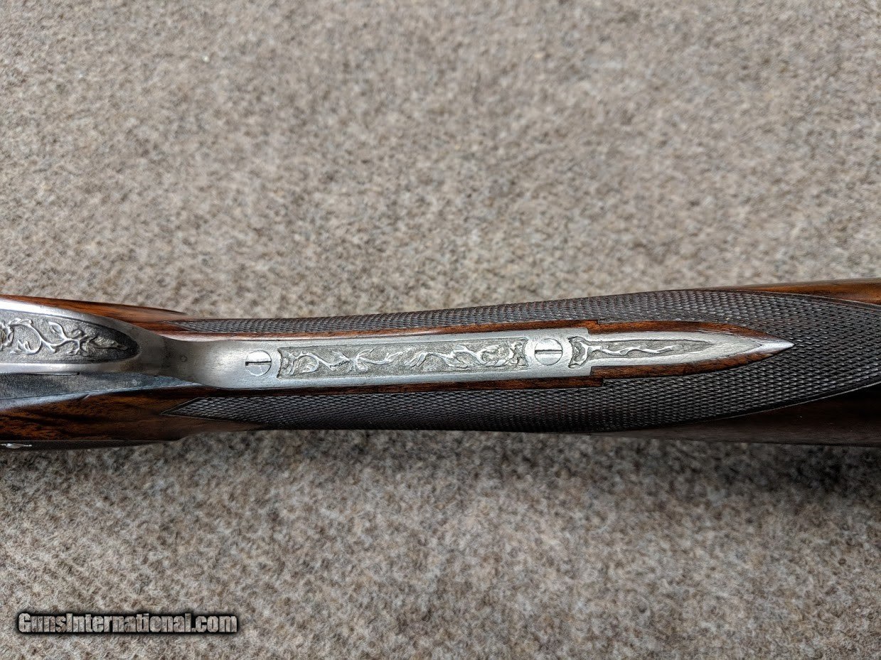 Description: W. W. Greener 12 gauge shotgun with deep relief engraving, excellent condition. This gun has 30" barrel, extractors, with 2 7/8" chambers. Chokes are Left = .037" and Right = .014". Weight is 7 pounds 1 ounce. Length of pull is 13 11/16" over a checkered butt. Drop at comb 1 3/8"; at heel 2 3/4". Cast appears neutral. Straight grip and splinter forend. Nicely figured stock. The rib is a level file cut rib with two beads. Greener side safety and cocking indicator. Triple lock action. Double triggers. Metal and stock finish are 99%+. The checkering is quite fine, probably 26 lpi or less. Please examine the photos as to condition. No international sales. Thanks for your consideration. SOLD Manufacturer: W. W. Greender Gauge Info: 12 Stock Comb: 1 3/8 Stock Heel: 2 3/4 Stock Cast: nuetral LOP: 13 11/16 Rib: level file cut Weight: 7 lbs 1 oz Sights: 2 beads Choke Left: .037 Choke Right: .014 Engraving: deep relief Proof:Nitro: 2 7/8 Minimum Wall Thickness Left: .035 Minimum Wall Thickness Right: .035 |